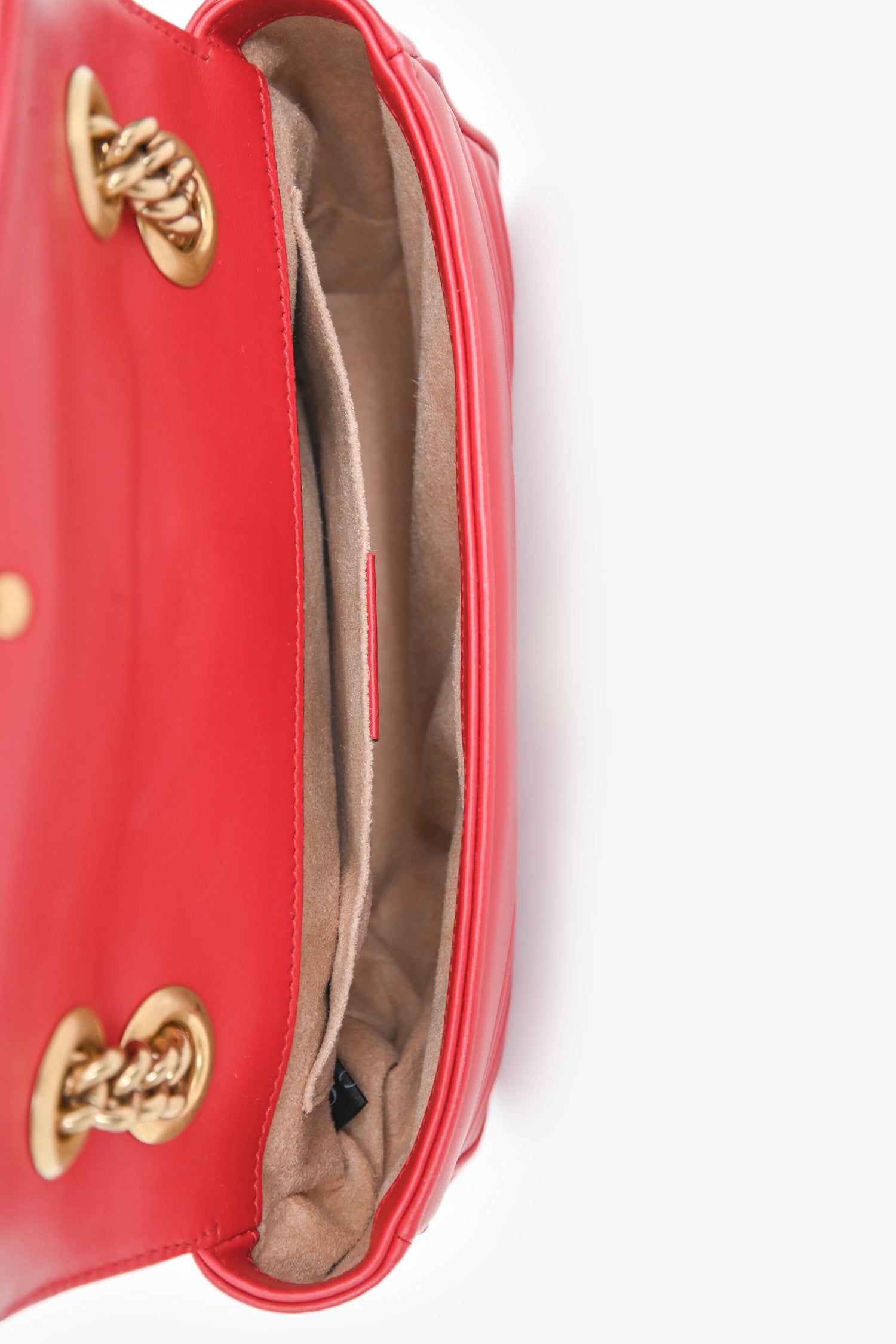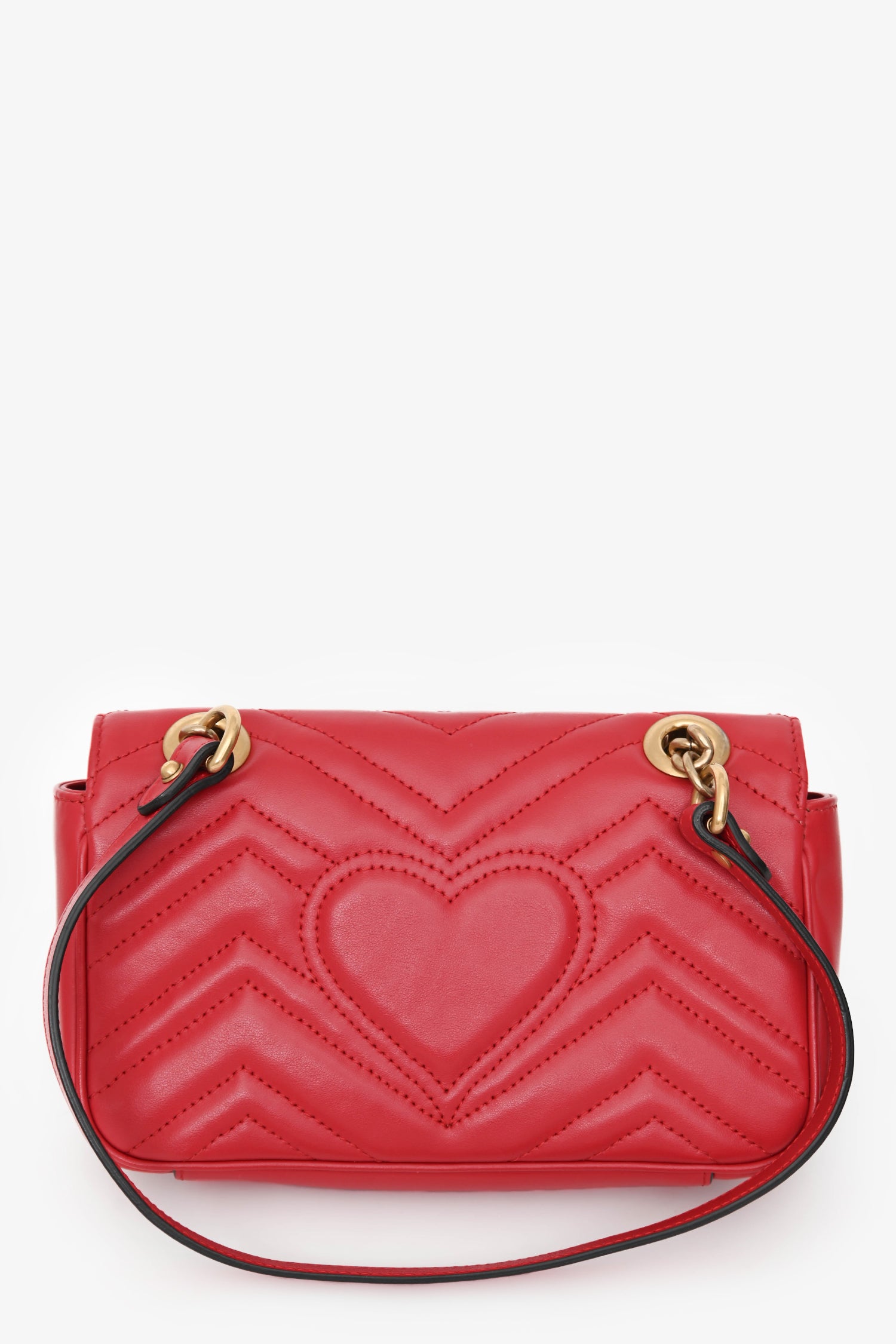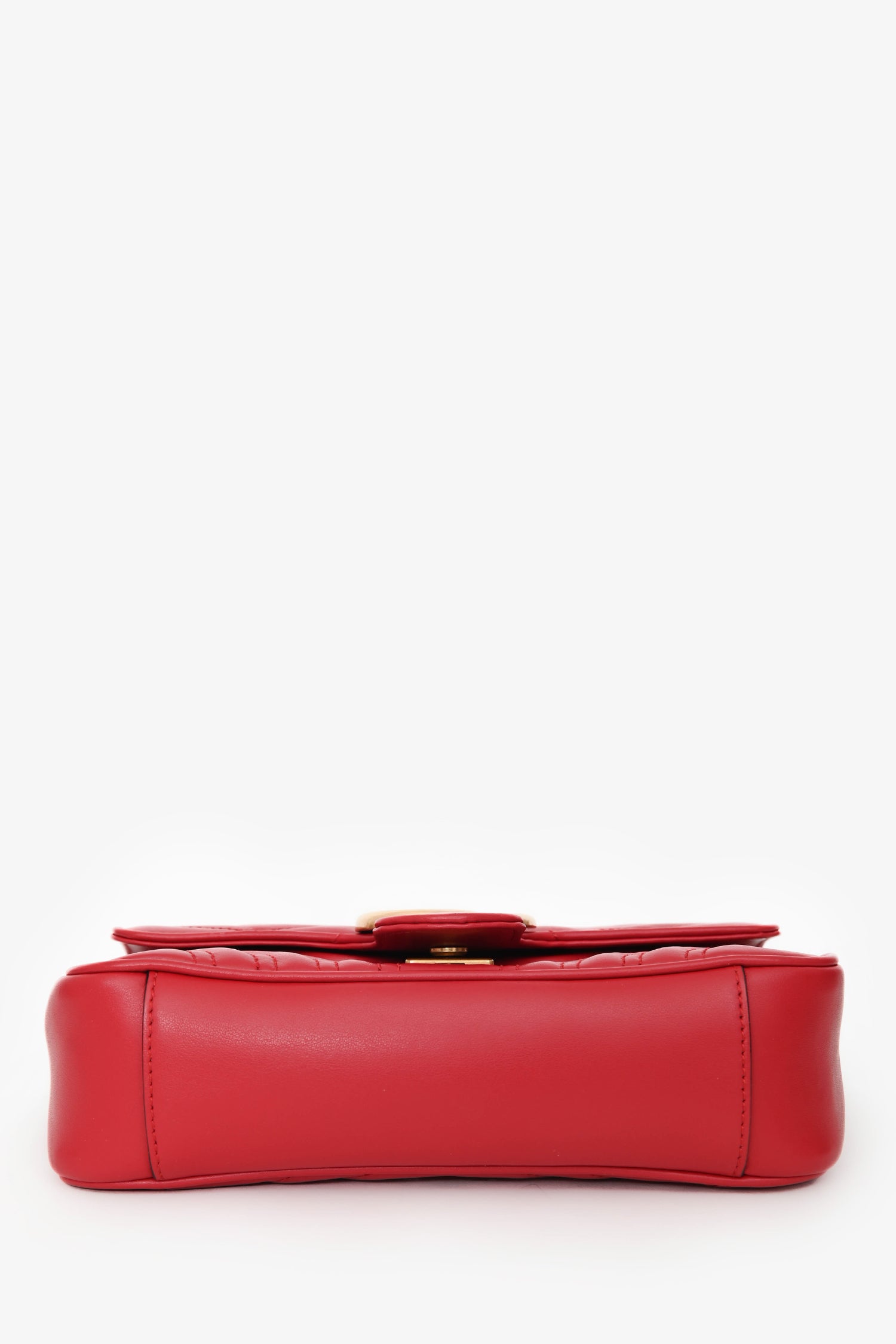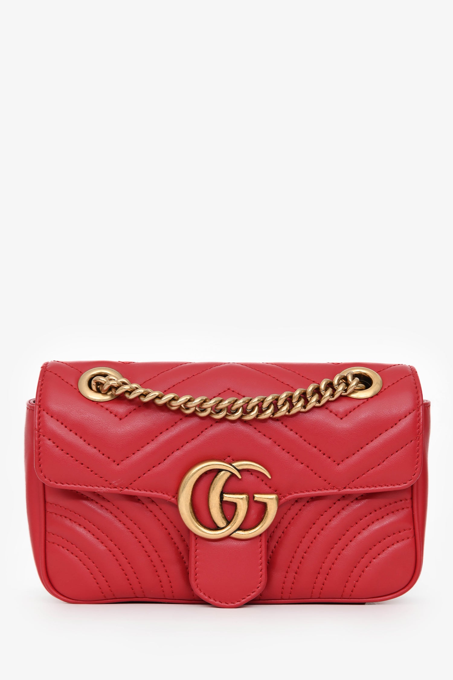 Refresh availabilityGucci Red Leather Small GG Marmont Shoulder Bag. Front fold-over flap with a push-lock closure. Chain-link shoulder strap. Lined interior with a slip compartment. Gold-tone hardware. Tonal stitching.