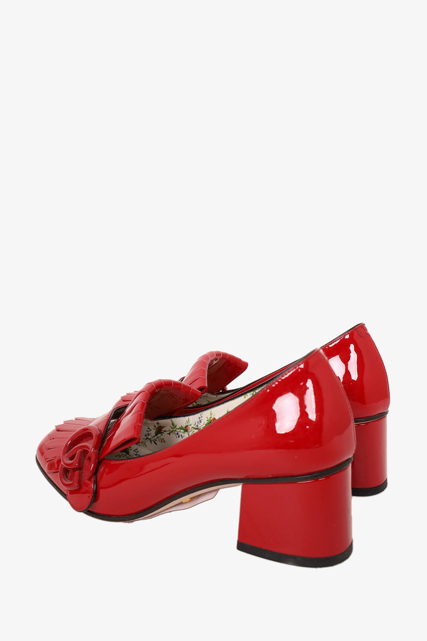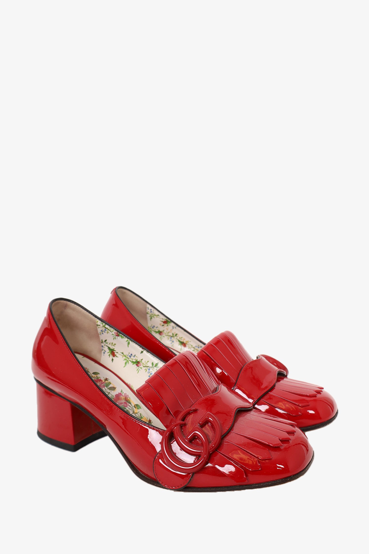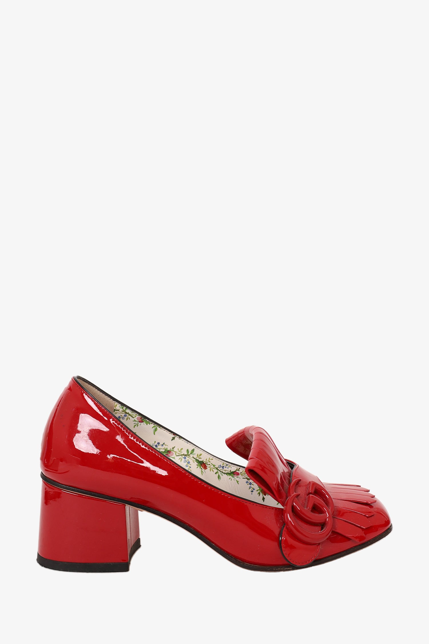 Refresh availabilityGucci Red Patent Marmont Fringed Pumps. Slip-on. Block heel. Floral insole detailing. Tonal stitching.