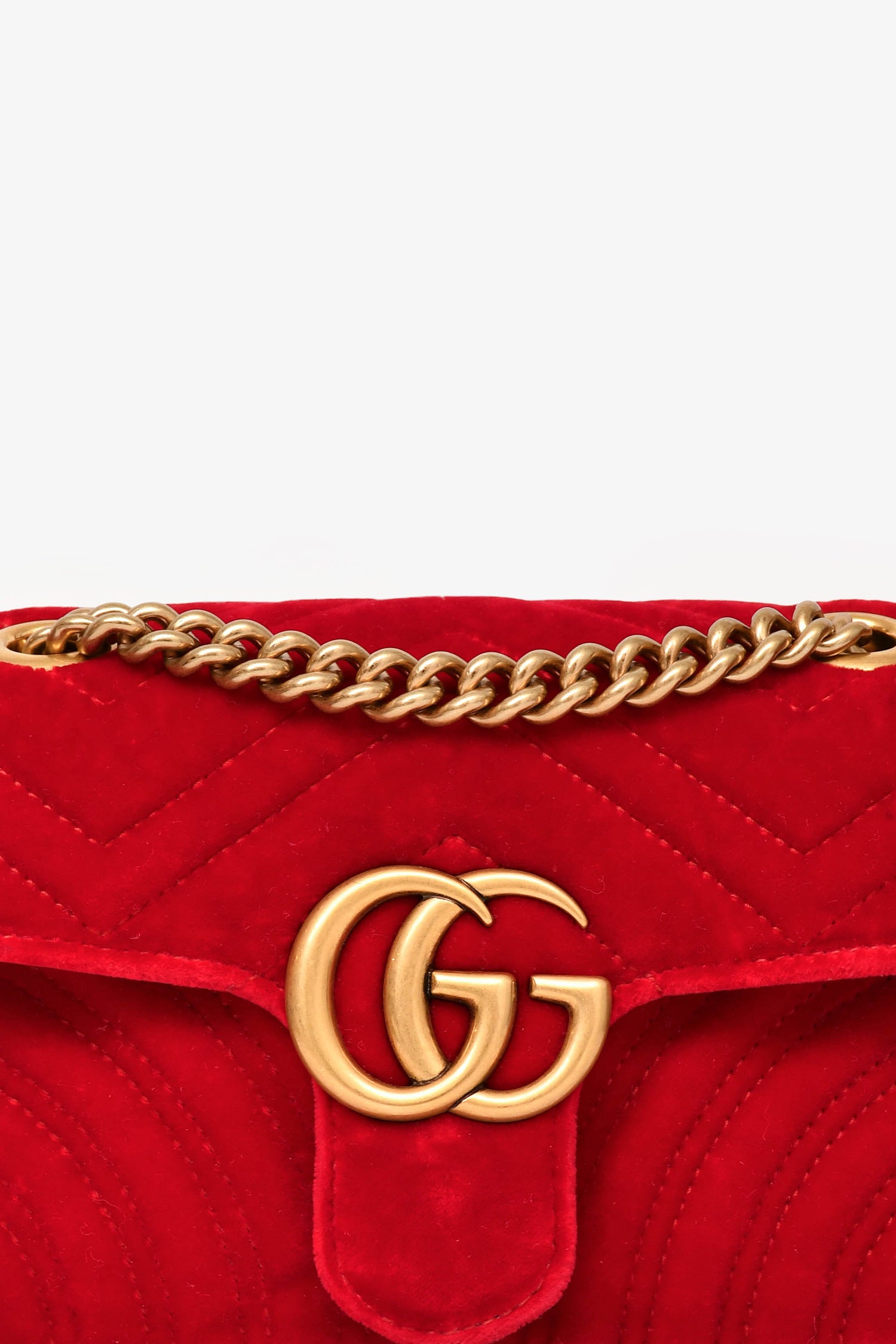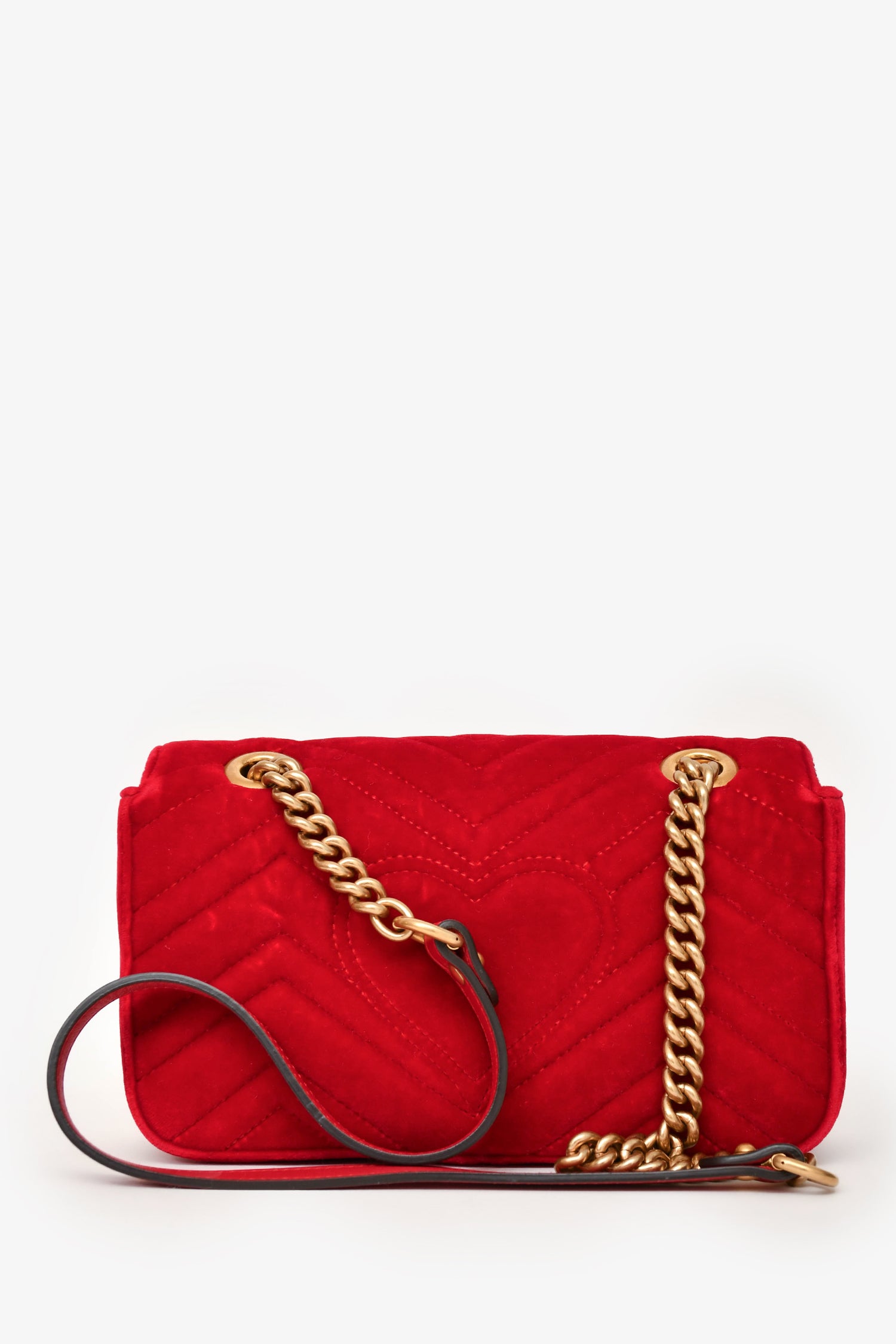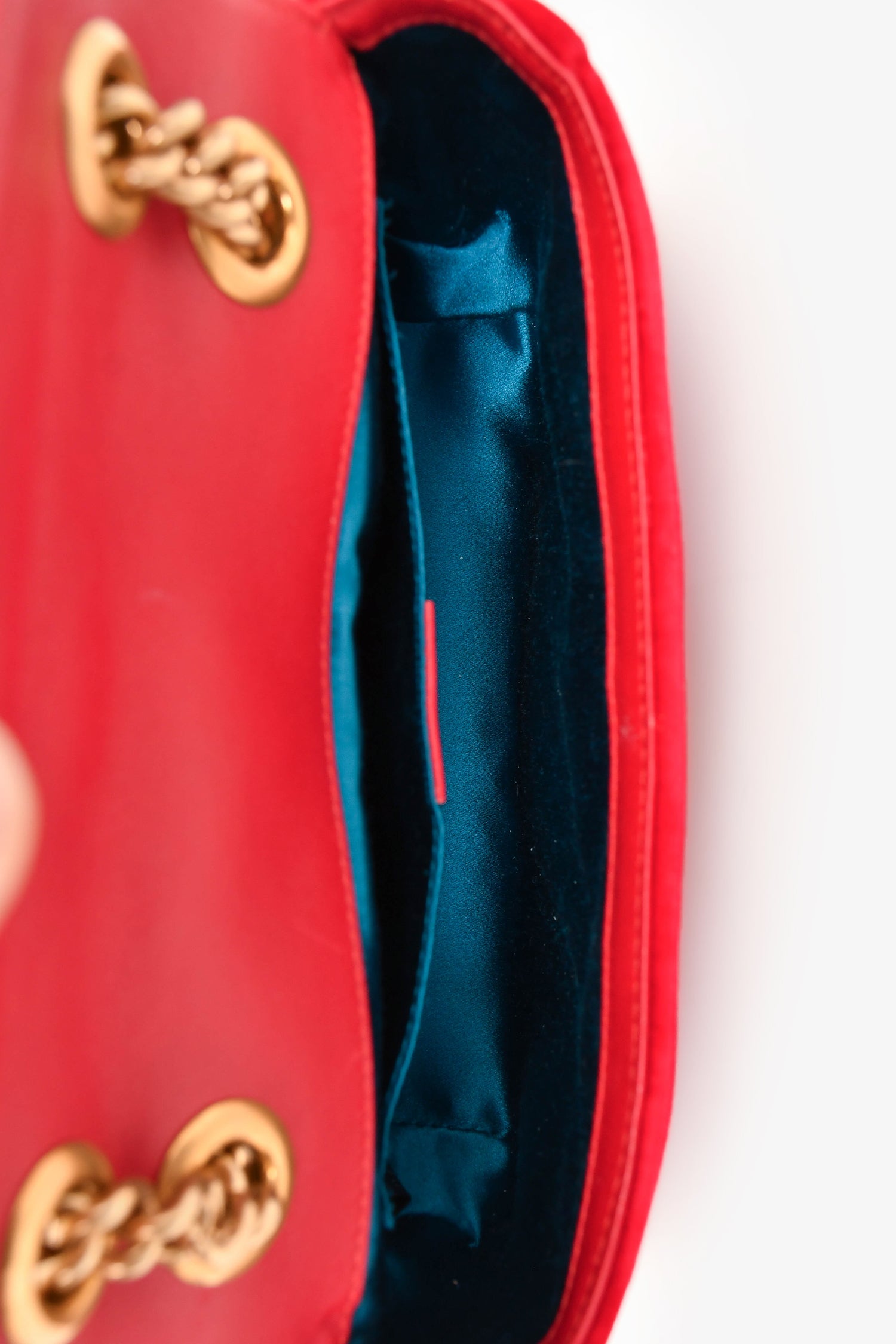 Refresh availabilityGucci Red Velvet Small Marmont Chain Shoulder Bag. Fold over flap with push-lock closure. Chain and leather shoulder strap. Lined interior in blue silk. One wall slip pocket on the interior. Gold-tone hardware. Tonal stitching. Comes with dust bag.