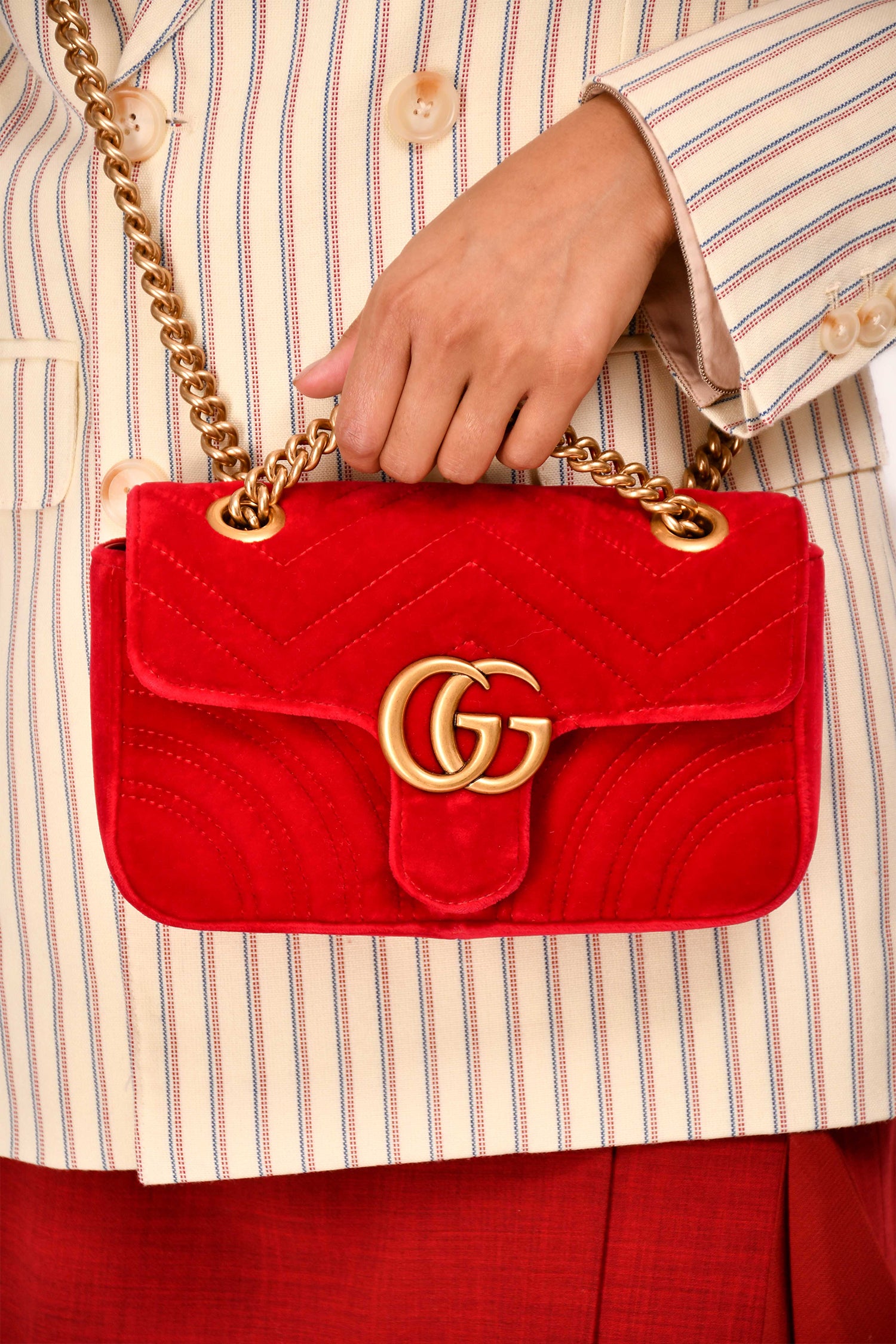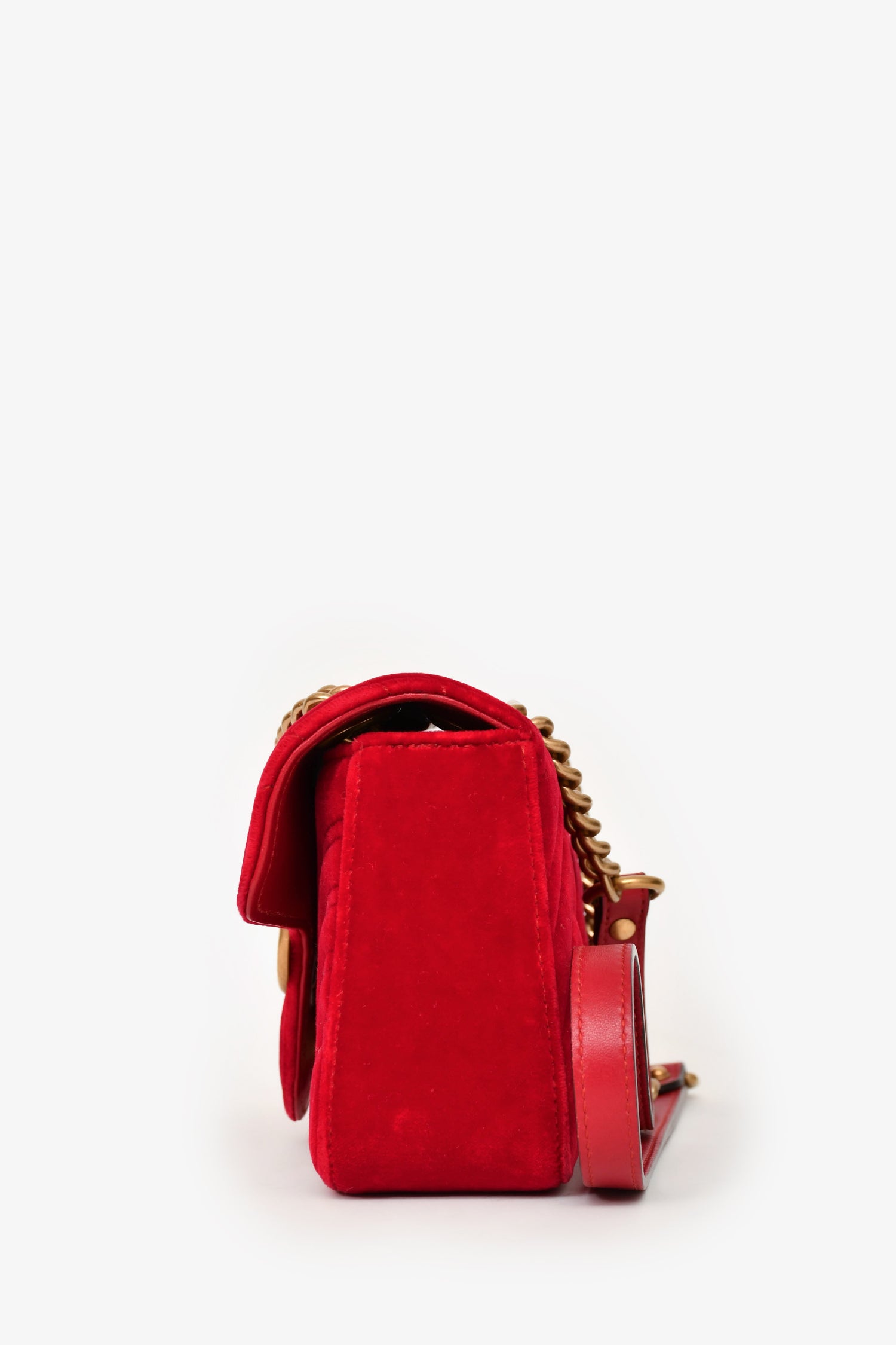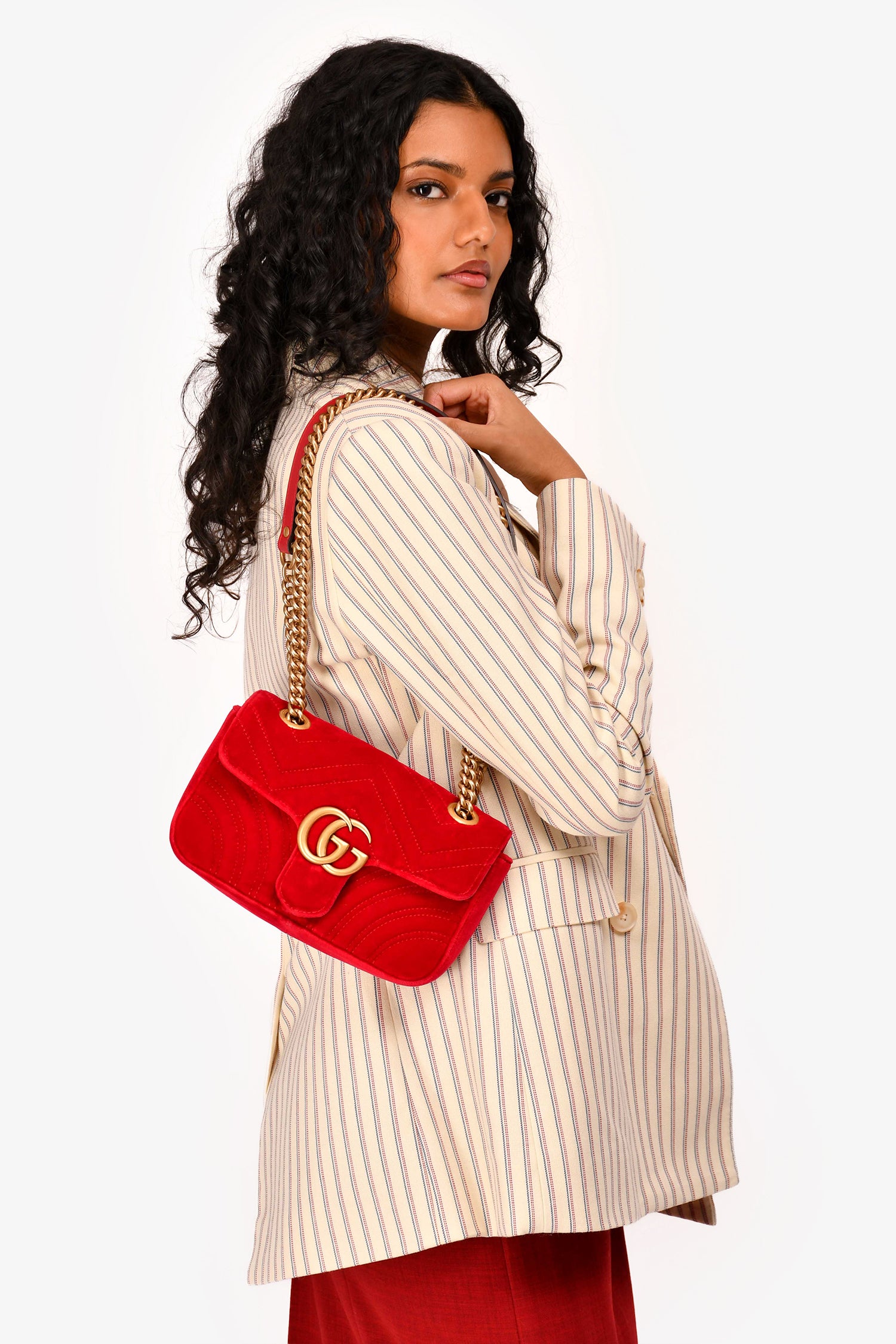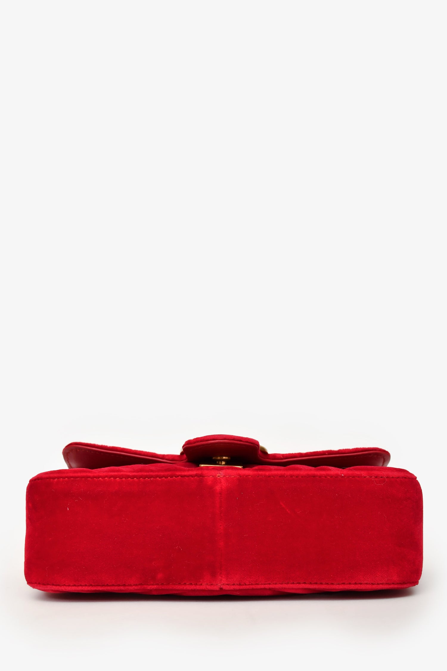 Refresh availabilityGucci Red Velvet Small Marmont Chain Shoulder Bag. Fold over flap with push-lock closure. Chain and leather shoulder strap. Lined interior in blue silk. One wall slip pocket on the interior. Gold-tone hardware. Tonal stitching. Comes with dust bag.