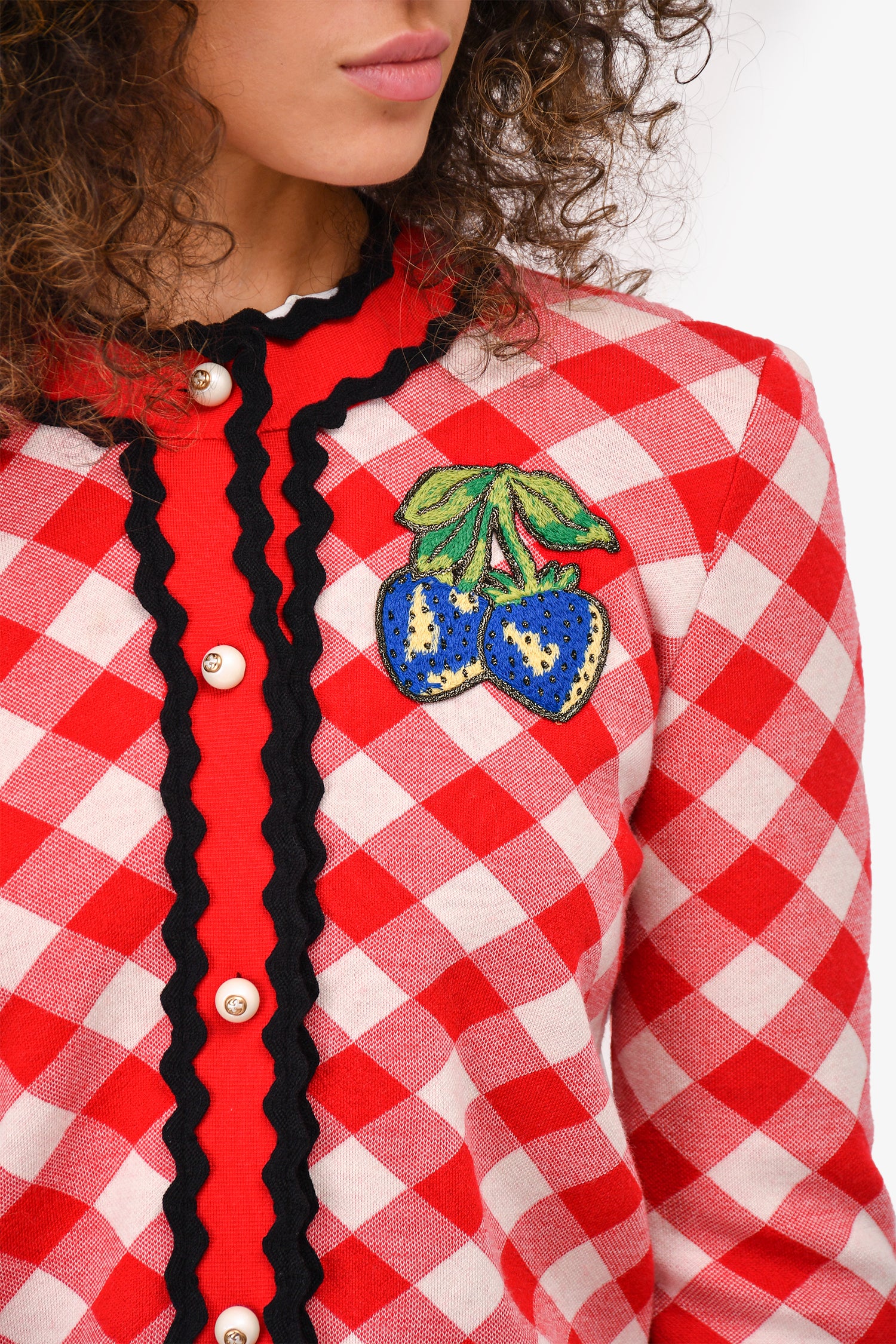Refresh availabilityGucci Red Wool Patterned Strawberry Embroidered Cardigan. Round neck. Scallop trims. Front button-up closure.