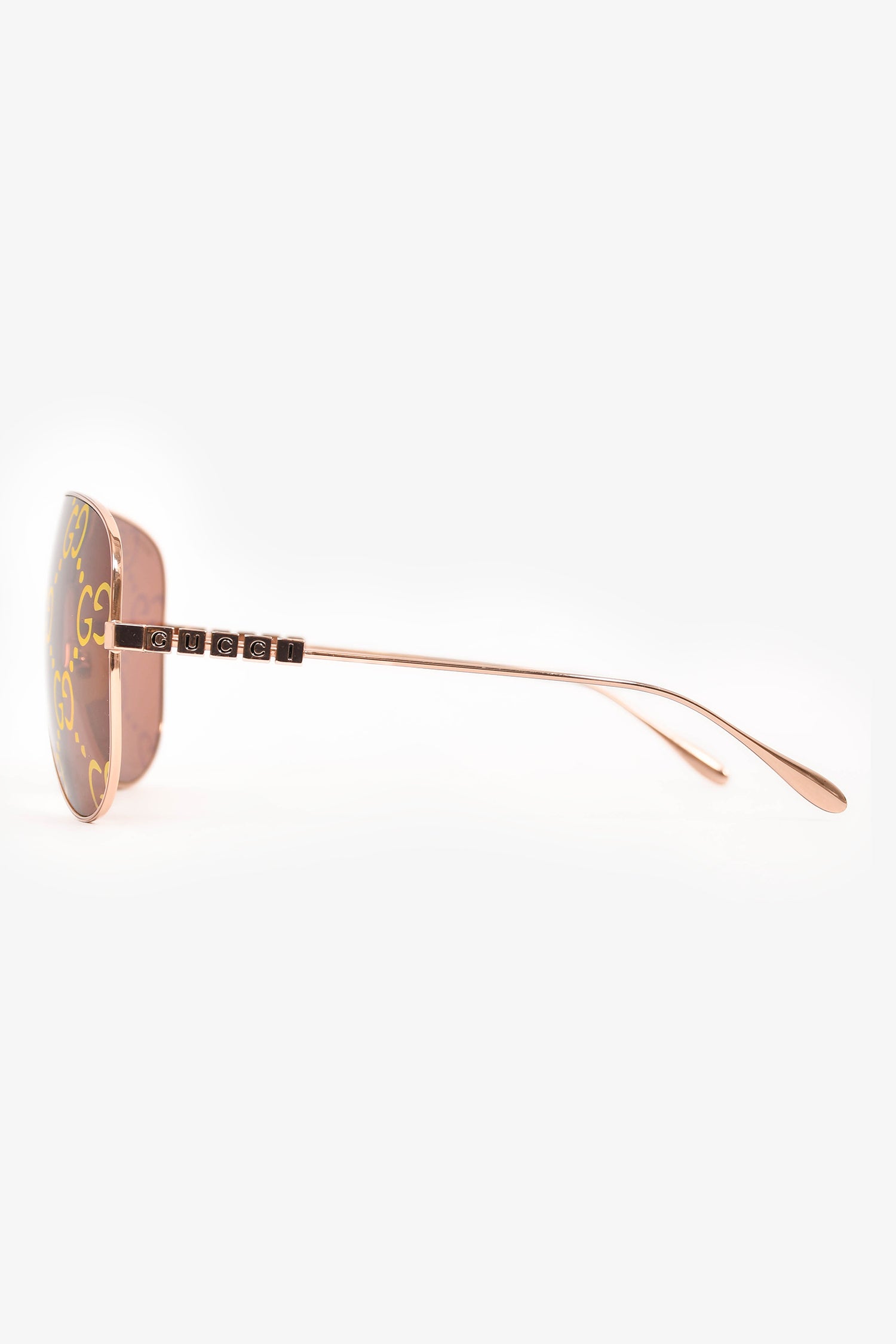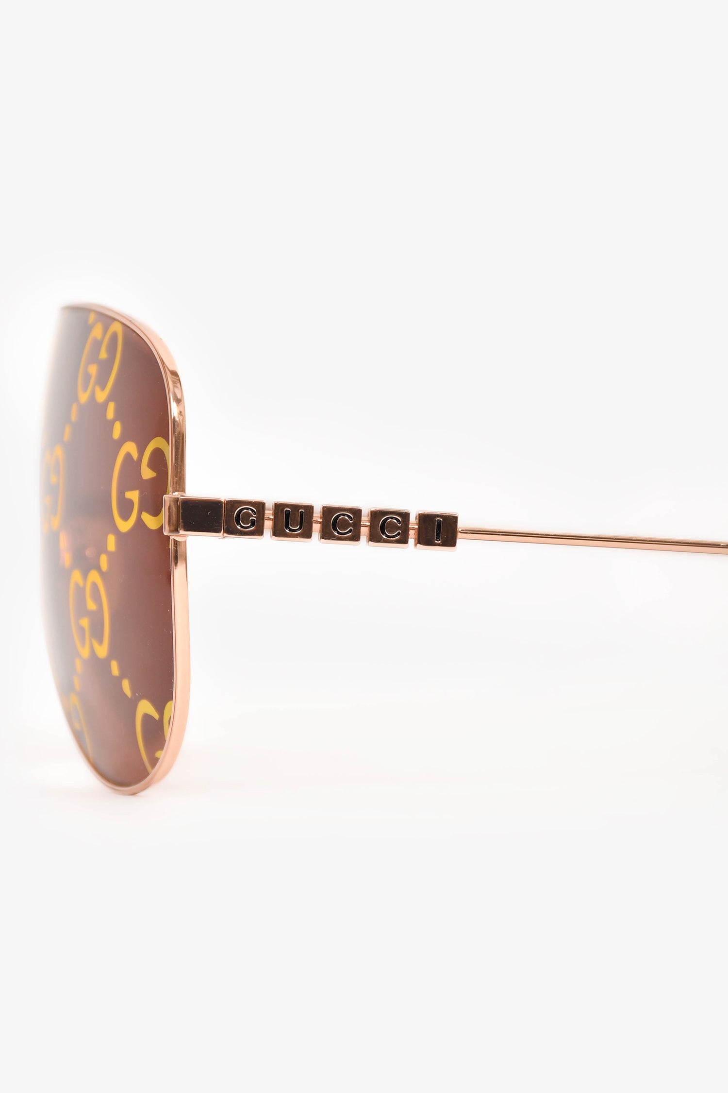 Refresh availabilityGucci Rose Gold Monogram Tint Aviator Sunglasses. Mirrored lens. Adjustable nose pads. Rose gold-tone hardware.