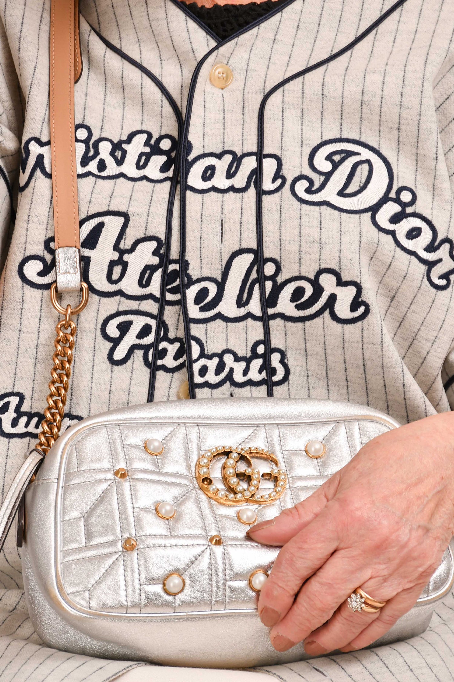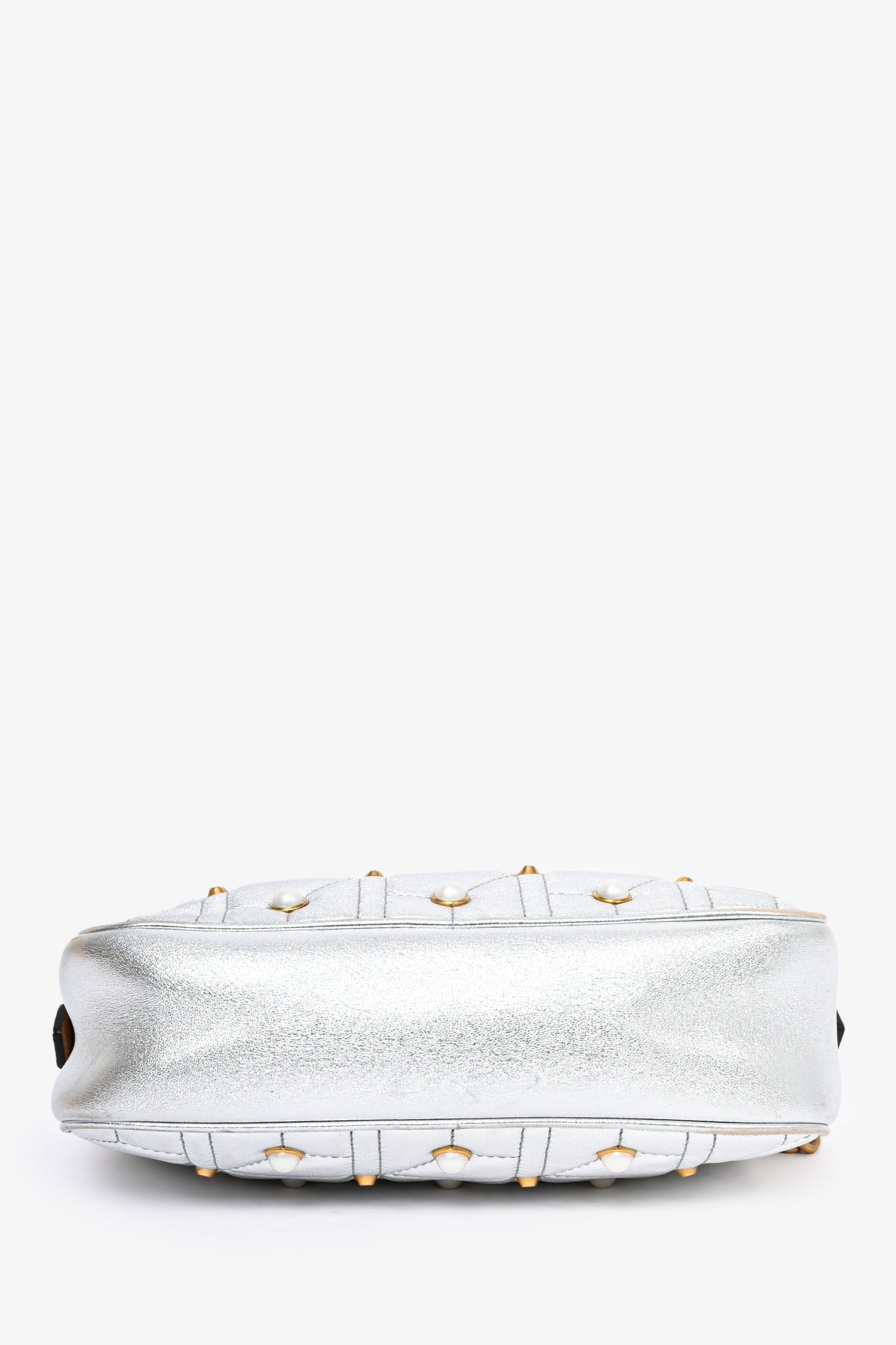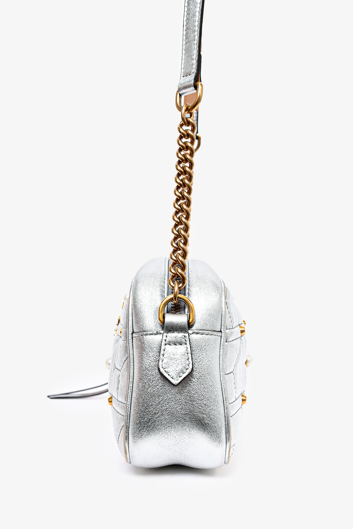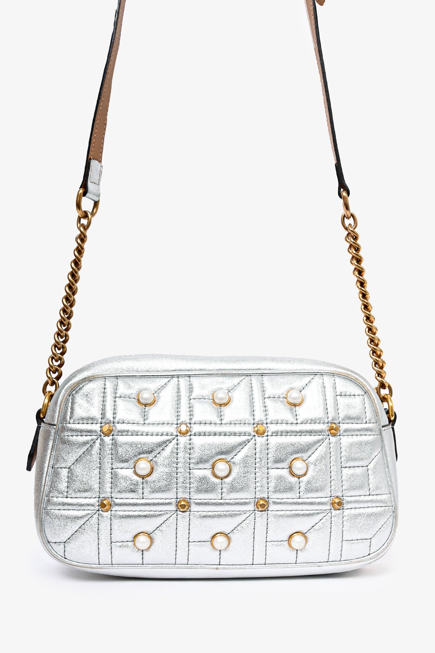 Refresh availabilityGucci Silver Leather Pearl Studded Marmont Crossbody Bag. Top zip closure. Pink textile interior lining. Single interior wall slip pocket. Adjustable strap. Gold-tone hardware.