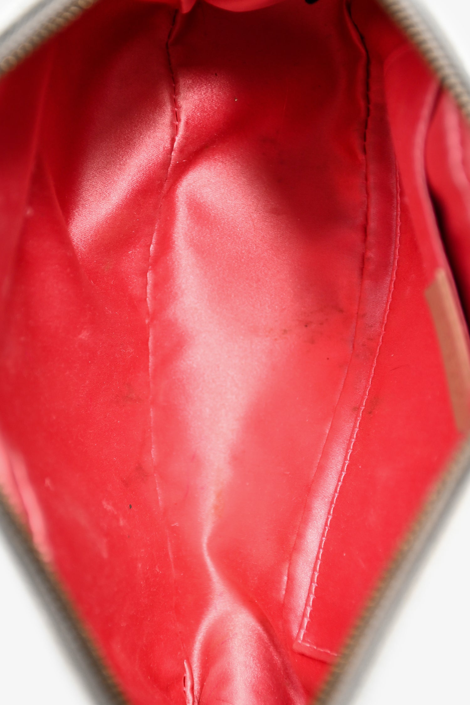 Condition: This item is in good pre-loved condition with worn lining and minor interior stains. Wear on the outer corners. Two missing pearls on the front logo hardware.