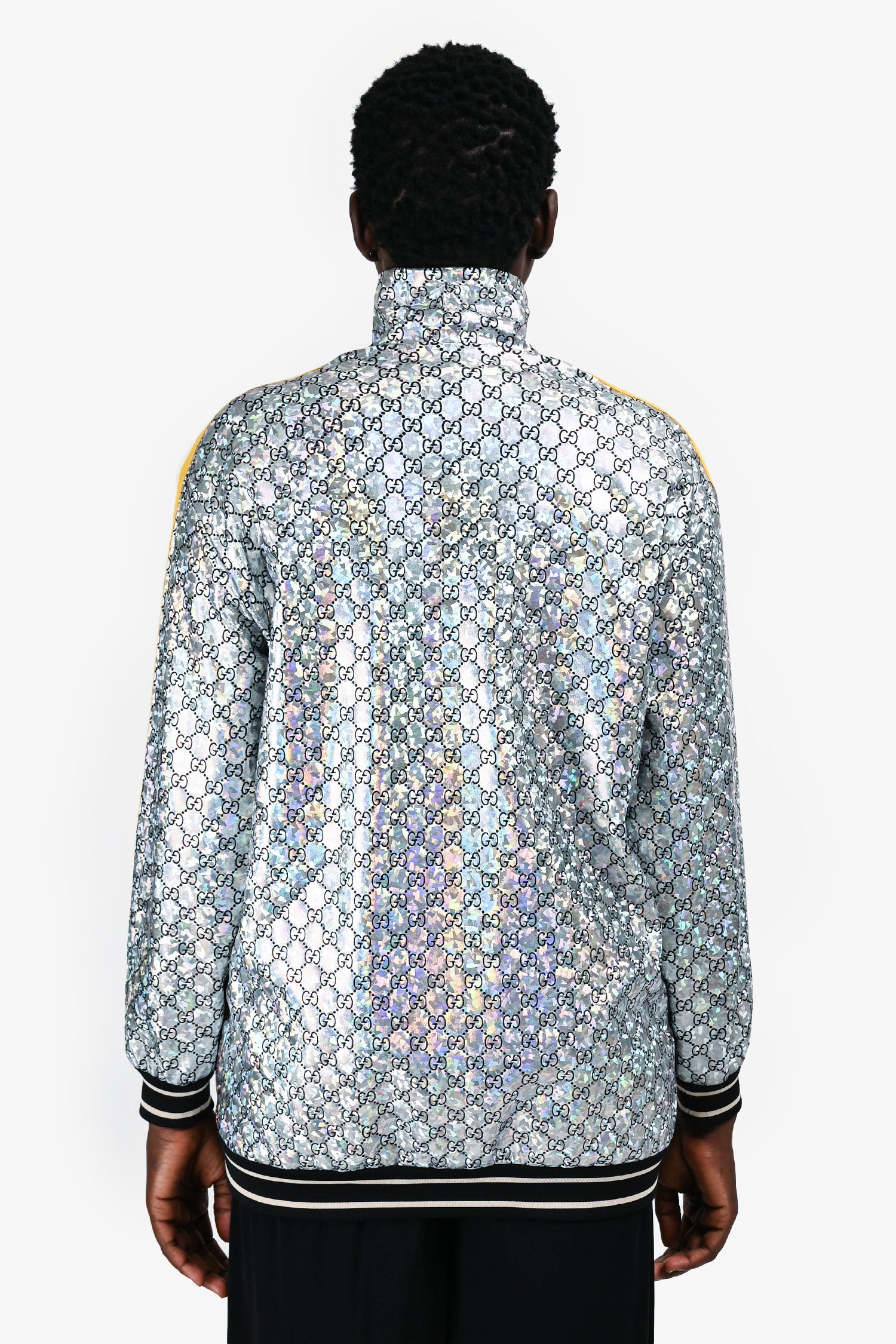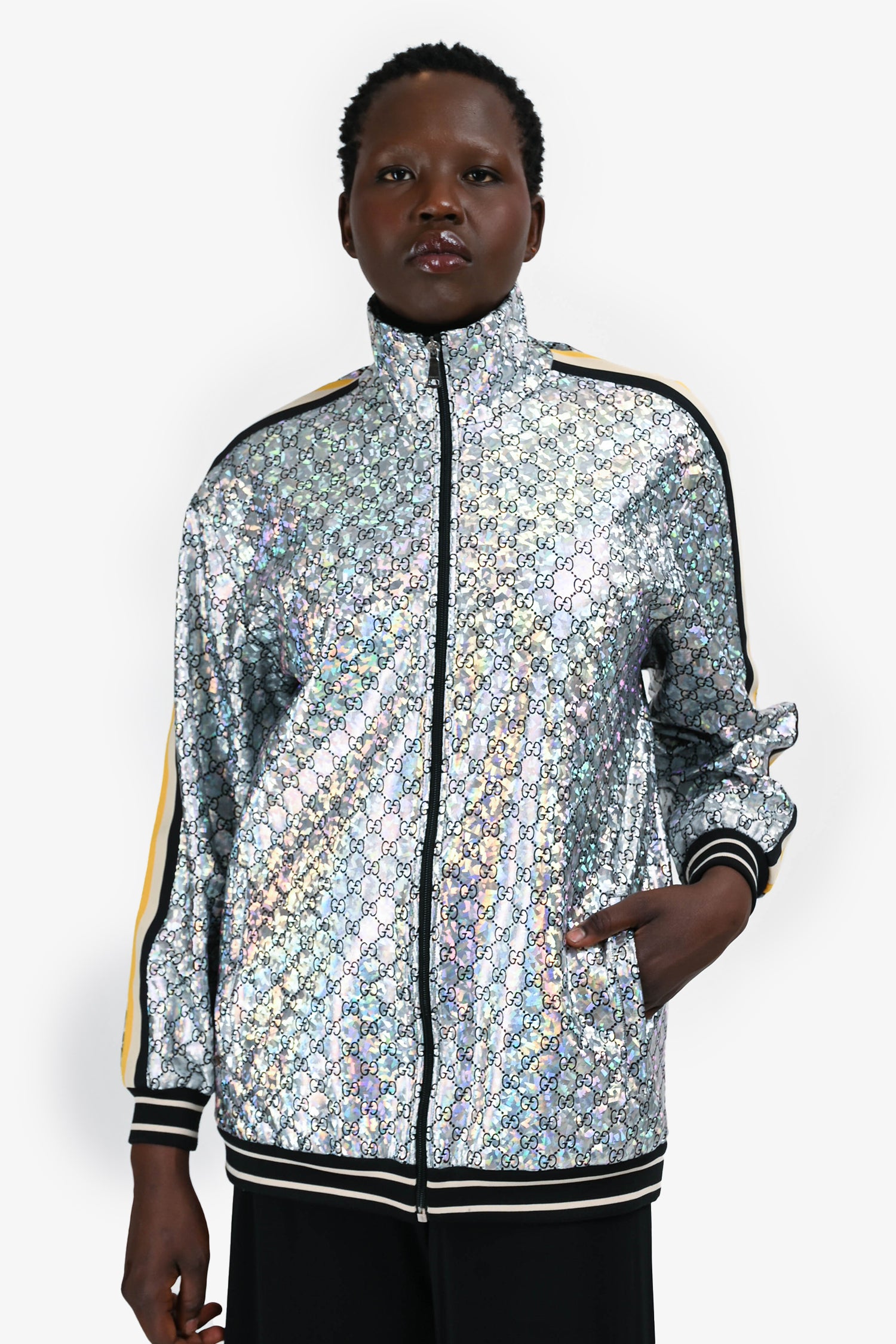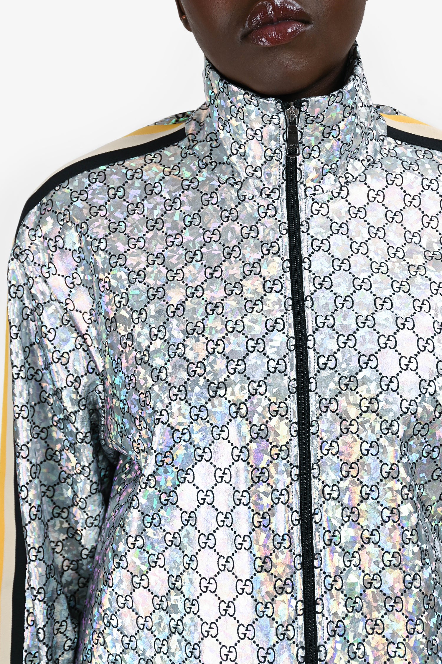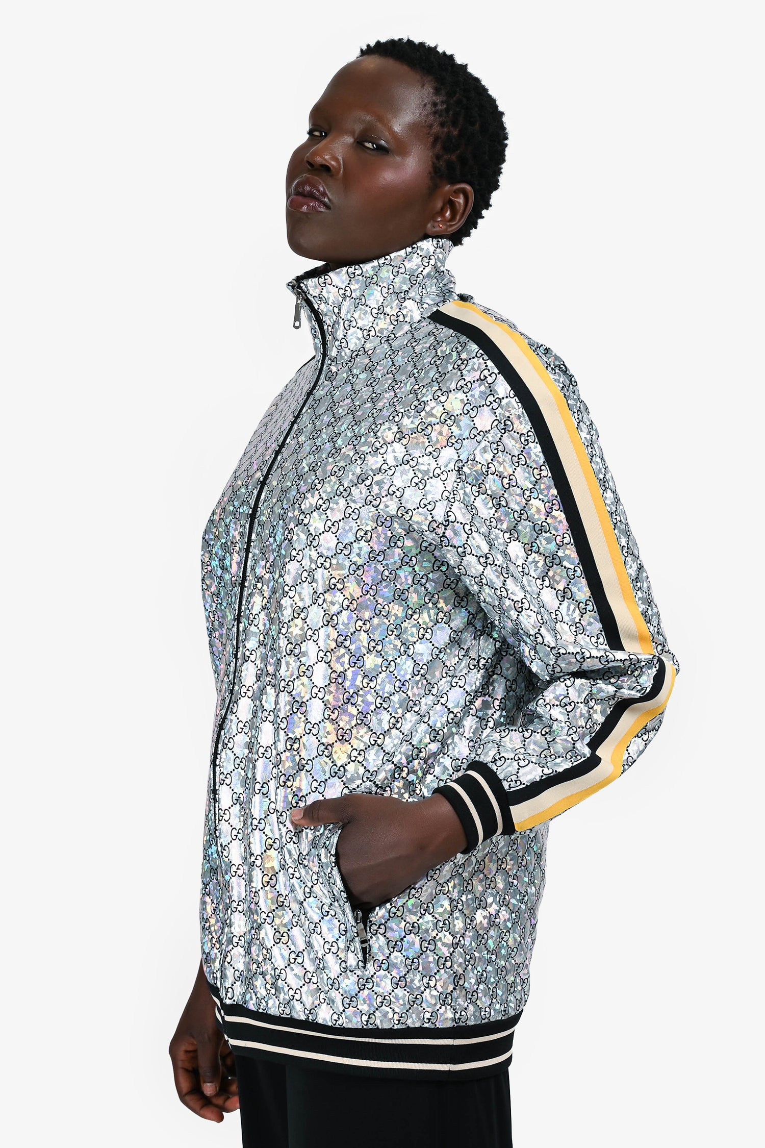 Refresh availabilityGucci Silver Monogram Zip-Up Jacket. Lined. Ribbed cuffs. Front zip pockets.