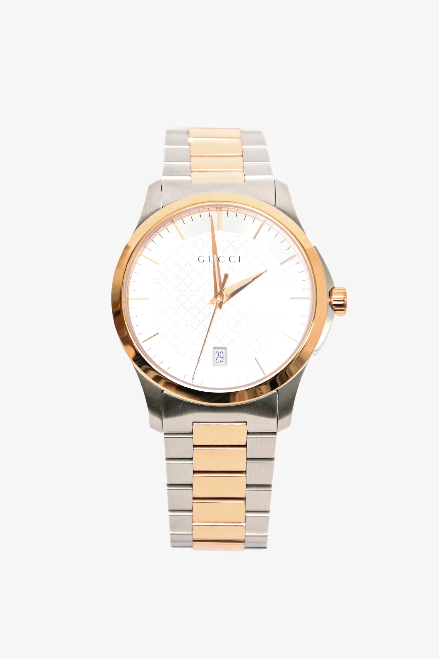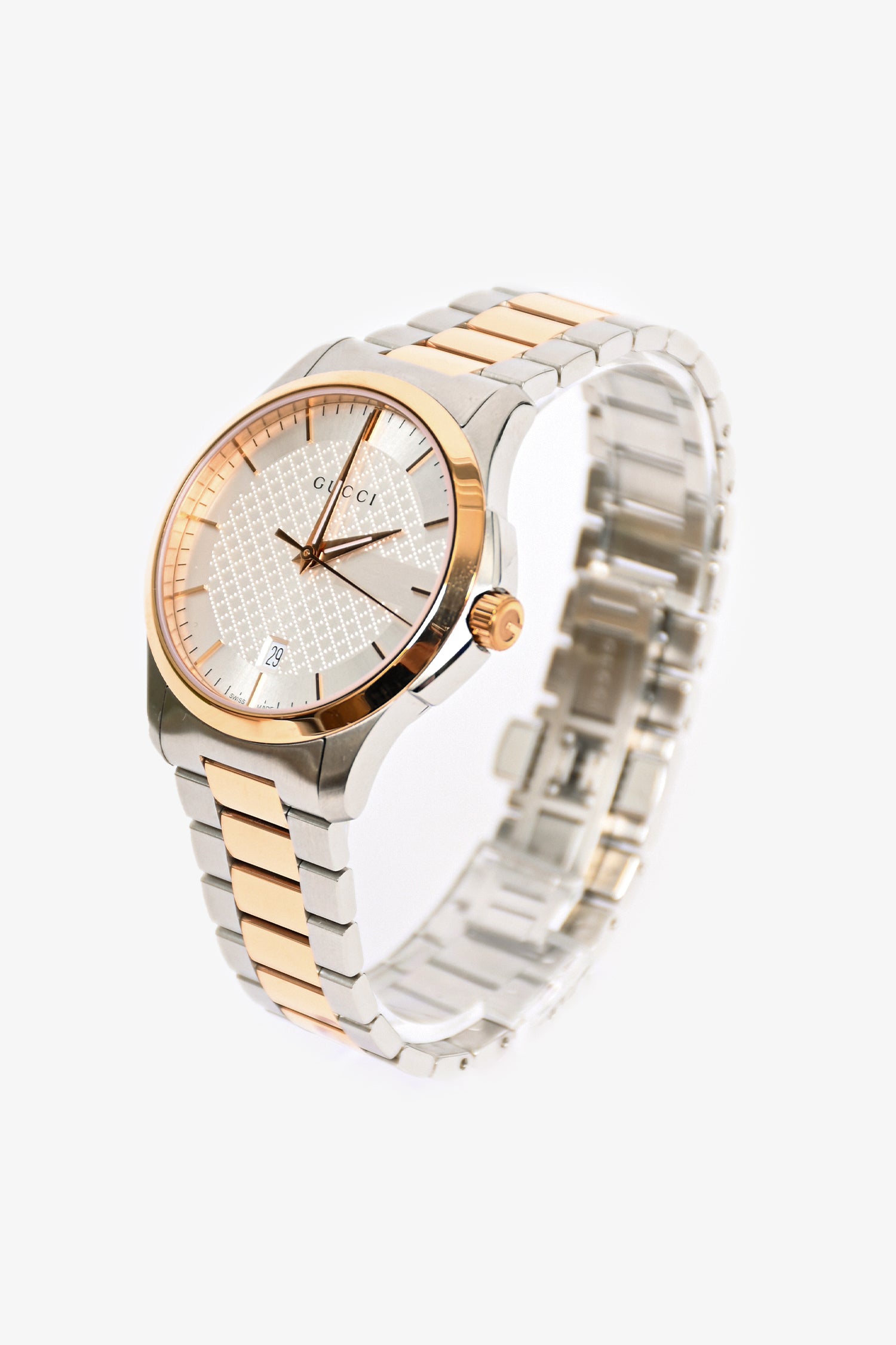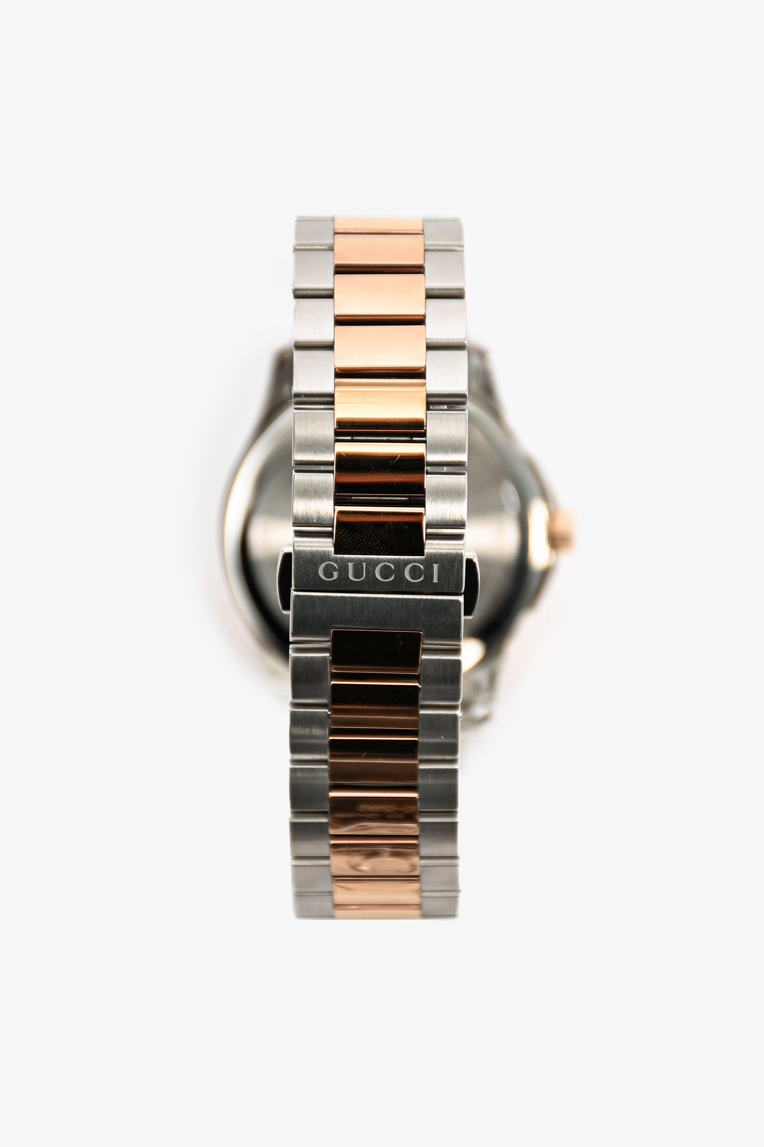 Refresh availabilityGucci Silver/Rose Gold Tone G-Timeless Watch 34mm. Clasp opening. Rose-gold tone hour markers. Smooth rose-gold trimming around face.