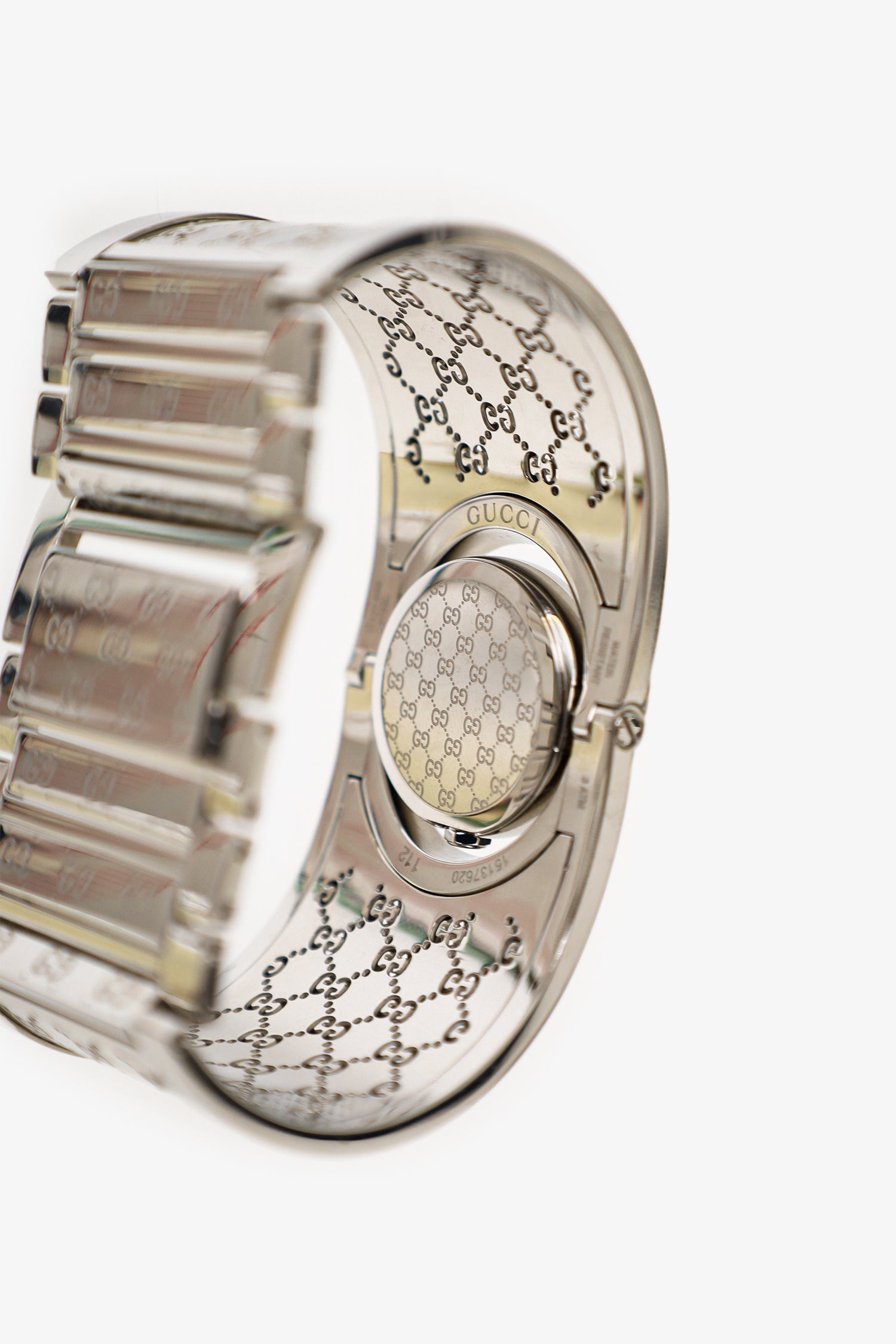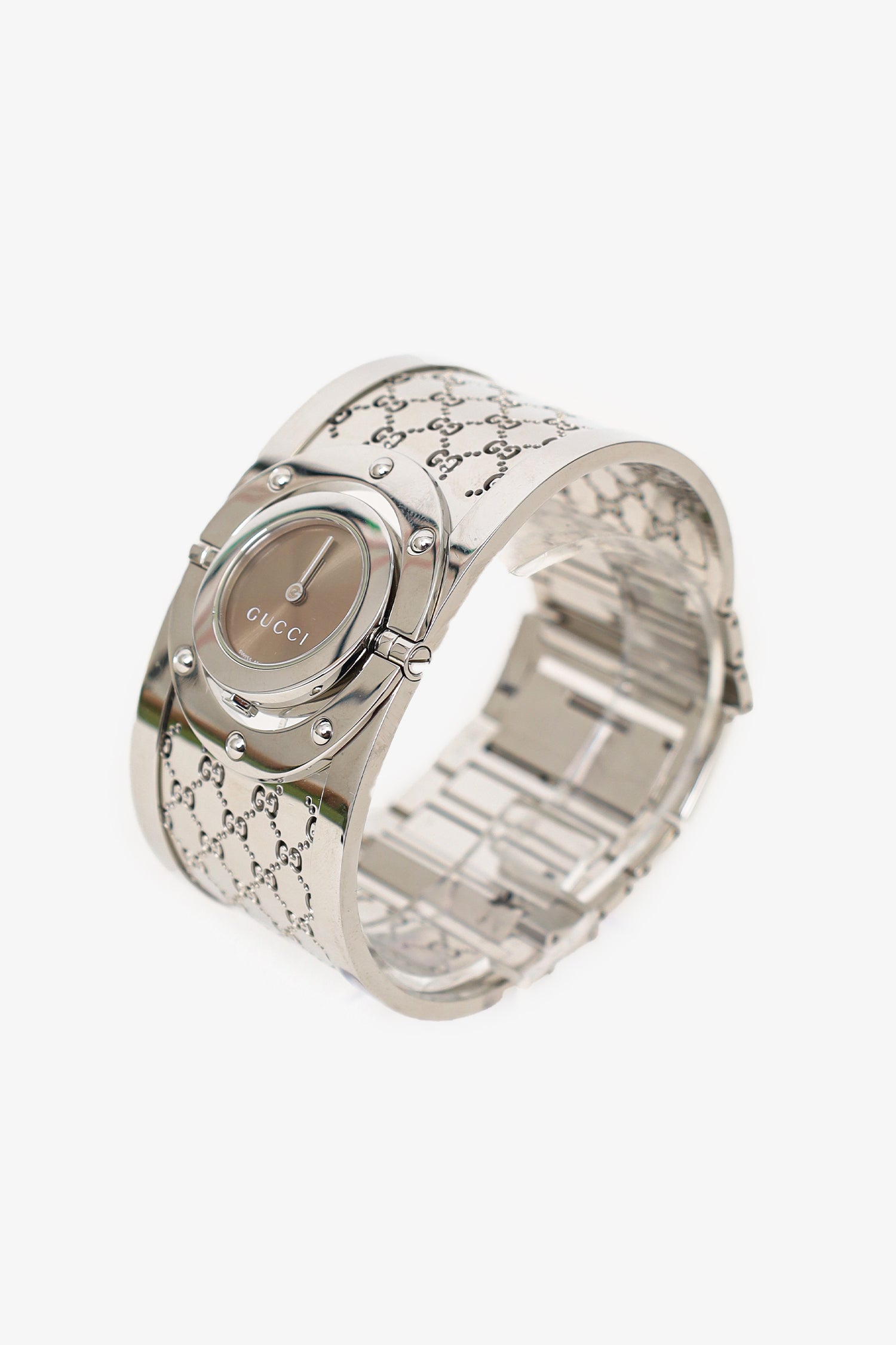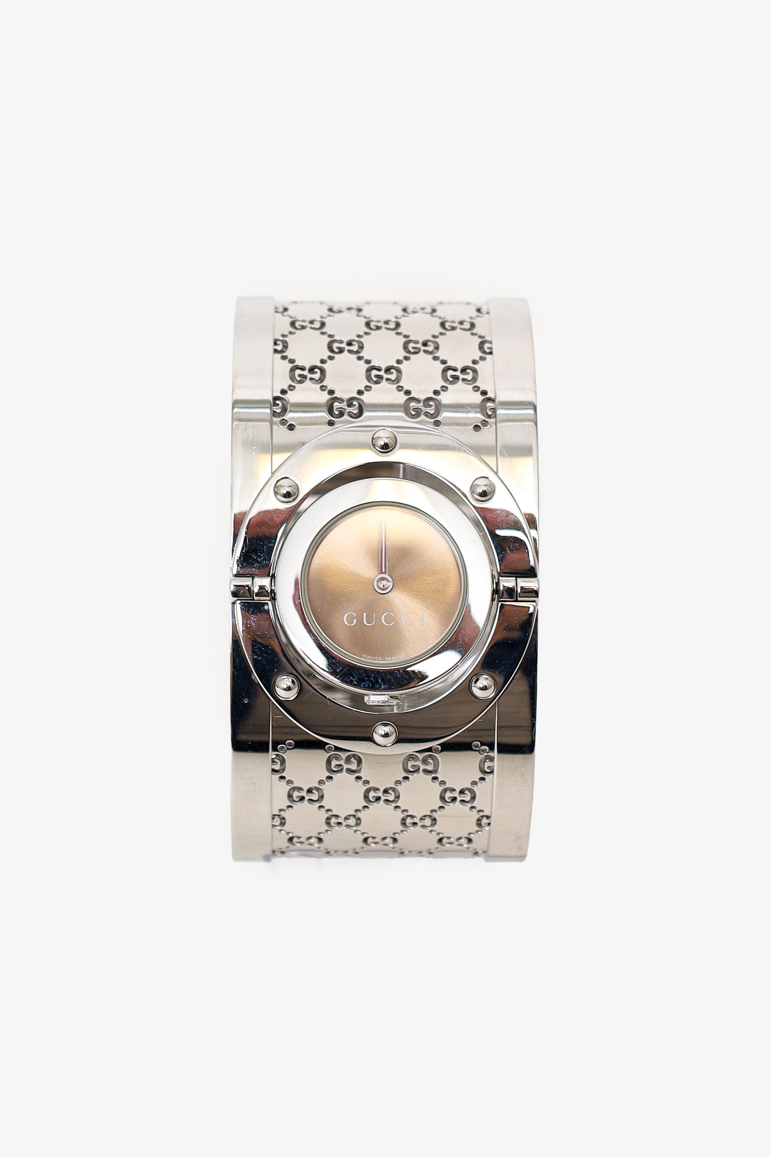 Refresh availabilityGucci Stainless Steel GG Twirl Watch. Rear flip-lock. Rotating watch face. Silver-tone hardware.