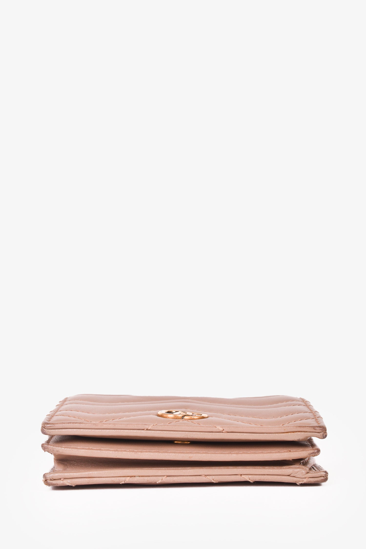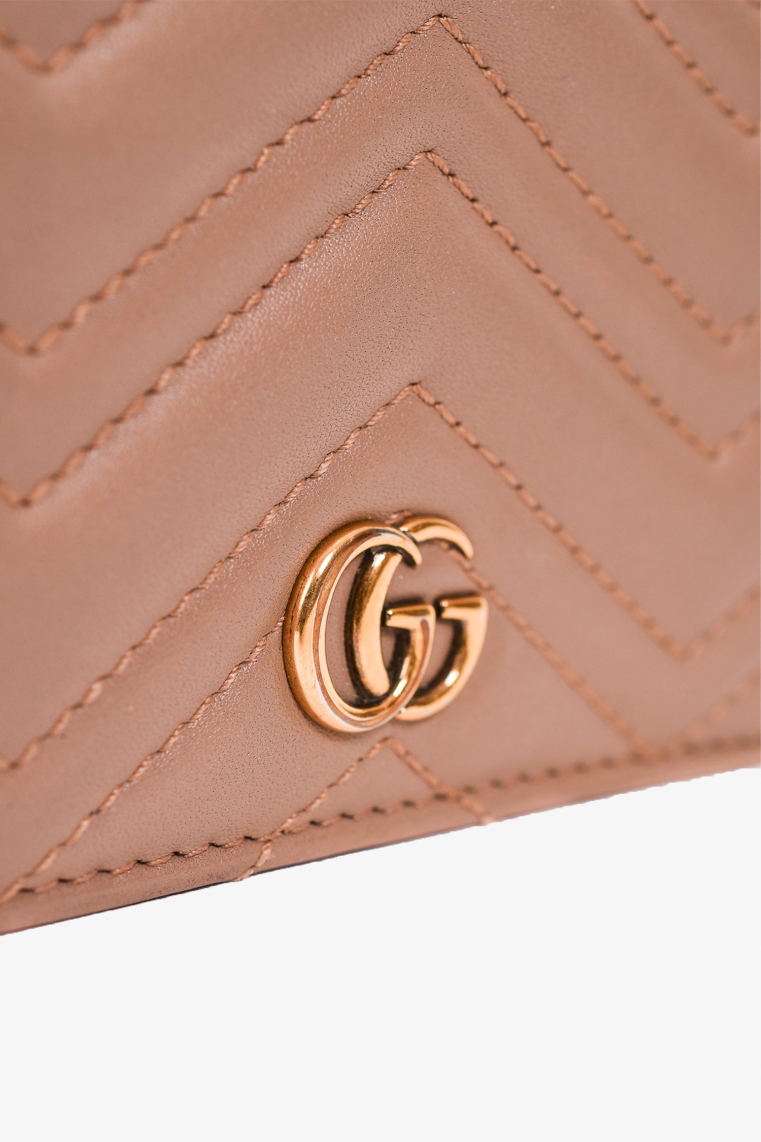 Refresh availabilityGucci Taupe Leather GG Marmont Chevron Quilted Compact Wallet. Front fold-over flap with snap-button closure. 6 card slots. 1 zippered coin compartment. 1 billfold compartment. Bi-fold. Gold-tone hardware. Tonal stitching.