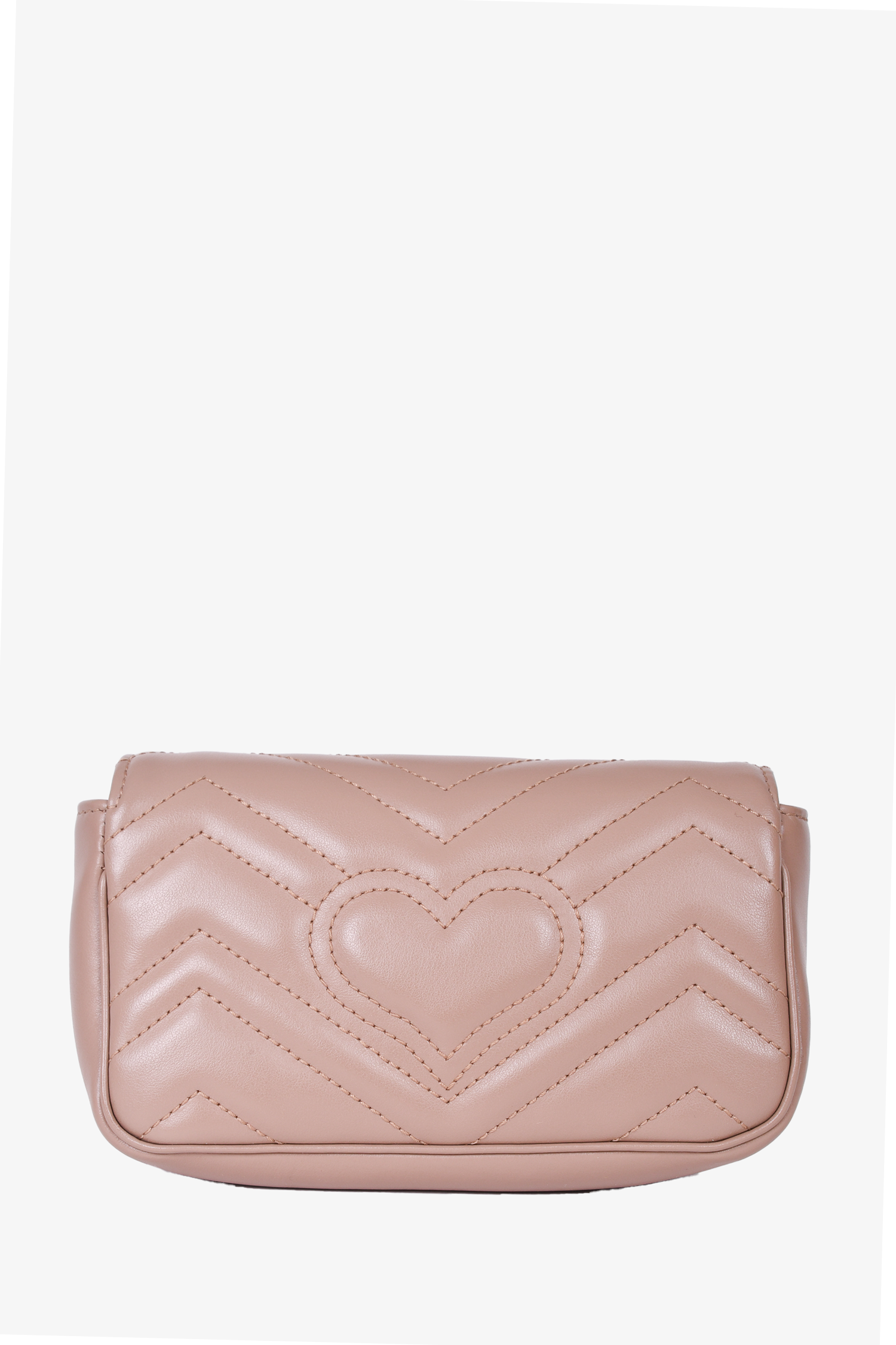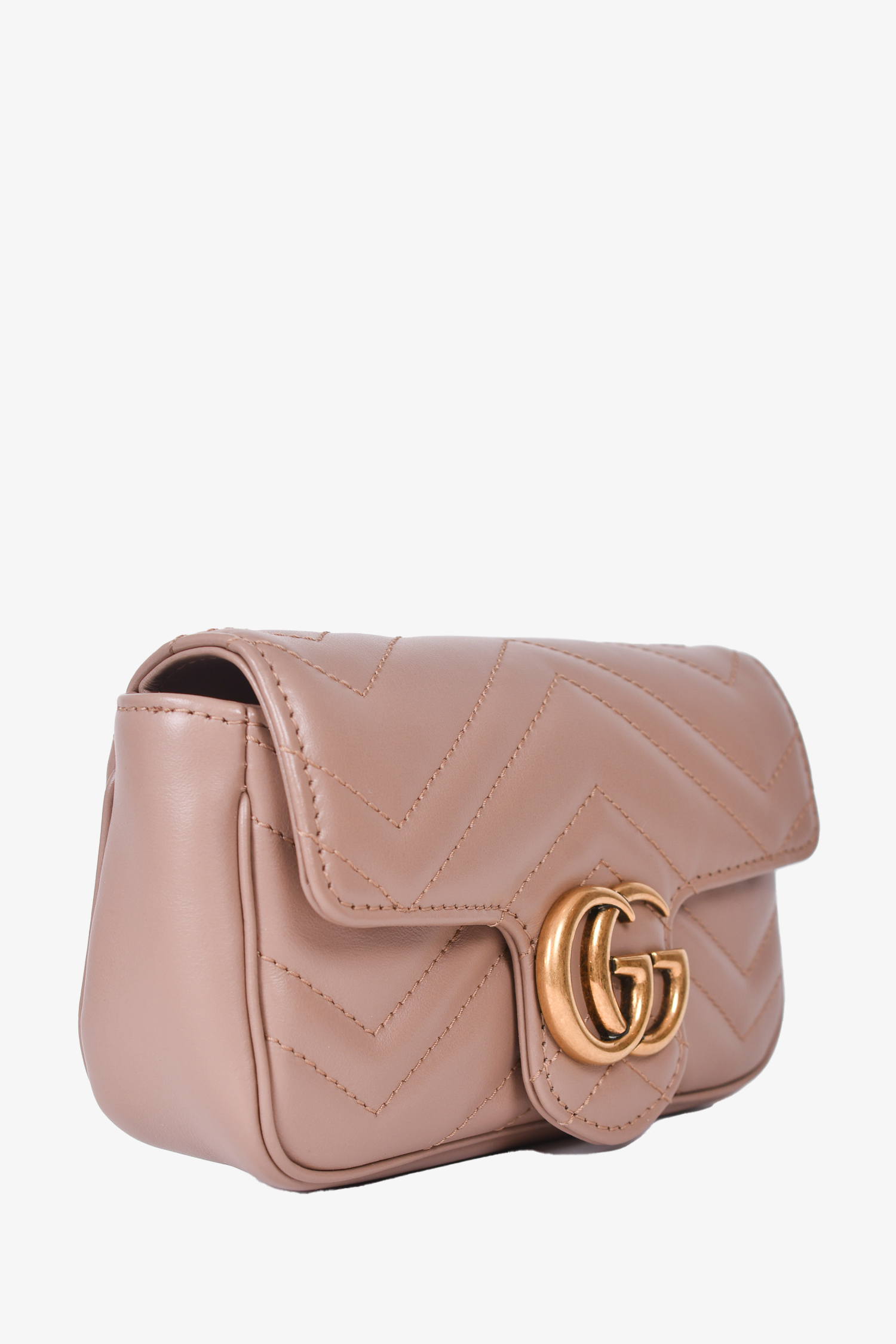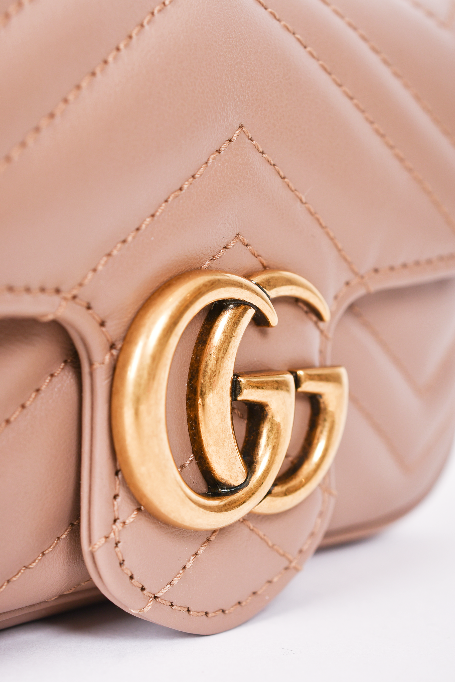 Refresh availabilityGucci Taupe Leather Super Mini GG Marmont Crossbody. Front fold-over flap with magnetic button closure. Peach textile interior lining. Open interior. Gold-tone hardware. Tonal stitching.