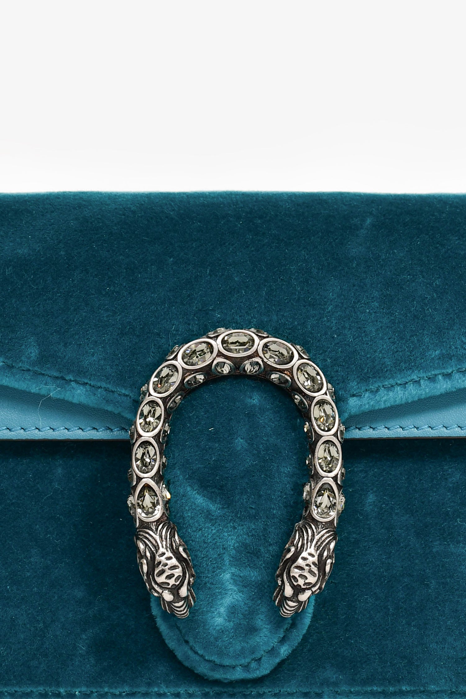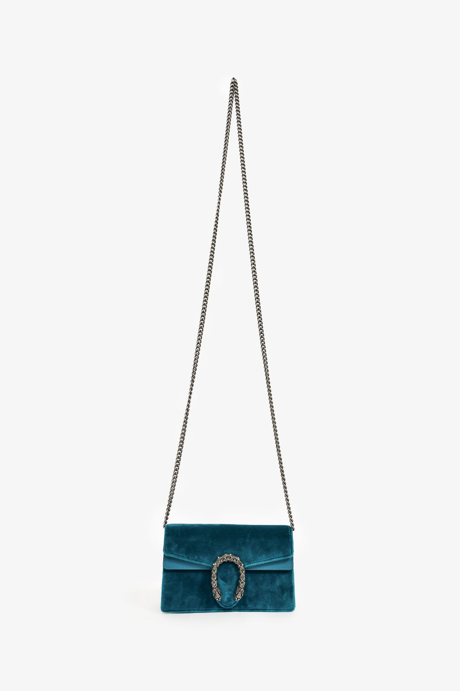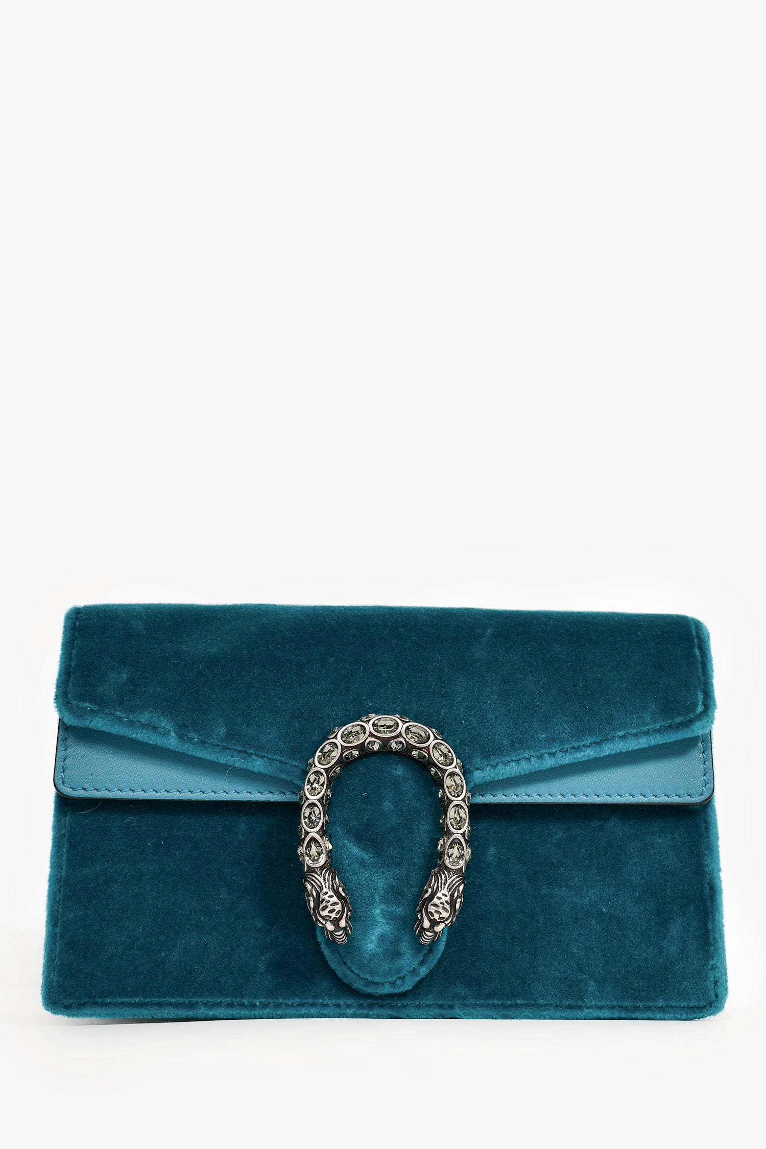 Refresh availabilityGucci Teal Velvet Dionysus Super Mini Crossbody Bag. Front fold-over flap with magnetic closure. Single interior compartment with a built-in hook and chain. Crystal details. Antique silver-tone hardware. Leather lining. Tonal stitching.