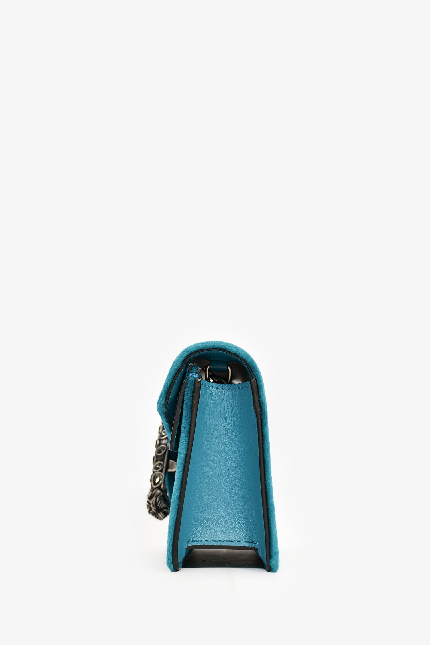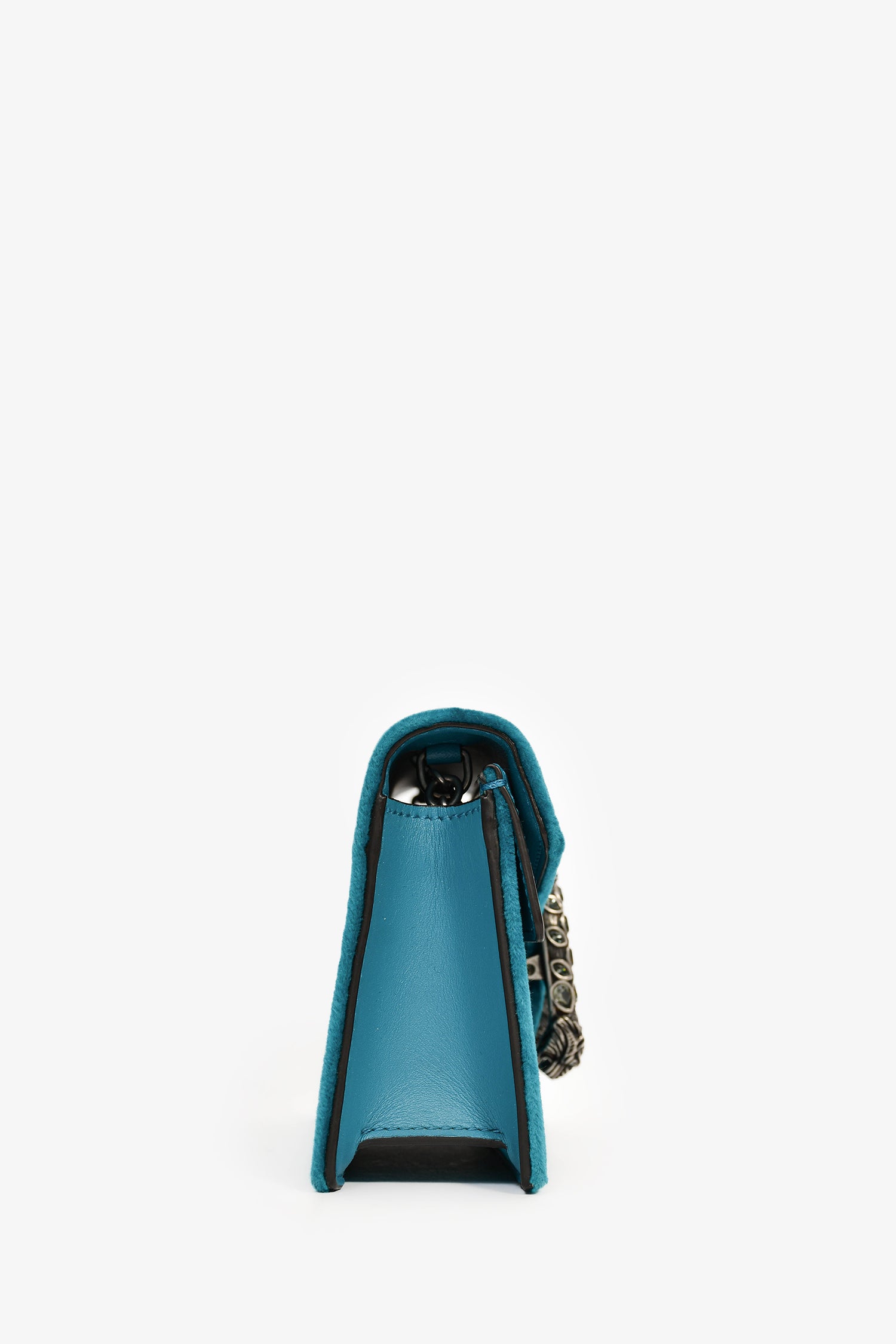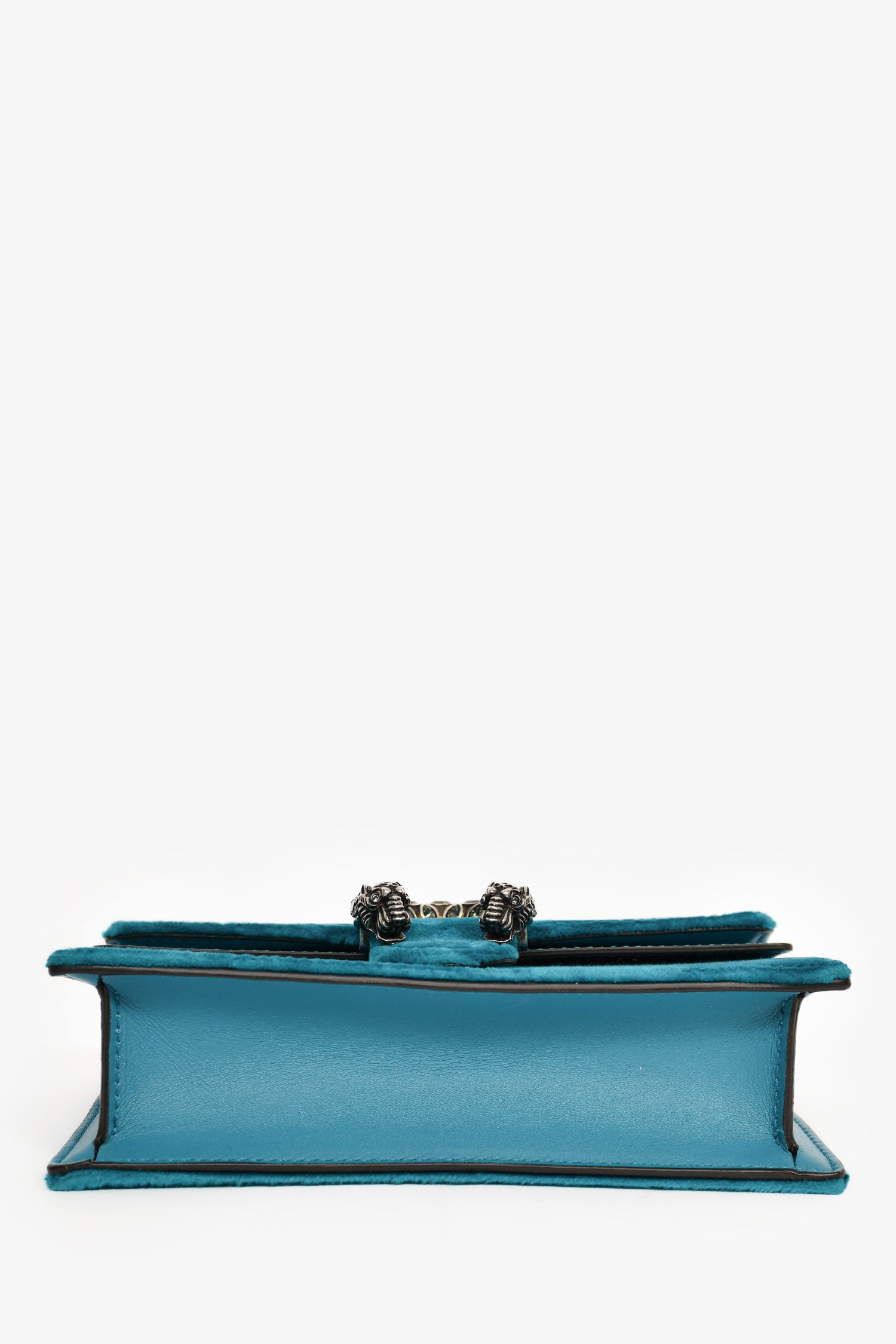 Refresh availabilityGucci Teal Velvet Dionysus Super Mini Crossbody Bag. Front fold-over flap with magnetic closure. Single interior compartment with a built-in hook and chain. Crystal details. Antique silver-tone hardware. Leather lining. Tonal stitching.