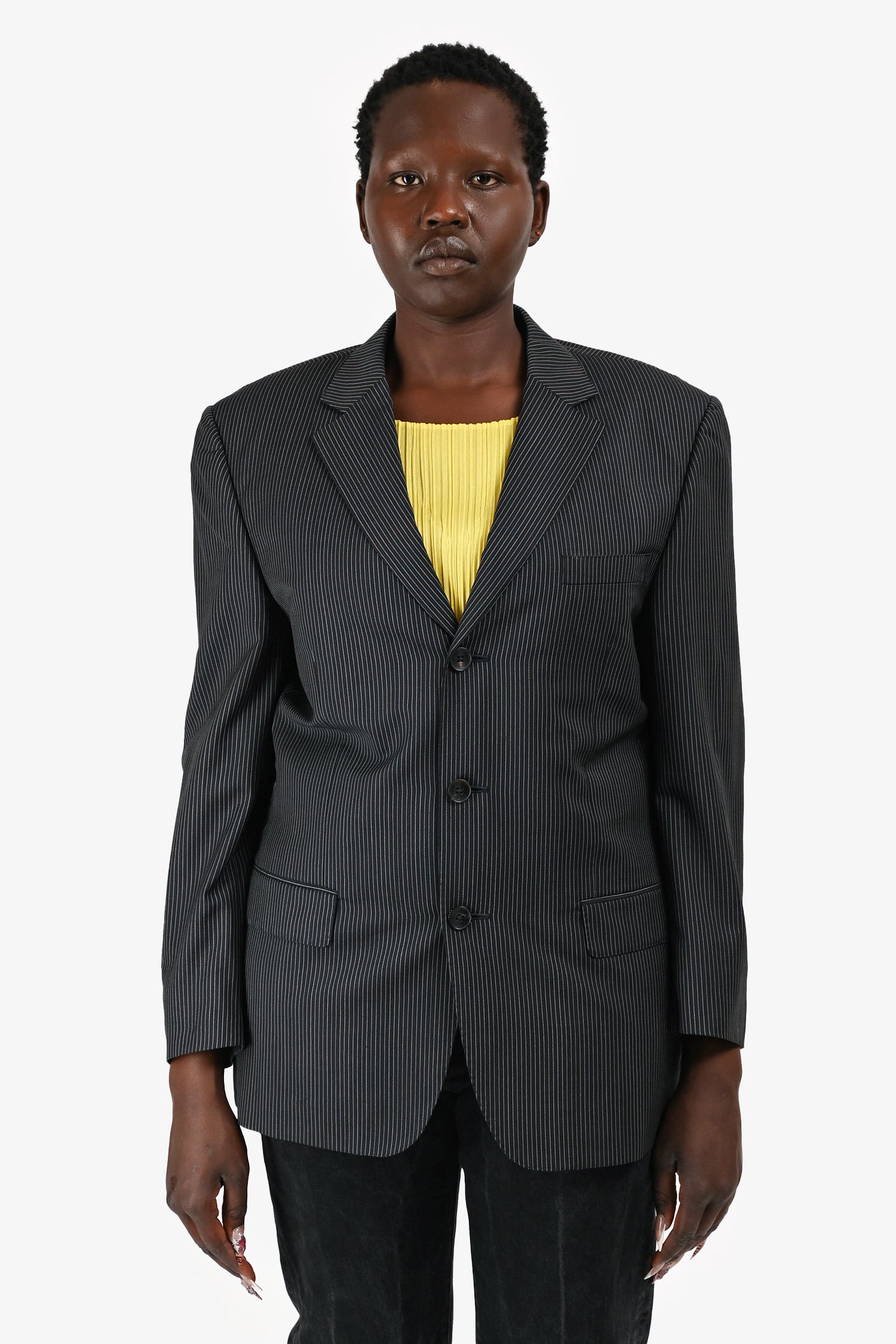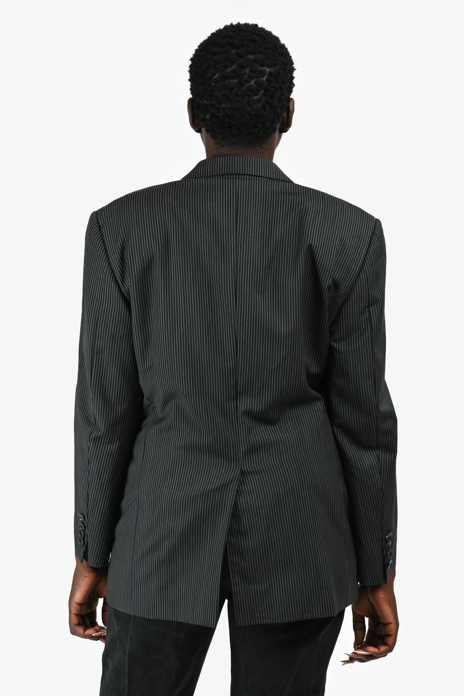 Refresh availabilityGucci Vintage Black/White Pinstripe Blazer. 3 front button closures. 3 front pockets; 1 breast and 2 hand. 4 interior slip pockets. Buttoned cuffs. Lined. Tonal stitching.