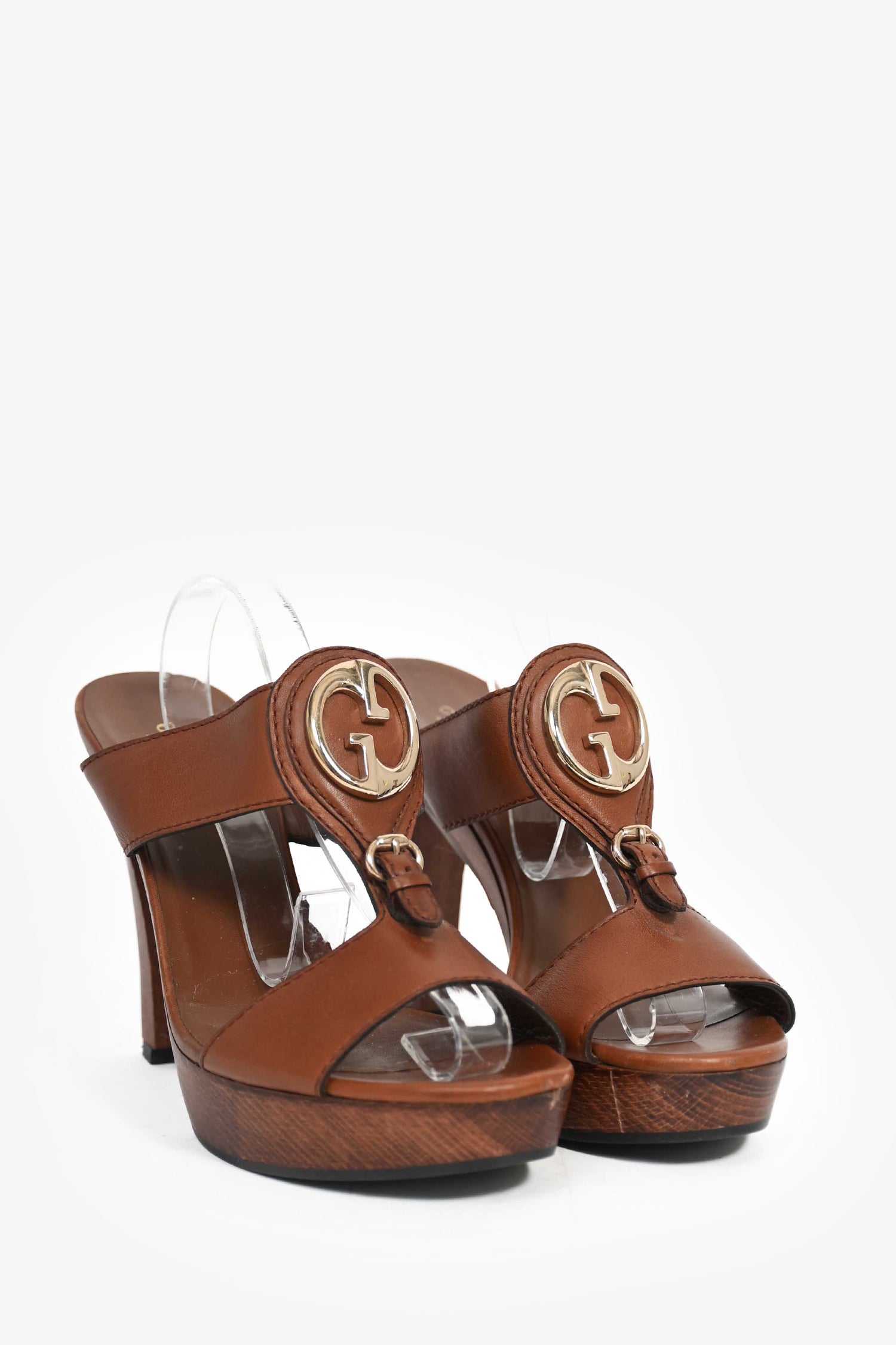 Refresh availabilityGucci Vintage Brown Leather 1973 GG Wooden Heels. Leather insoles. Gold-tone hardware. Rounded open toe. Slip-on. Tonal stitching.