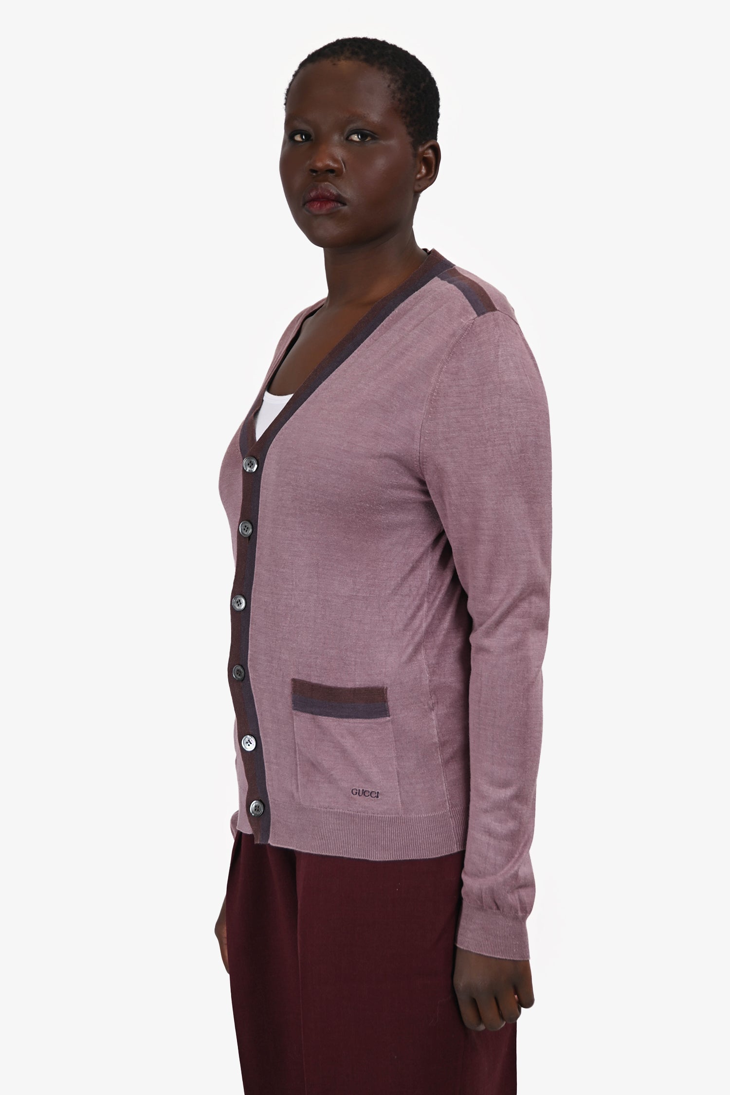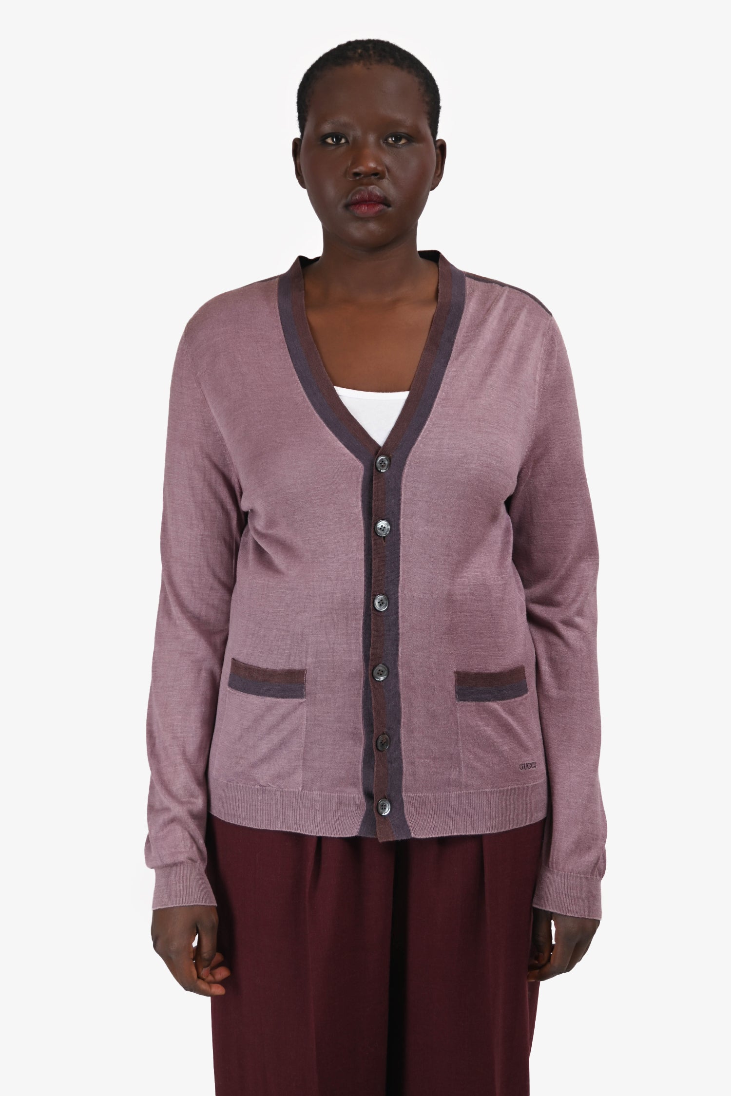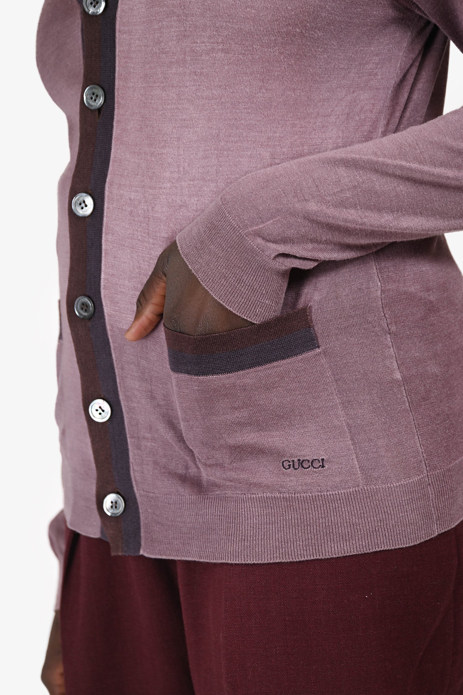 Refresh availabilityGucci Vintage Purple Silk Cardigan. Pull-on. V-neckline. Side pockets. Ribbed trim and cuffs. Tonal stitching.
