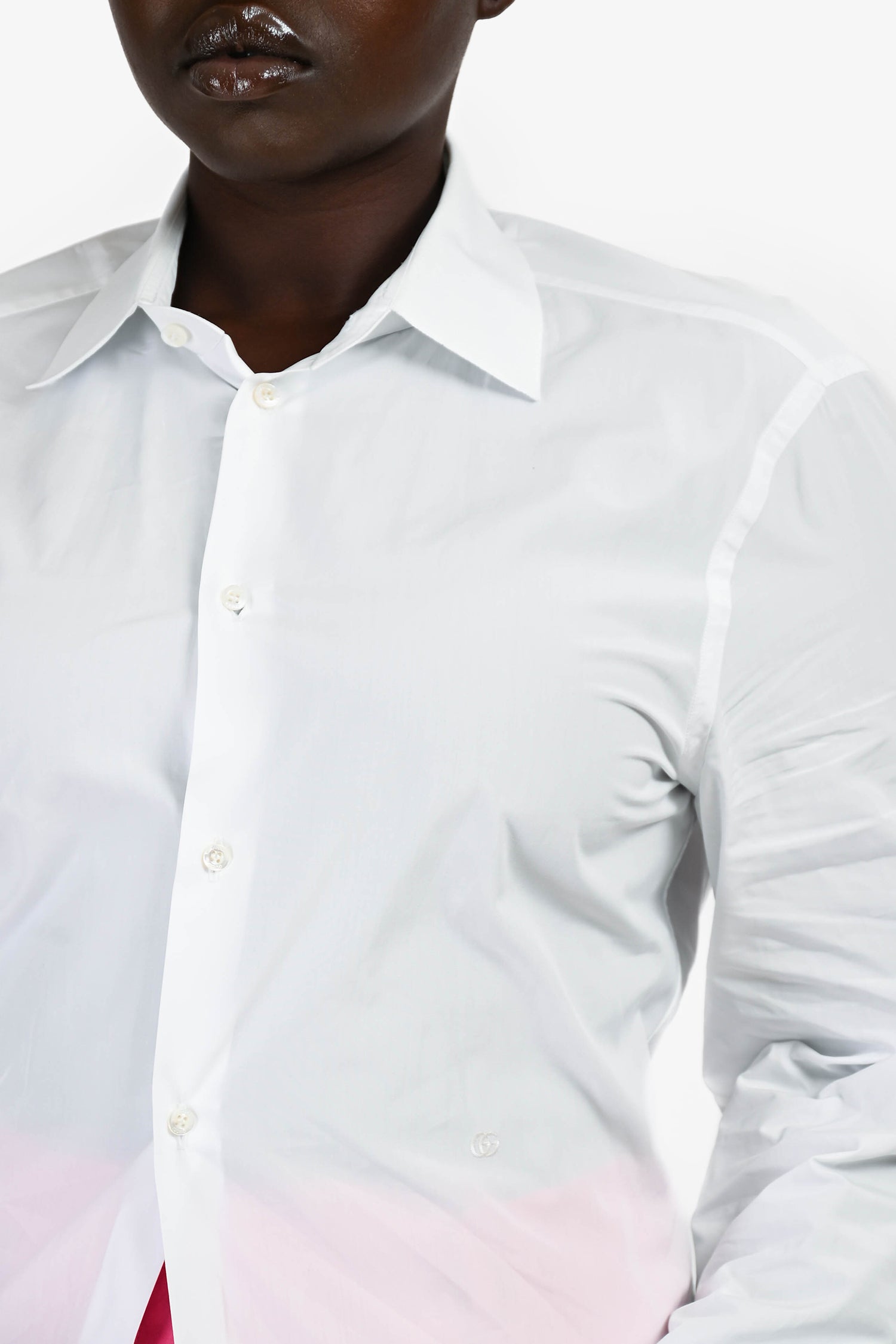 Refresh availabilityGucci White Button Up Shirt. Classic pointed collar. Long sleeves with button cuffs. Front button closure. Tonal stitching.