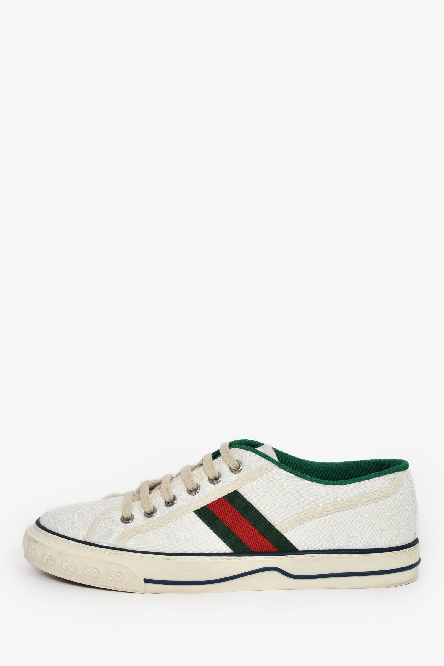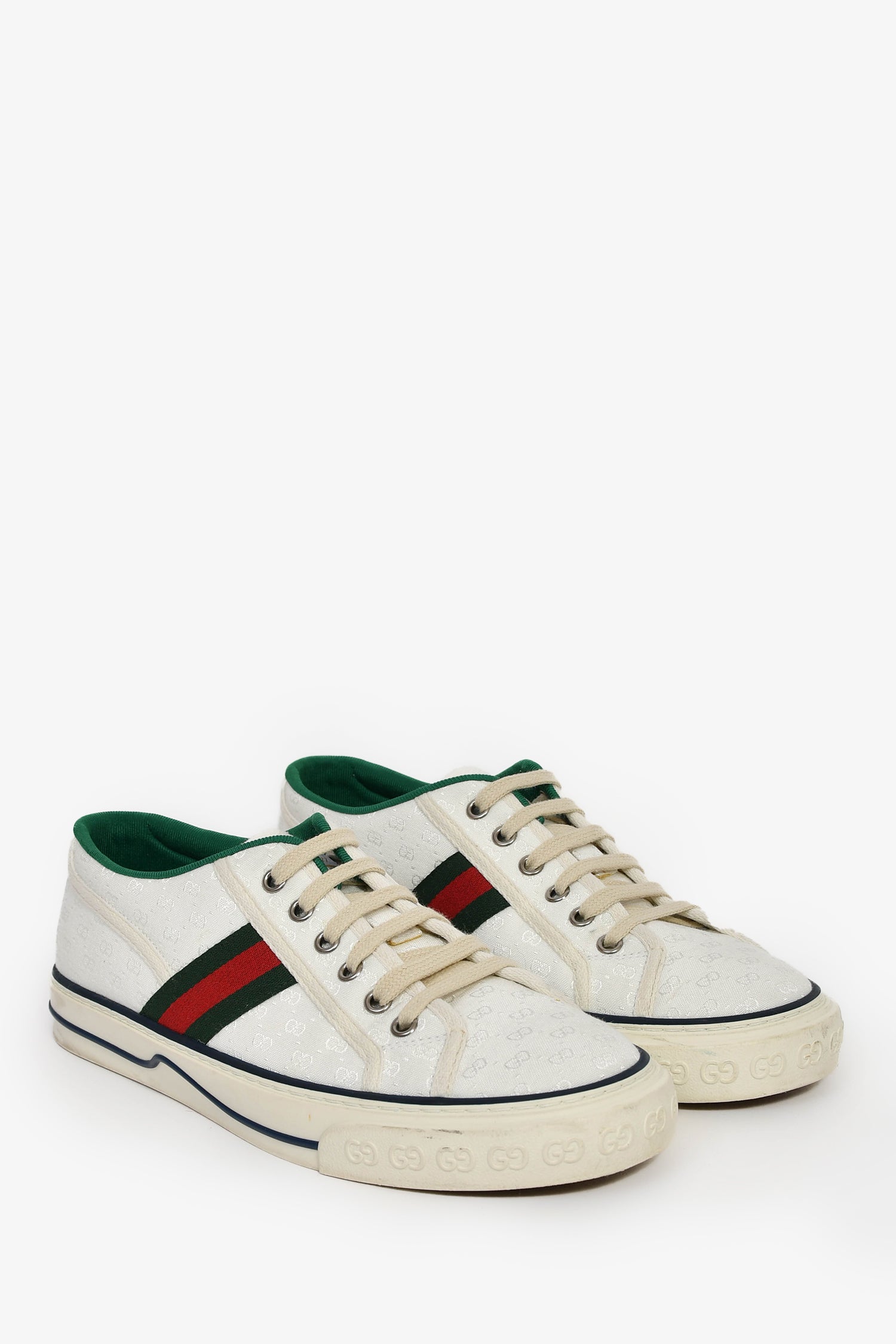 Refresh availabilityGucci White Fabric GG 'Tennis 1977' Web Sneaker. Slip-on. Round toe. Top lace-up closure. Terry insole. Silver-tone hardware. Tonal stitching.