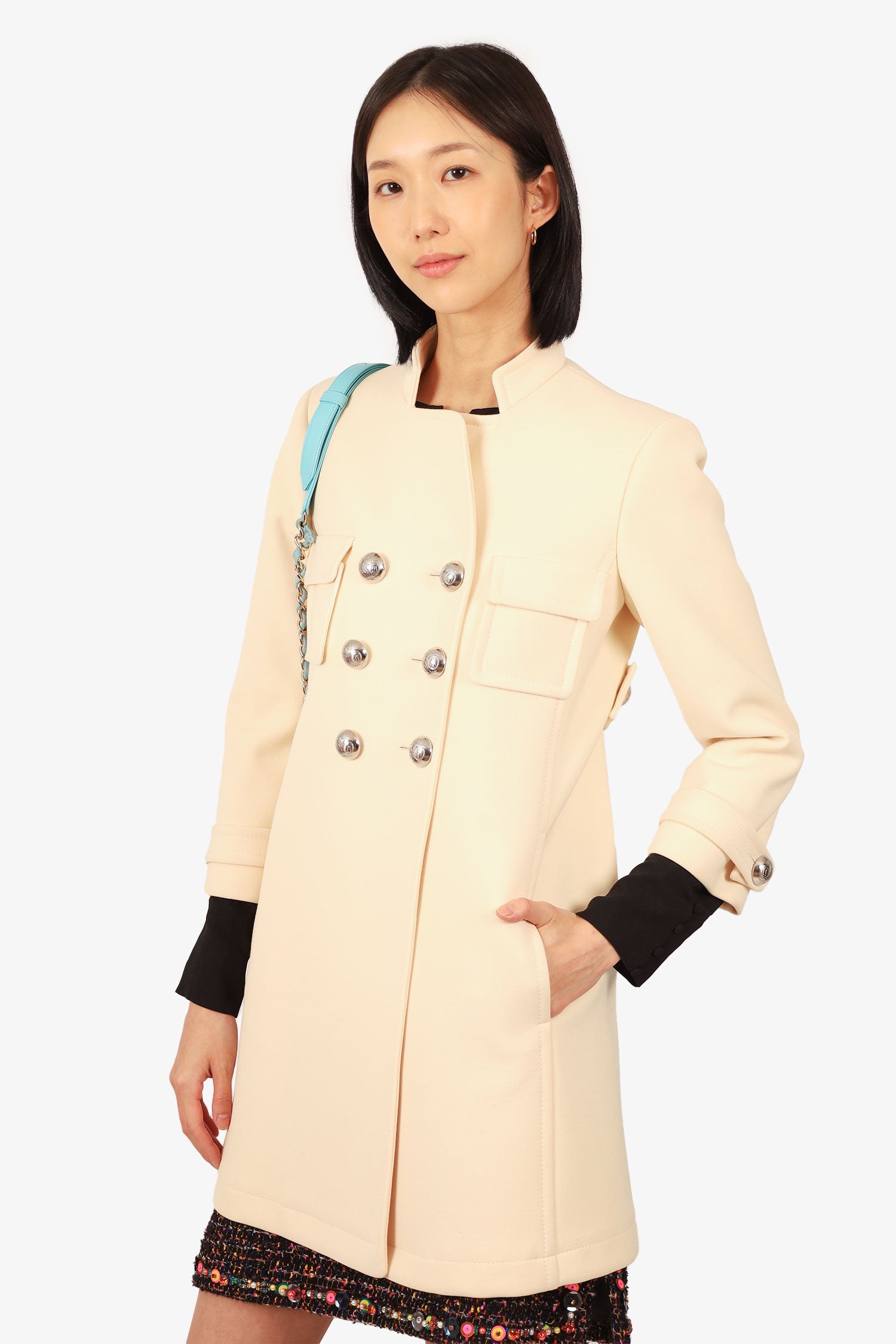 Refresh availabilityGucci White Front Pocket Detail Blazer. Squared-swan neckline. Front two-way button up closure. 4 front exterior pockets; 2 flap and 2 side slip. Removable strap with button closure at rear waistband. Attached cuff strap with button closure. Lined interior. Silver-tone hardware. Tonal stitching.