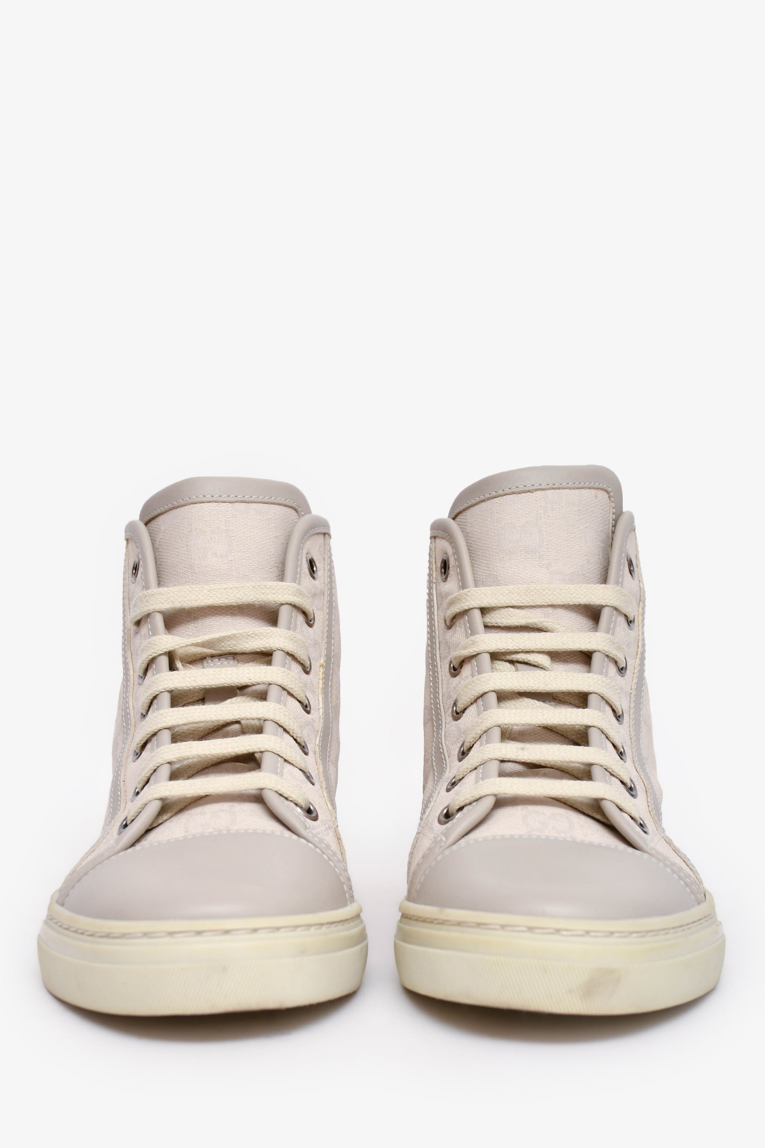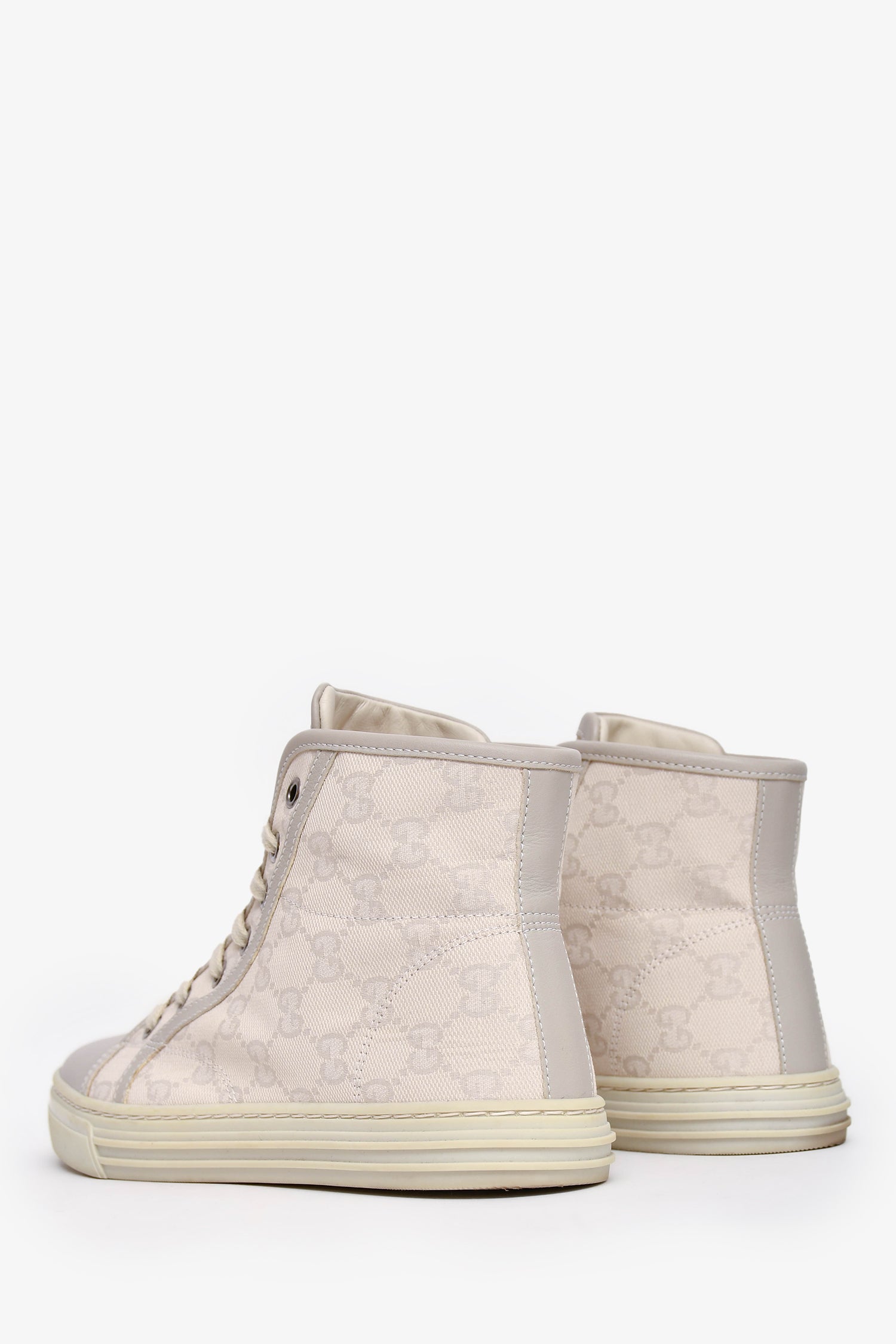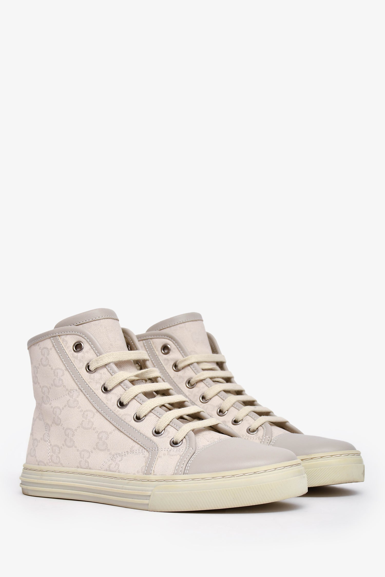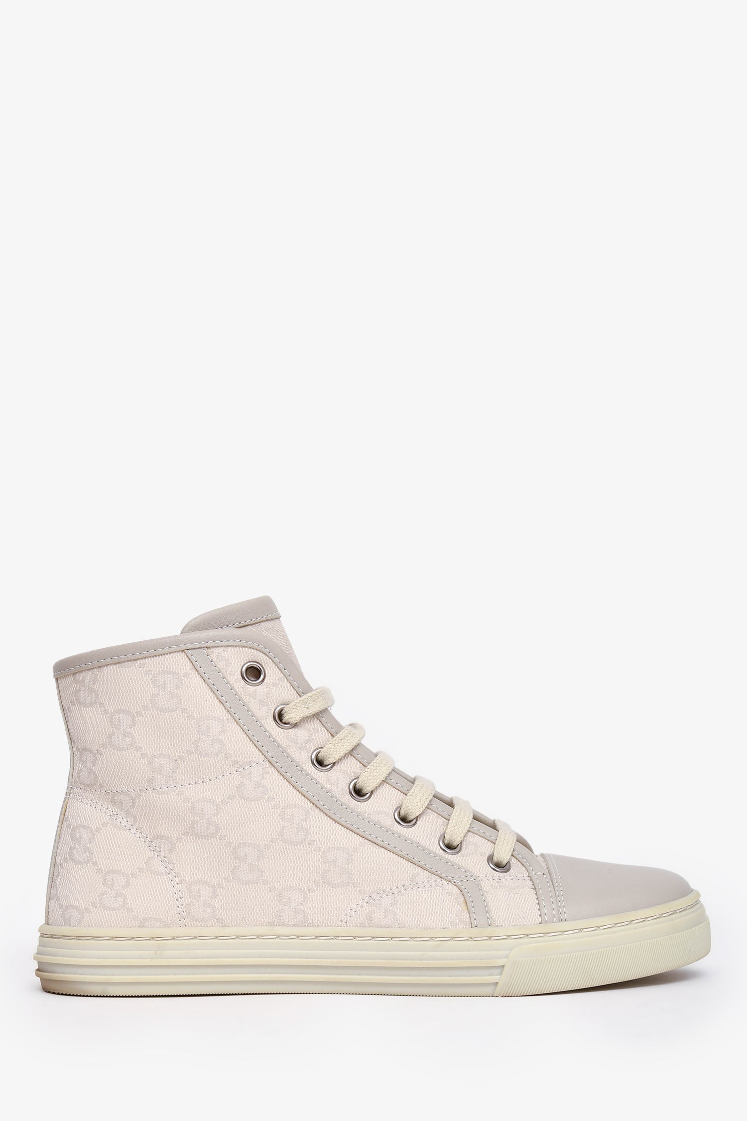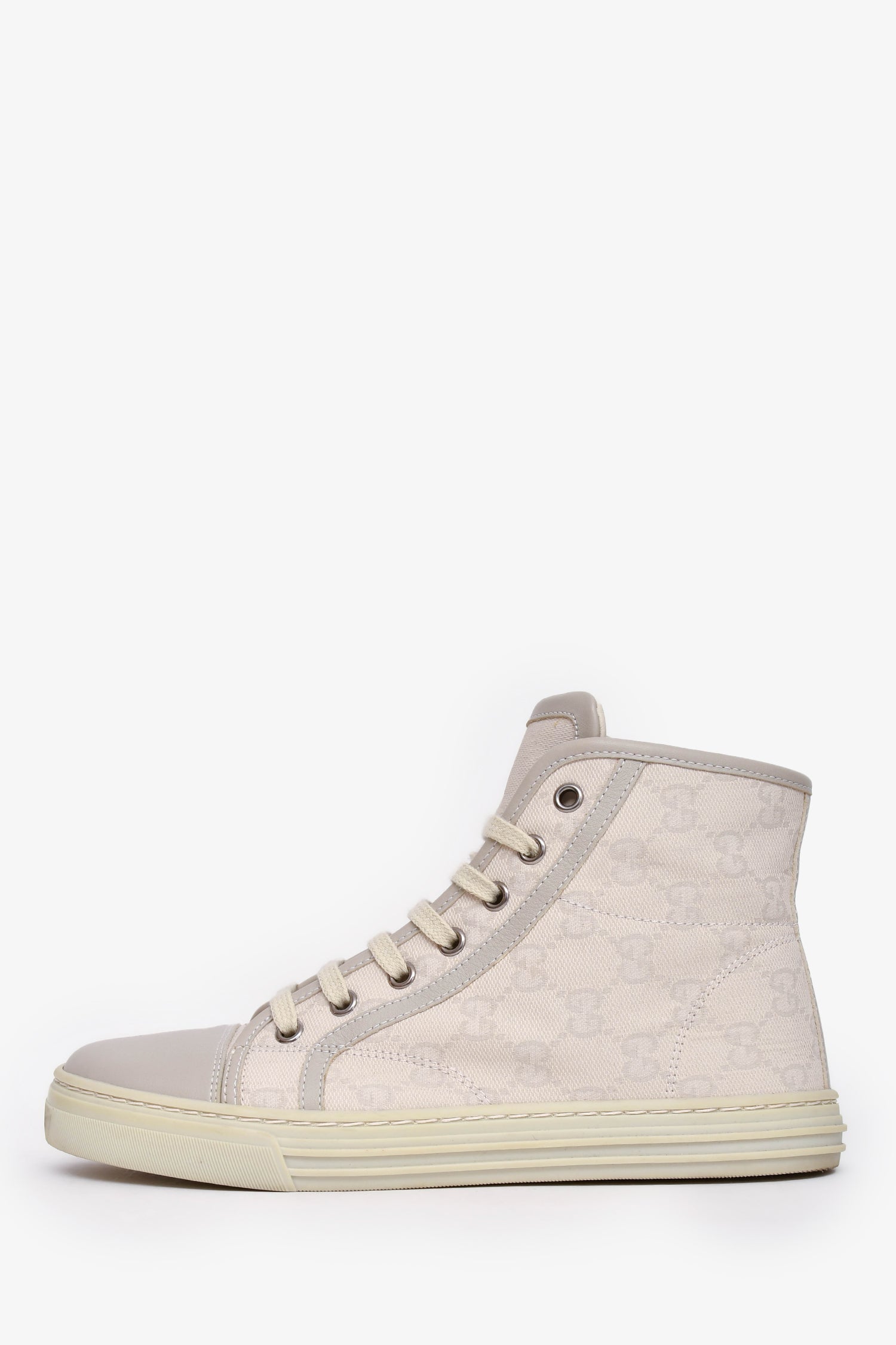 Refresh availabilityGucci White GG Canvas High Top Sneakers. Front lace-up closure. Silver-tone hardware. Tonal stitching.