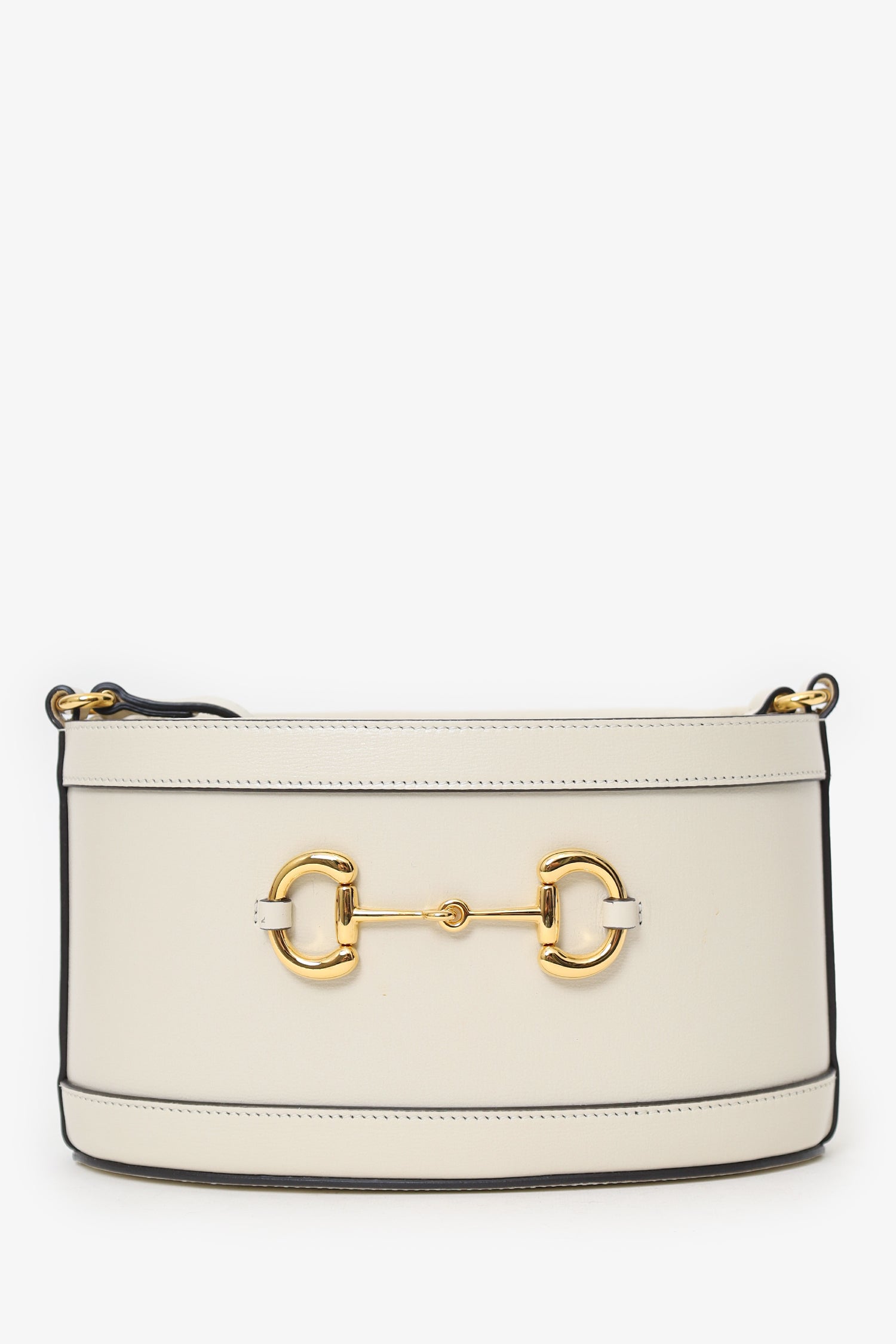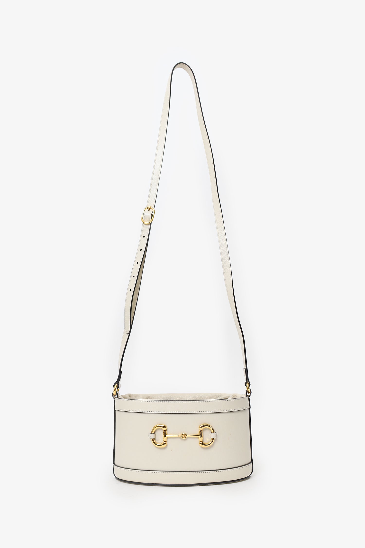 Refresh availabilityGucci White Leather 1955 Horsebit Drawstring Bucket Bag. Top cinching closure with drawstrings. Crossbody adjustable strap. Suede lined interior. Single interior rear wall slip pocket. Gold-tone hardware. Tonal stitching.