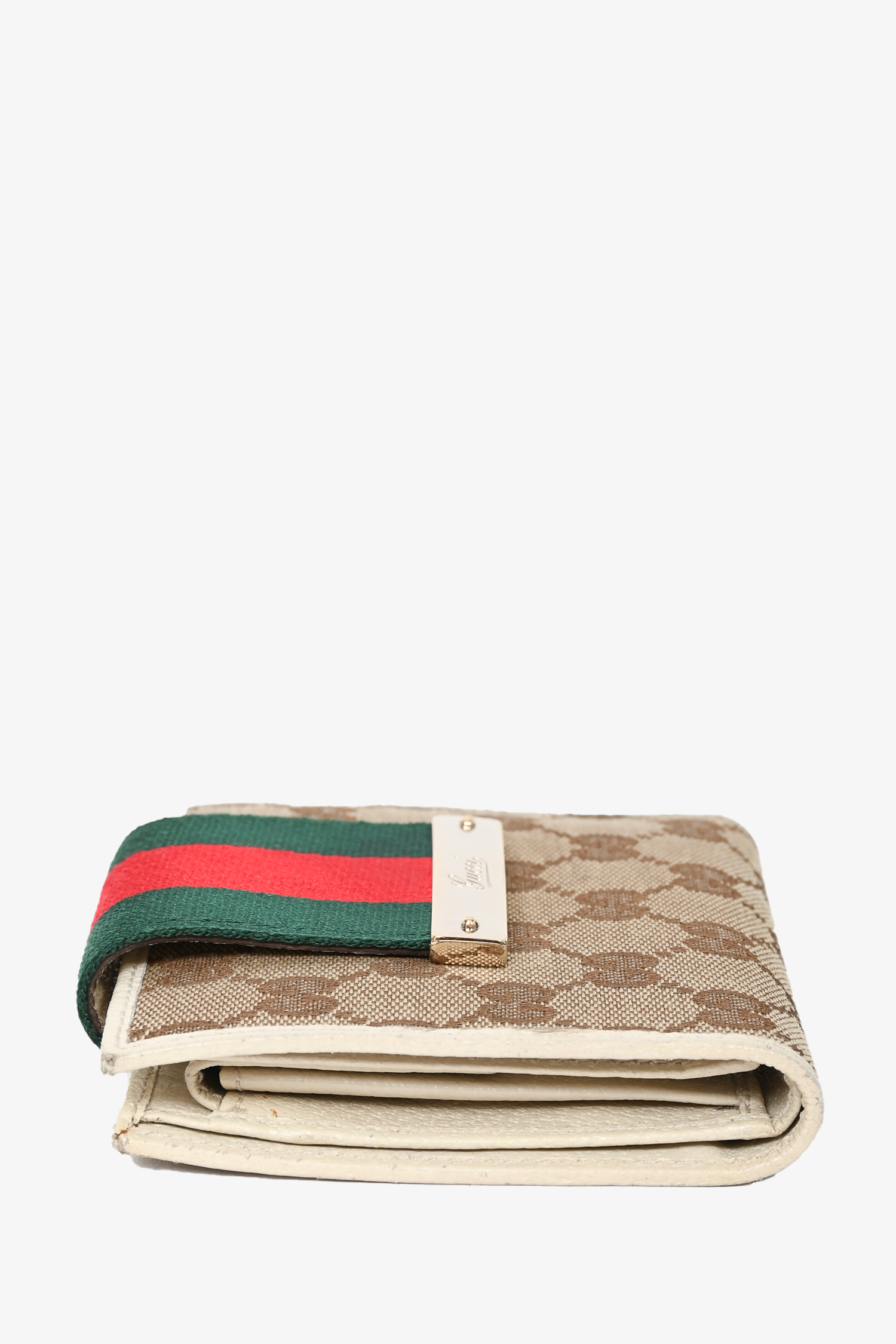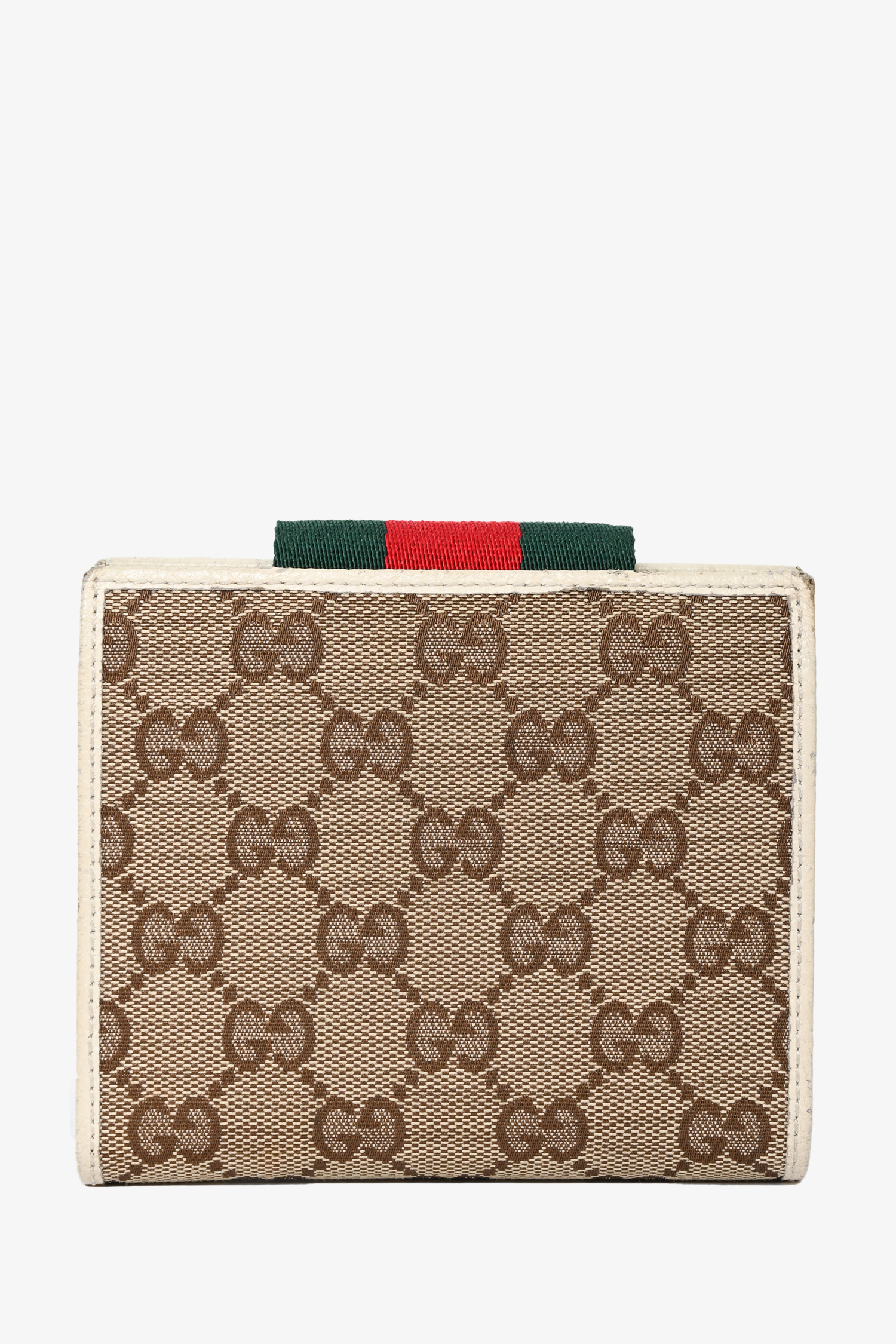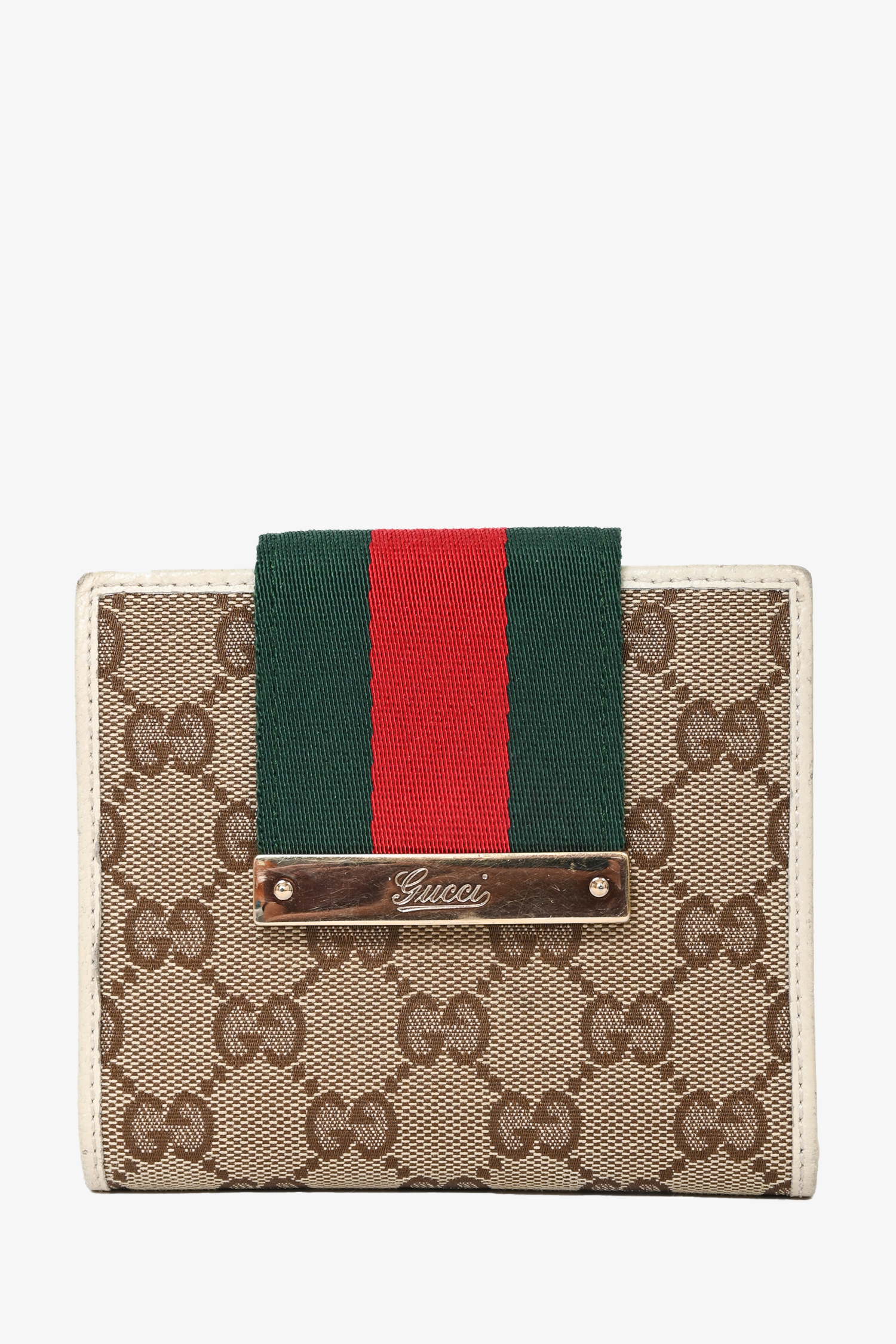 Refresh availabilityGucci White Leather/Canvas GG Supreme Horsebit Compact Wallet. Front fold-over strap with snap-button closure. 6 card slots. 1 billfold compartment. 1 coin compartment with front fold-over strap. Gold-tone hardware. Tonal stitching.