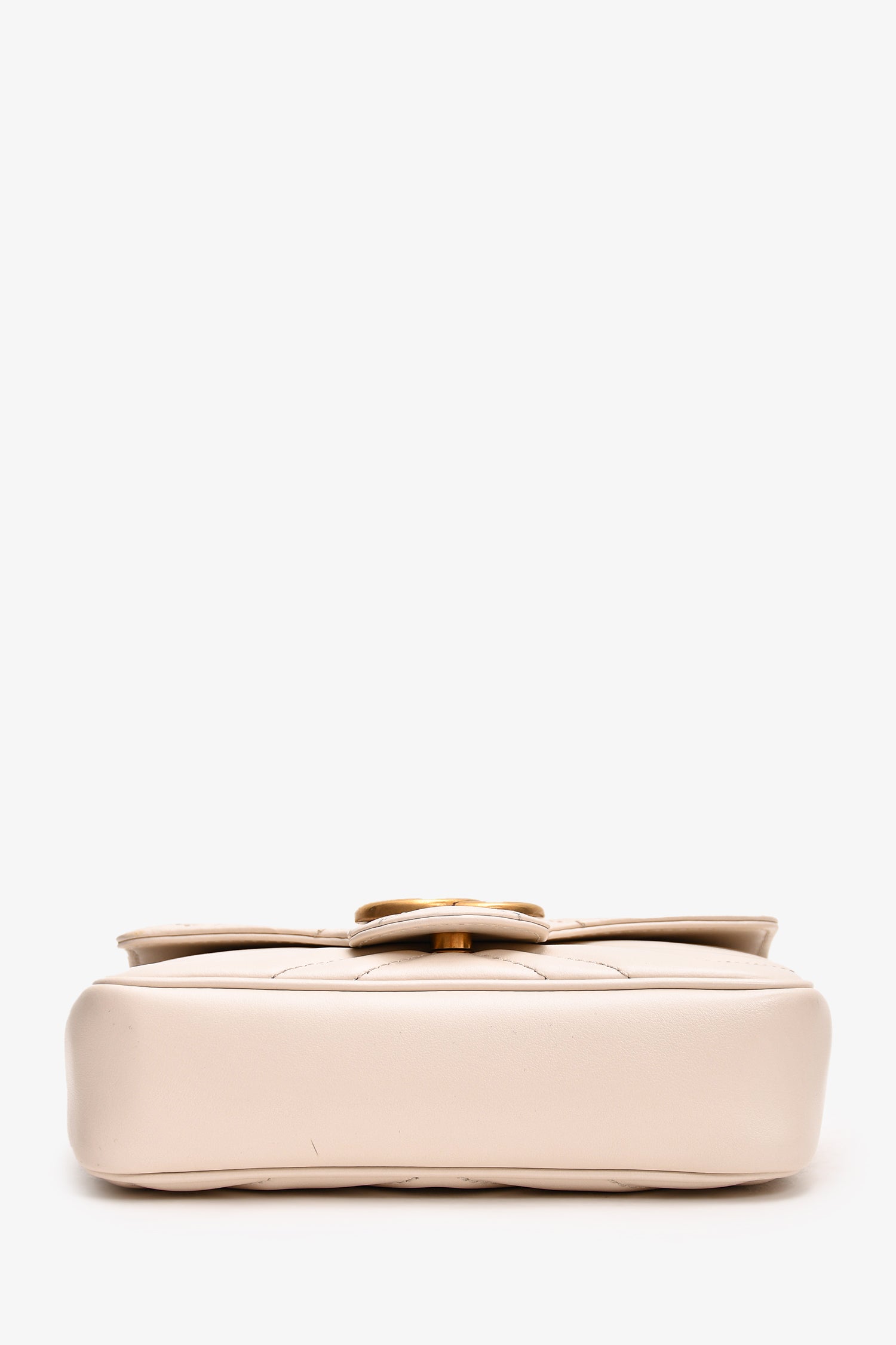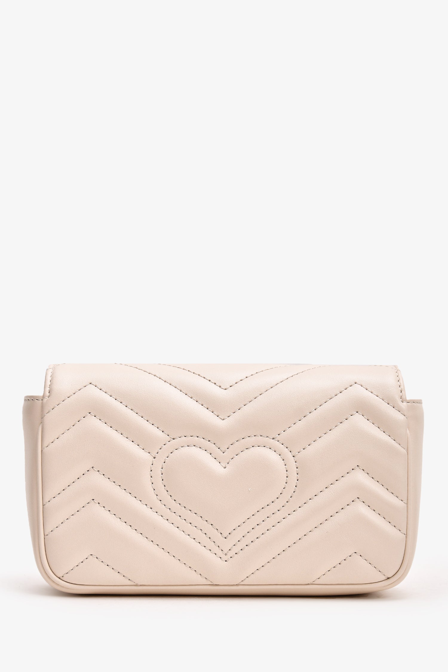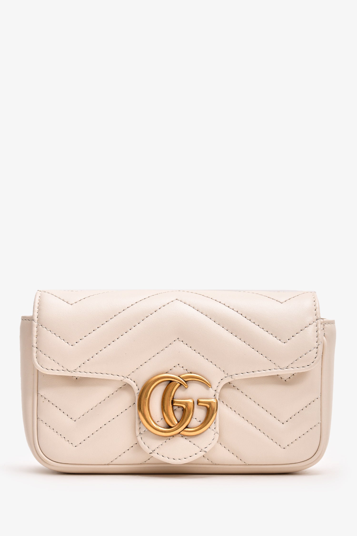 Refresh availabilityGucci White Leather Chevron Quilted GG Marmont Super Mini Bag. Front fold over flap with snap closure. Textile interior lining. Removable chain. Interior key leash. Gold-tone hardware. Tonal stitching.