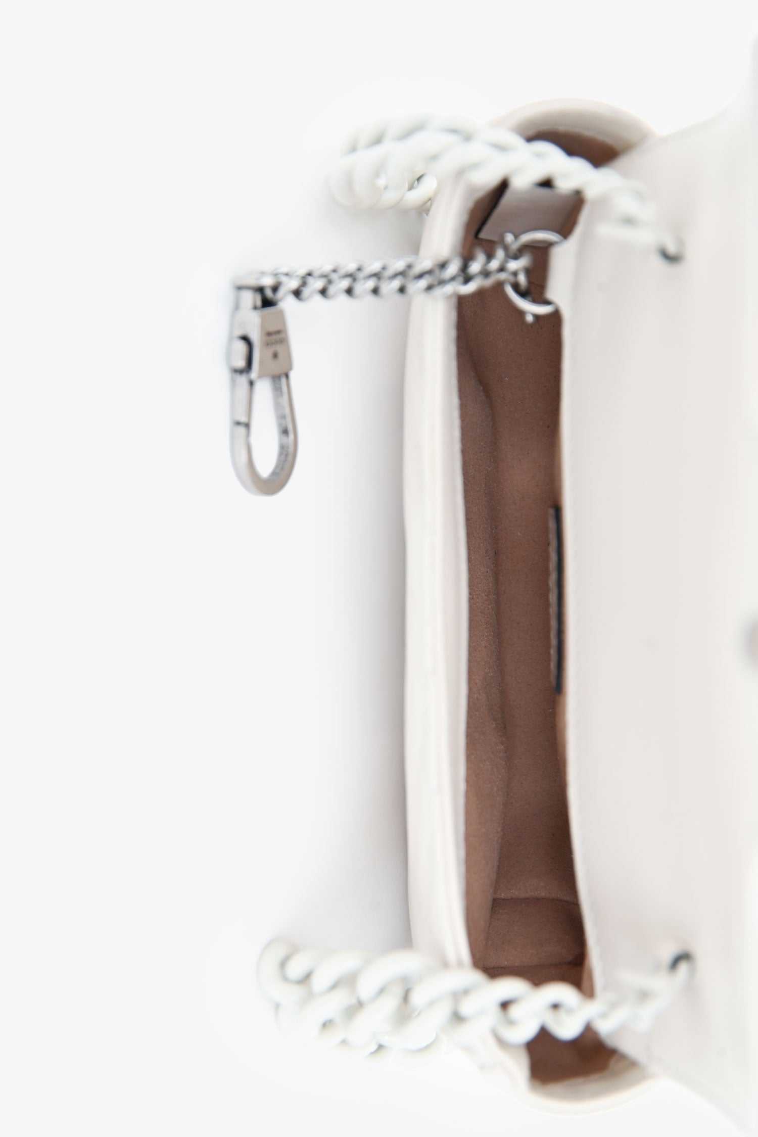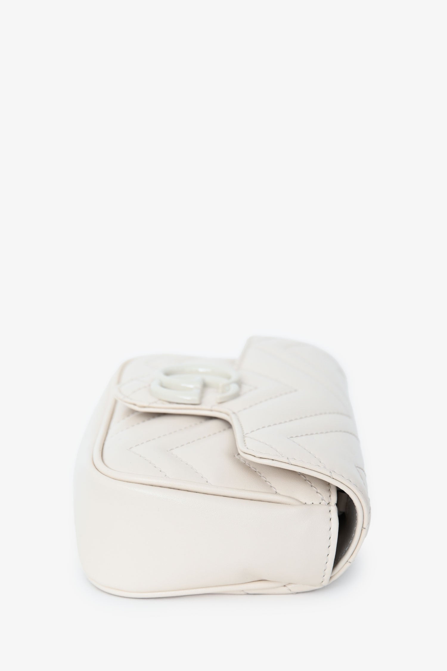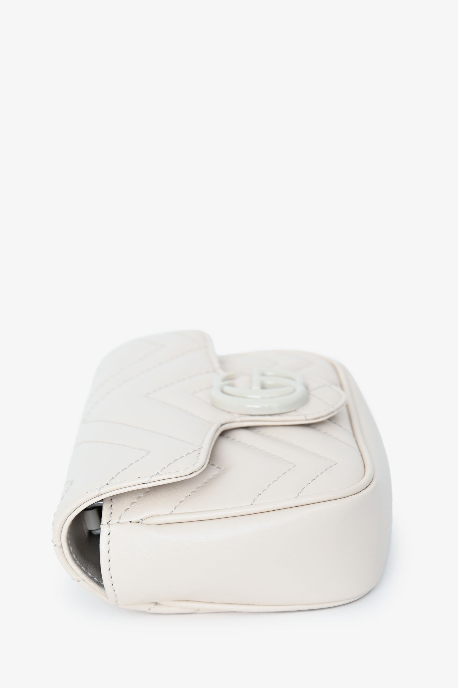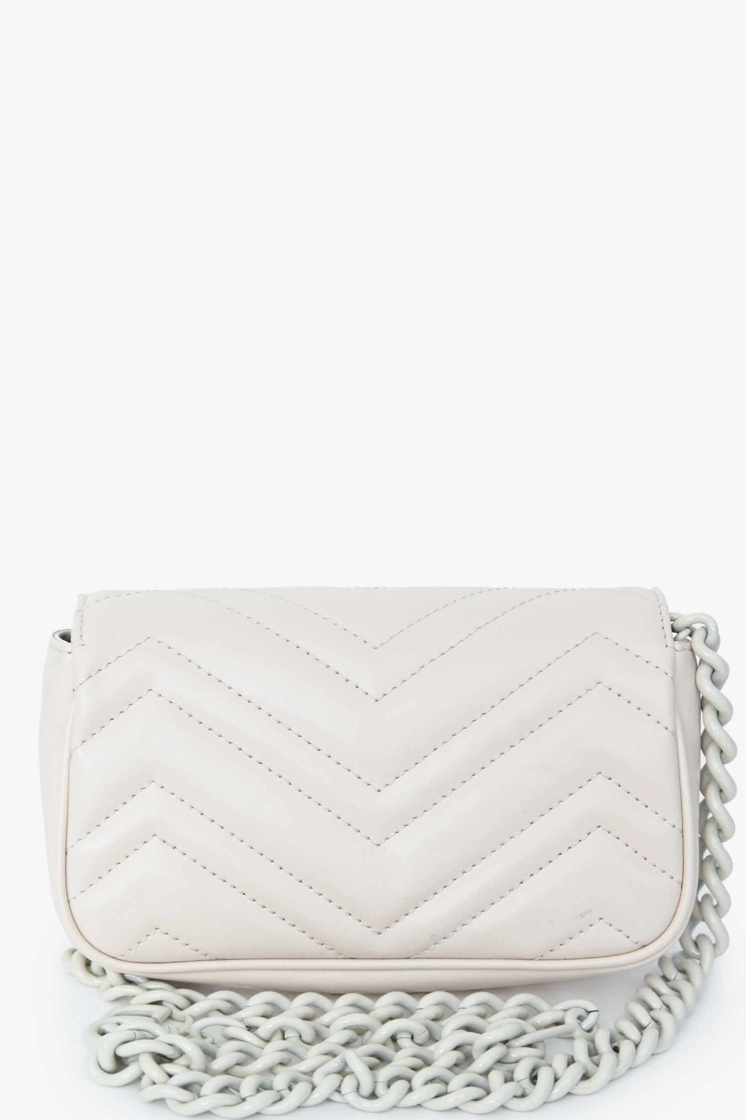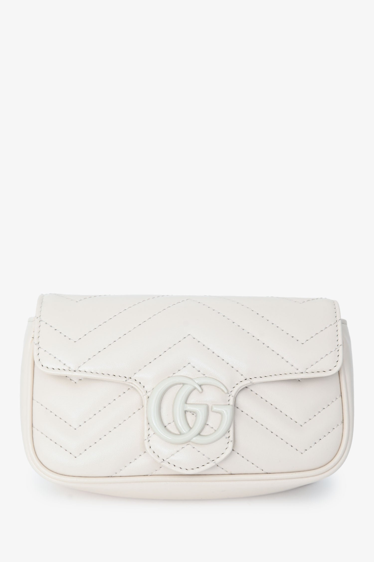 Refresh availabilityGucci White Leather Chevron Quilted Super Mini GG Marmont Belt Bag. Front fold-over flap with snap-button closure. Chainlink belt strap. Single interior compartment. Suede-lined interior. Tonal hardware. Tonal stitching.