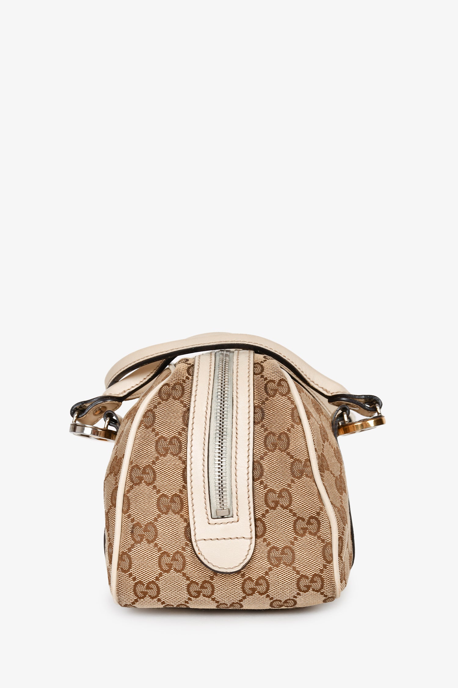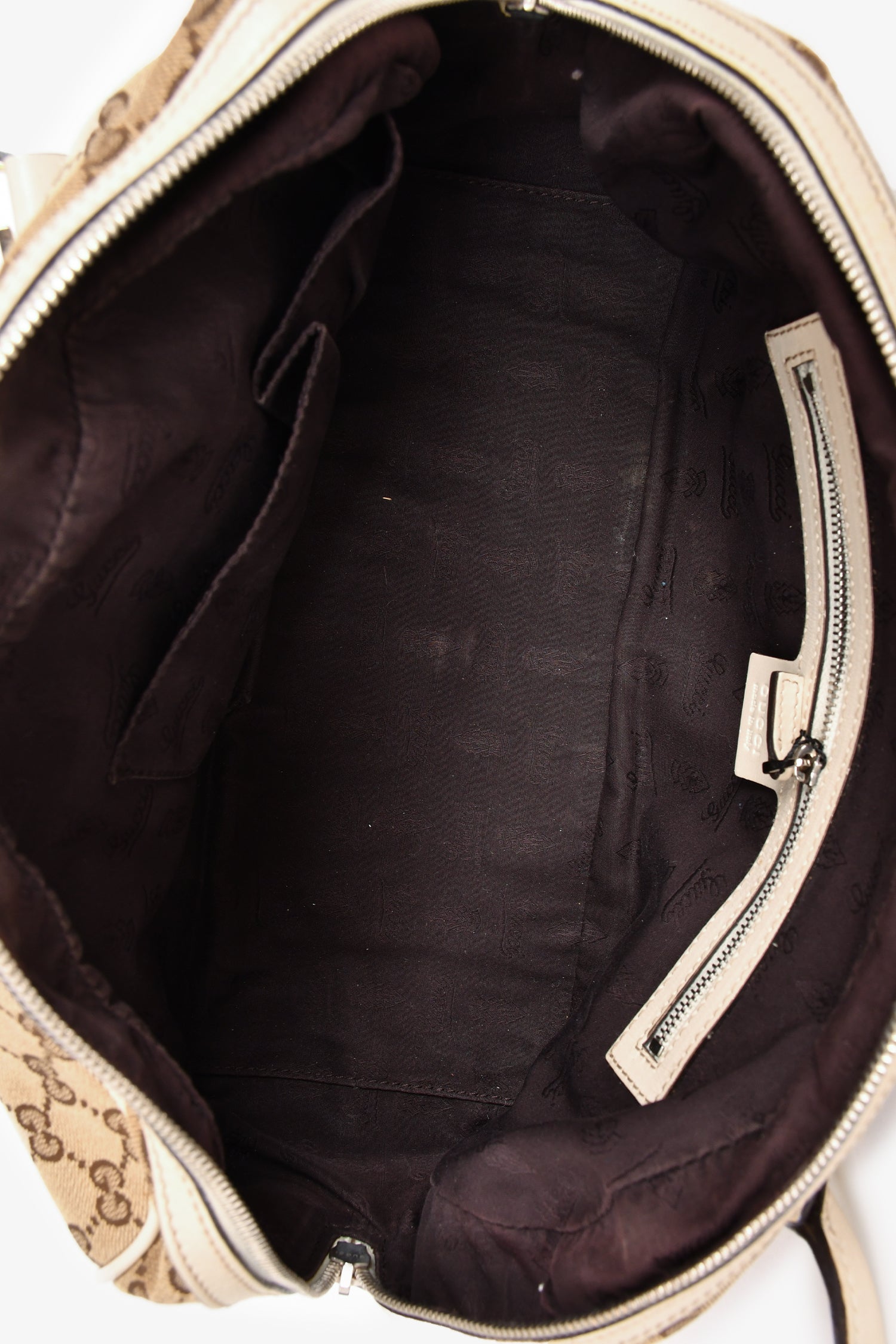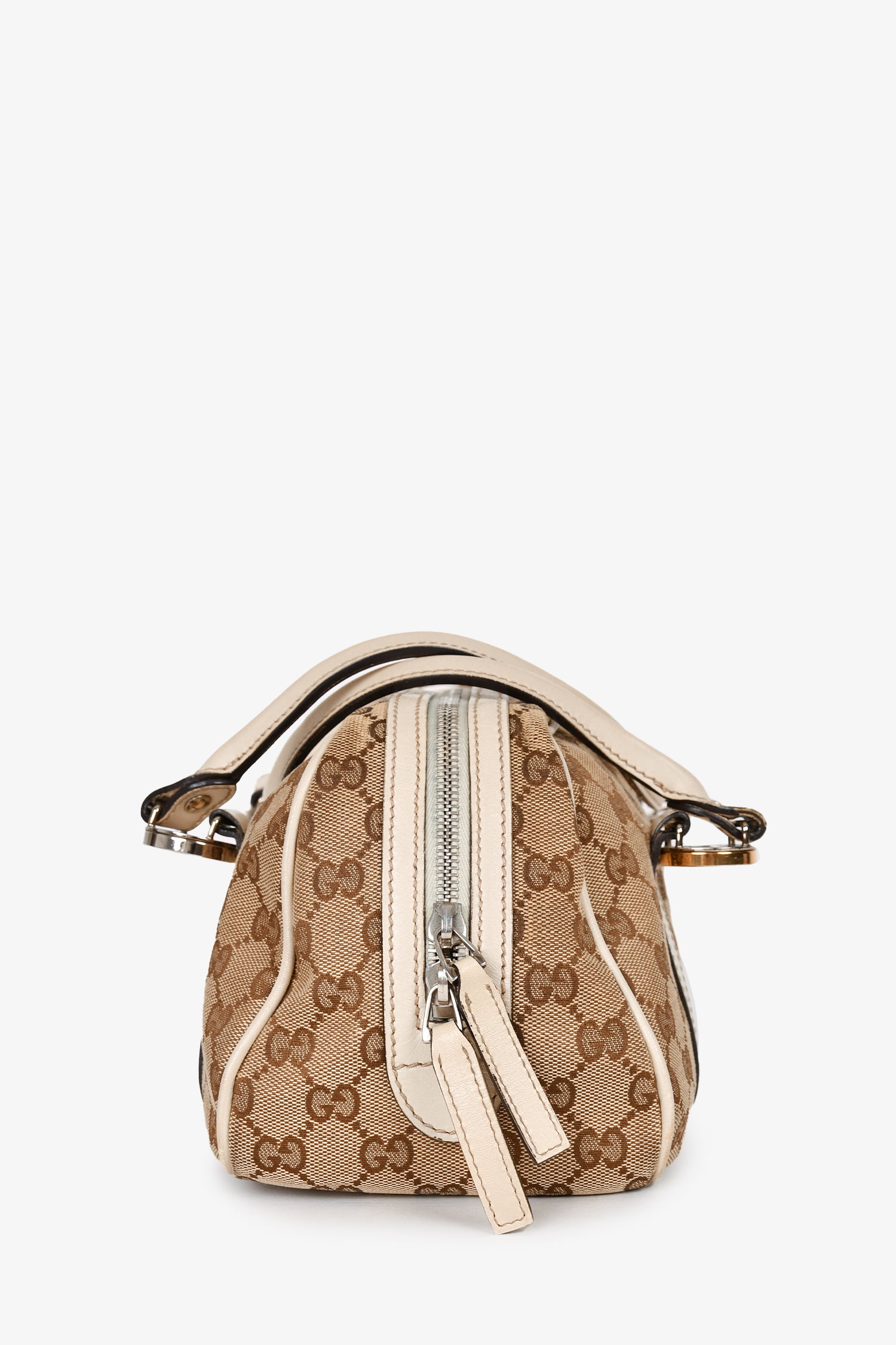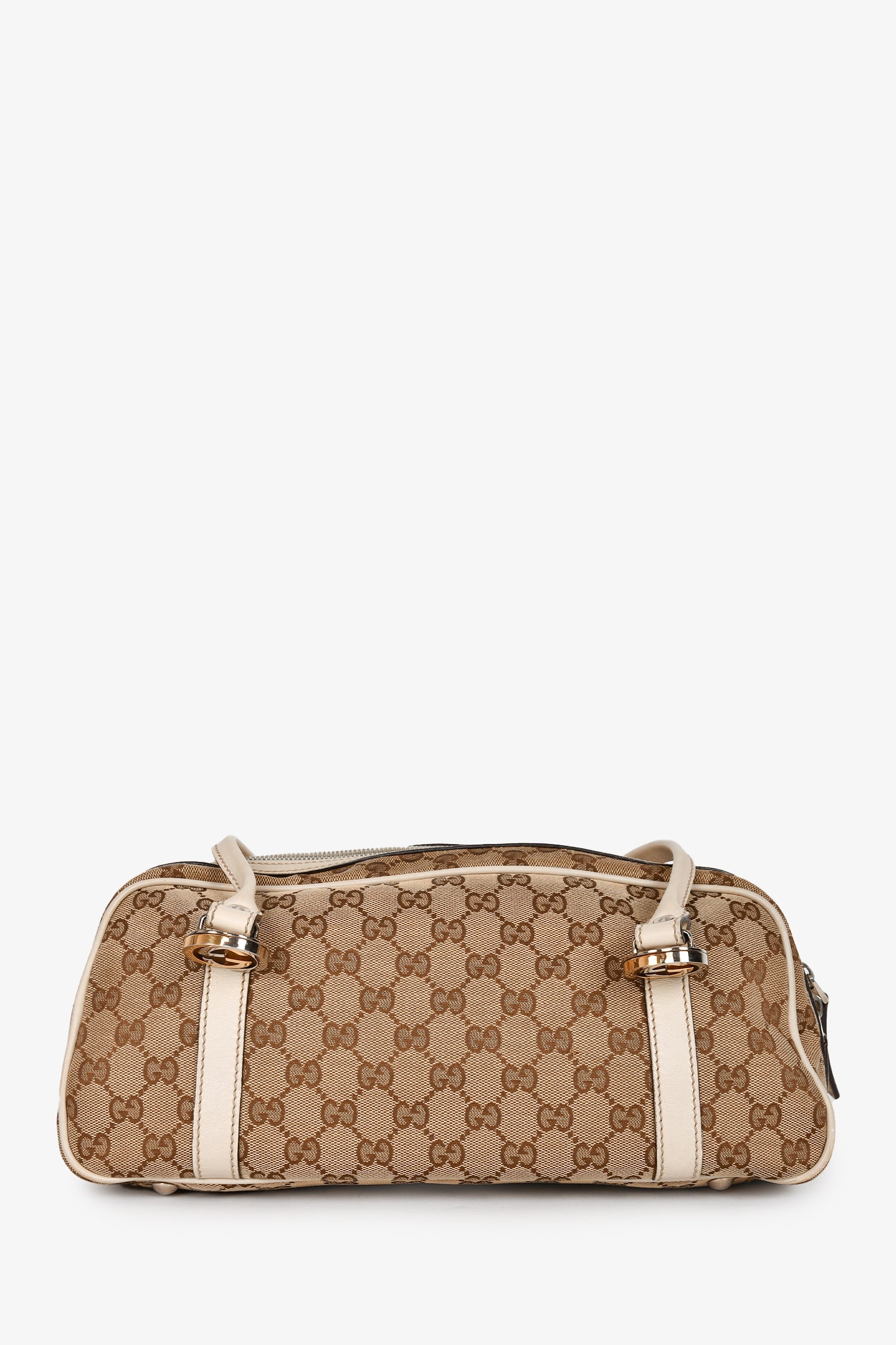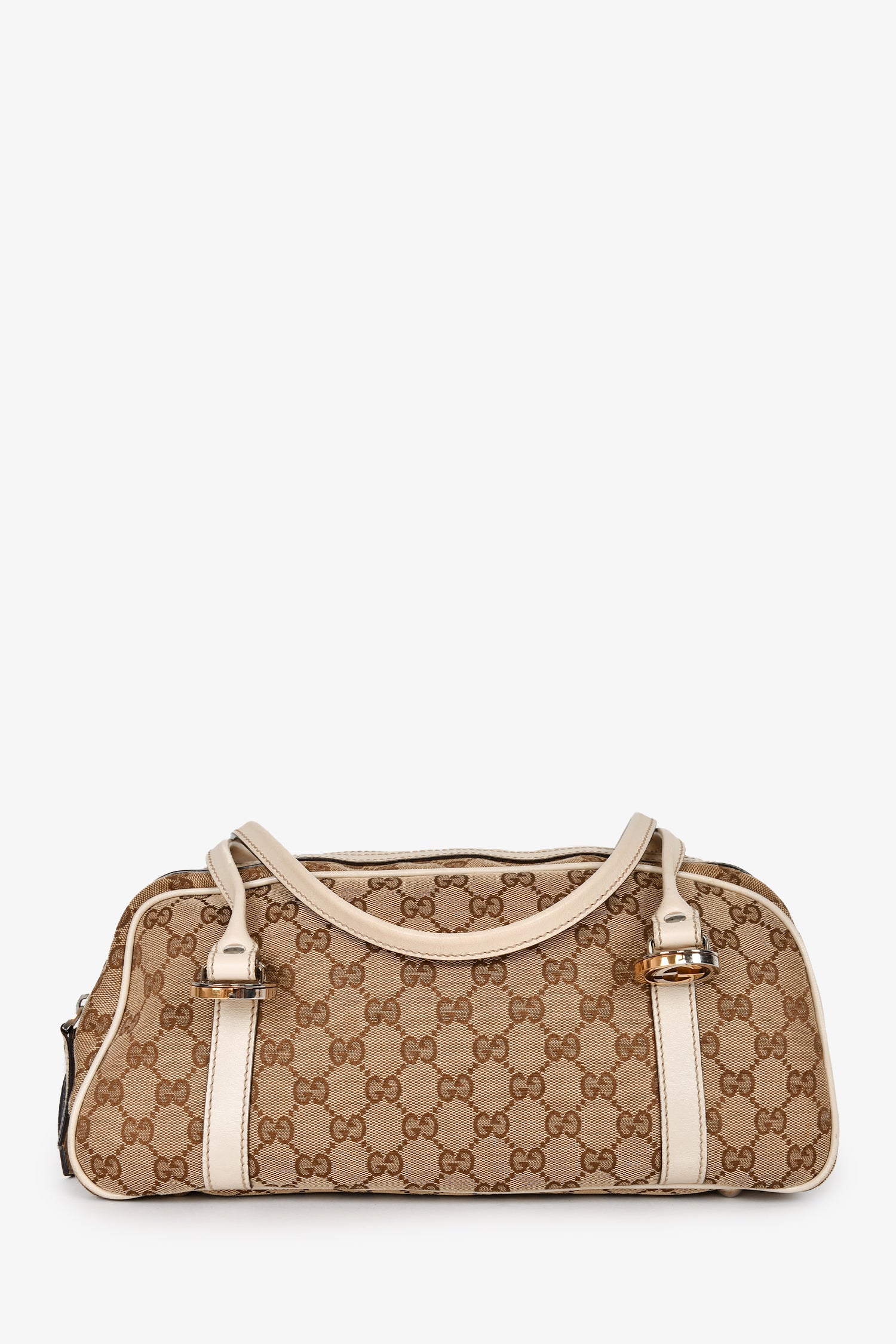 Refresh availabilityGucci White Leather GG Supreme Canvas Twins Boston Bag. Dual handles. Top two-way zip closure. Dark brown textile logo'd interior lining. 3 interior wall pockets; 2 slip and 1 with zip closure. Protective metal bottom. Gold and silver-tone hardware. Tonal stitching.