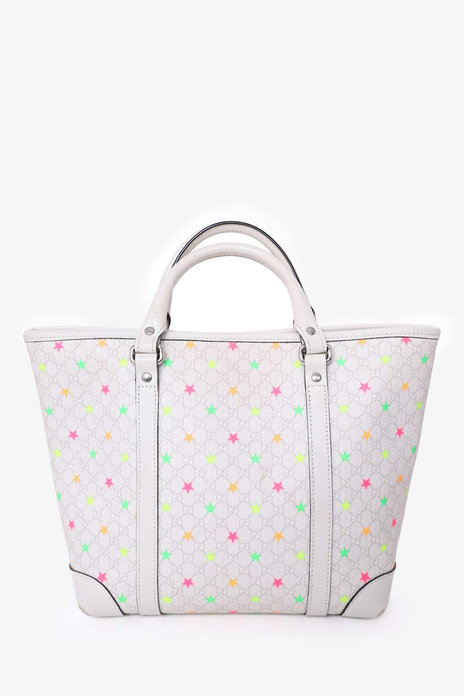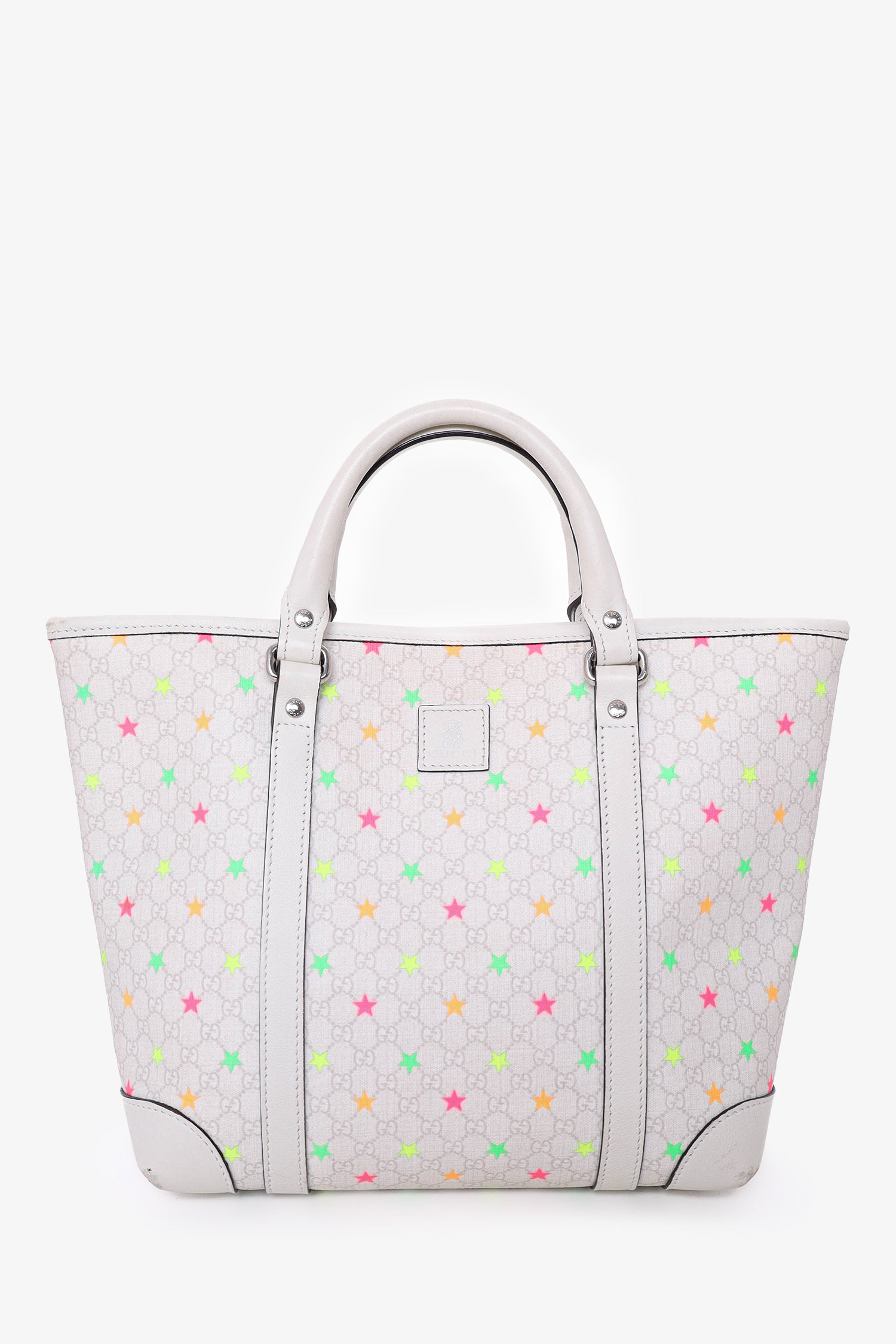 Refresh availabilityGucci White Leather GG Supreme Multicoloured Stars Micro Tote Kids. Top handles. Open top with single magnet button closure. Single interior wall slip pocket. Silver-tone hardware. Tonal stitching.