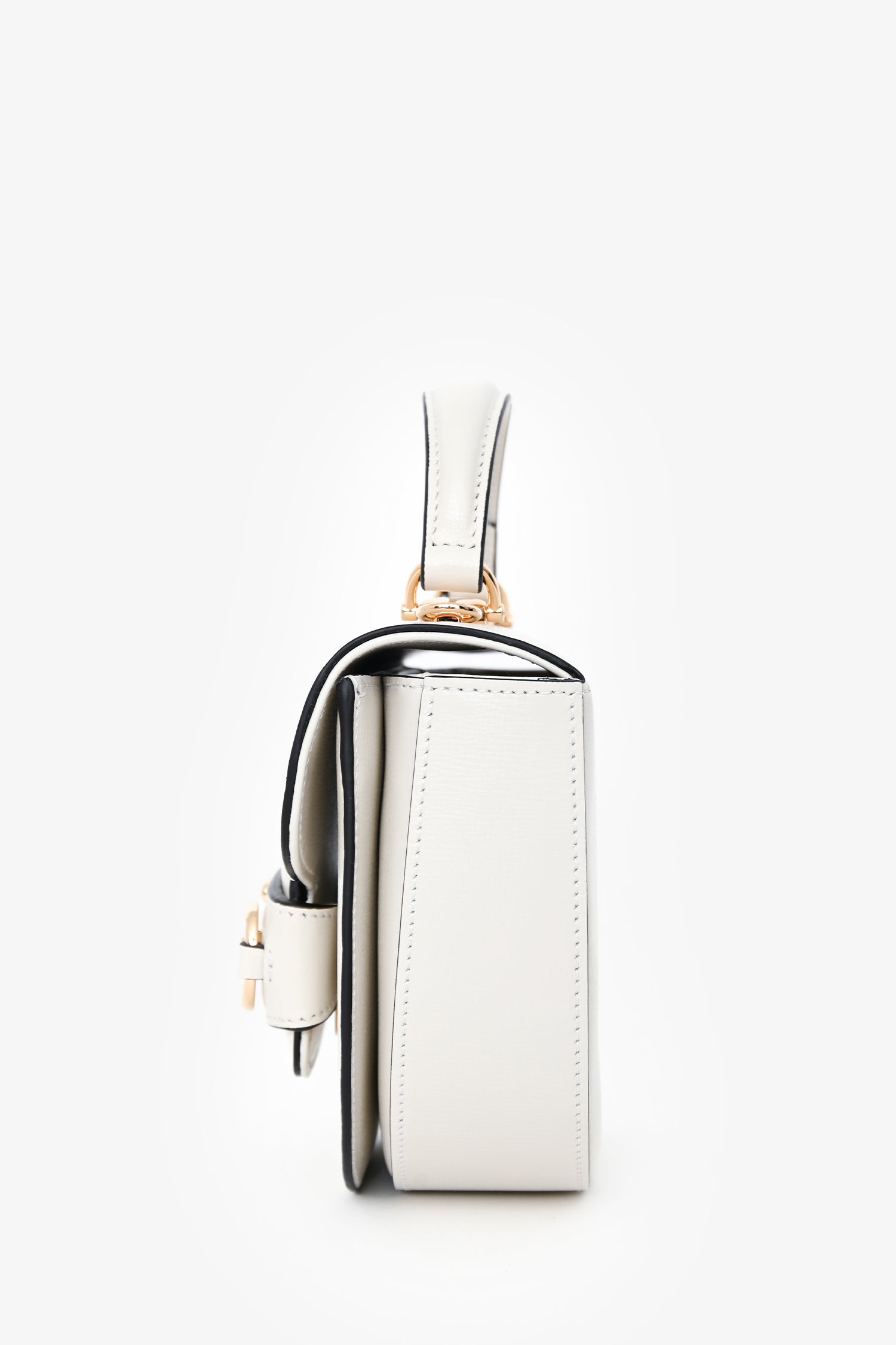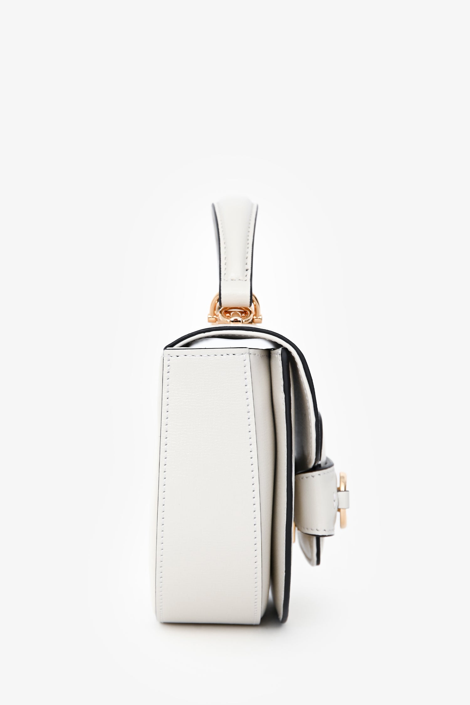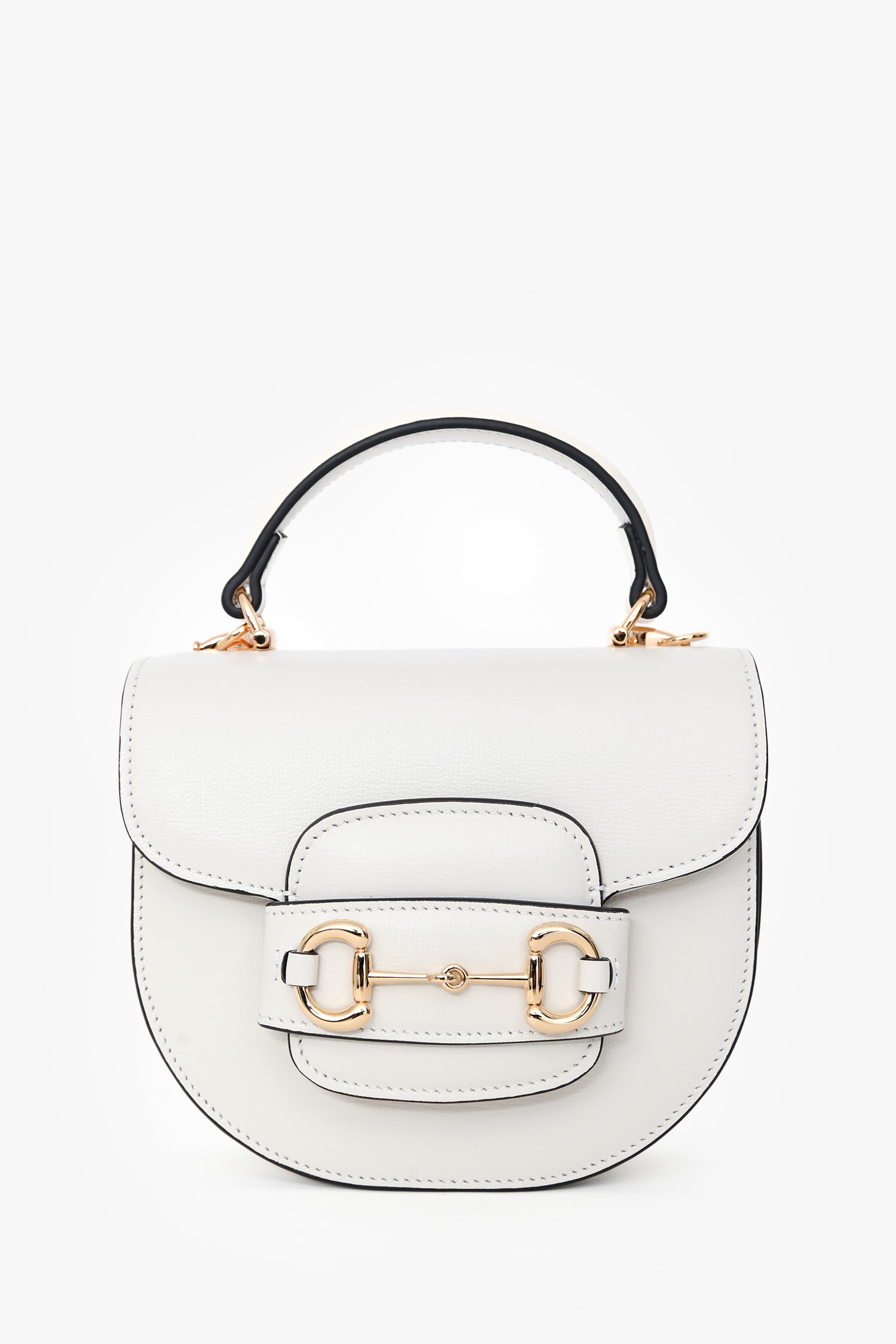 Gucci White Leather 'Horsebit 1955' Mini Crossbody Bag. Front fold-over flap with snap button closure. Single top handle. Detachable and adjustable crossbody strap. 2 interior compartments. Textile-lined. Gold-tone hardware. Tonal stitching.