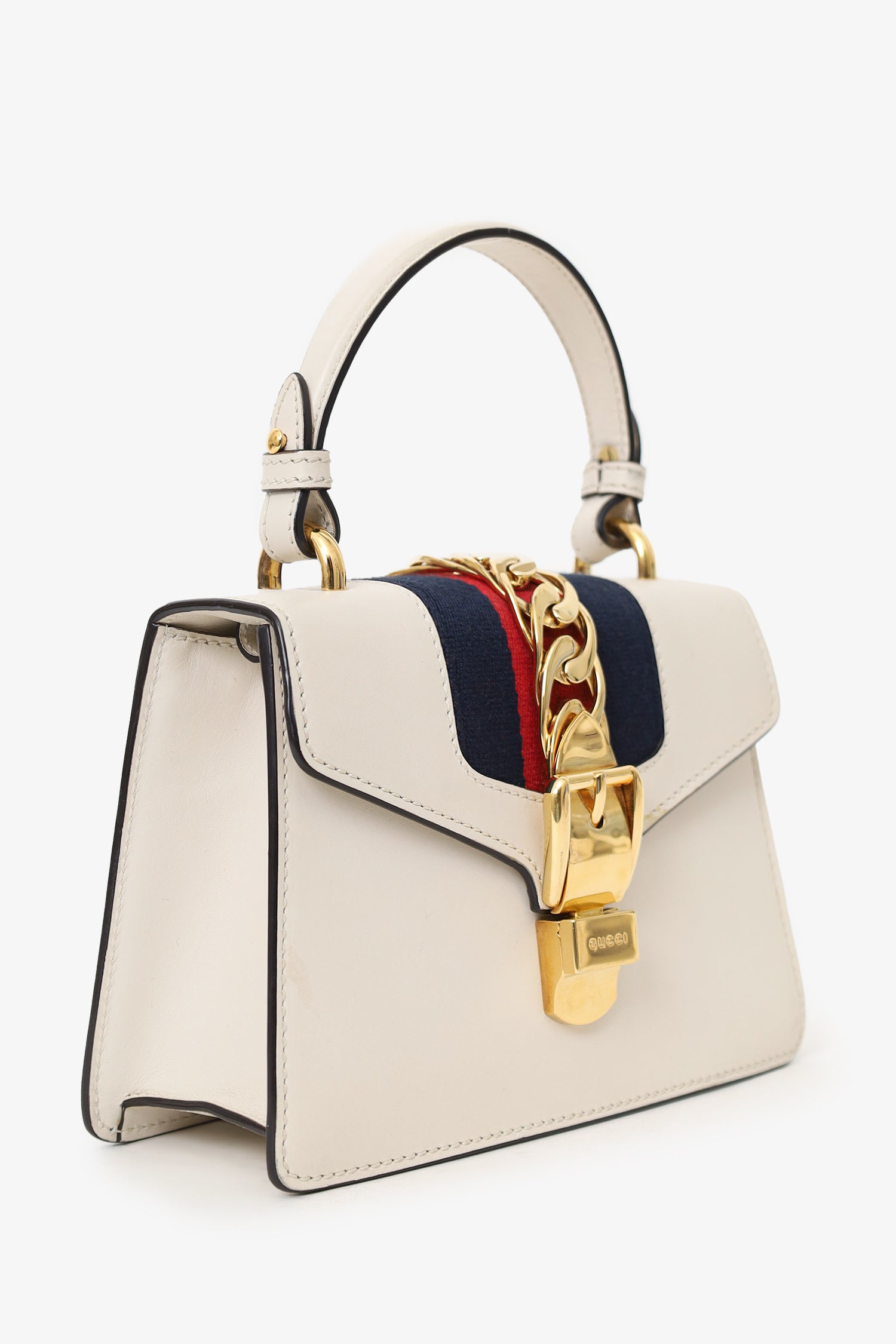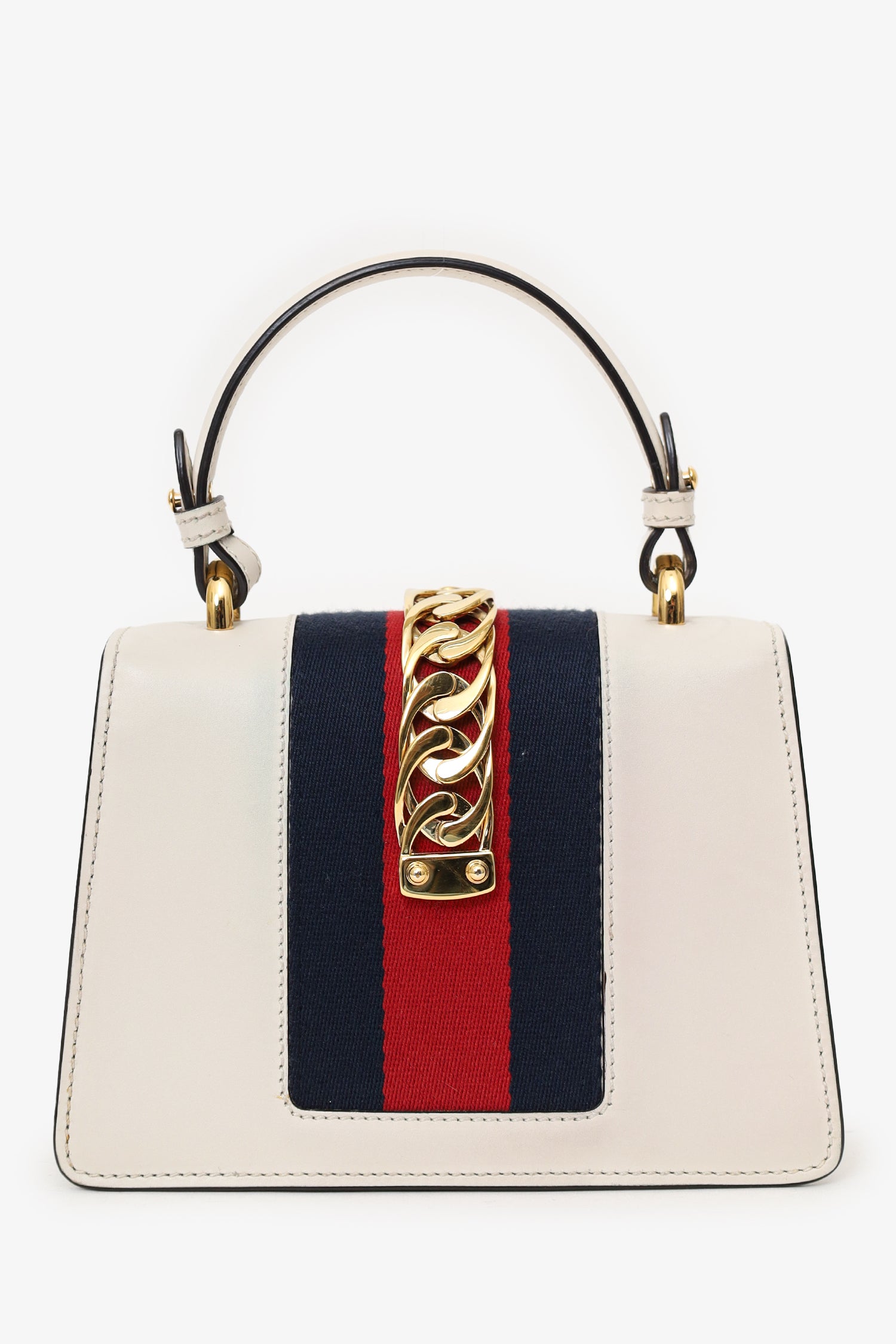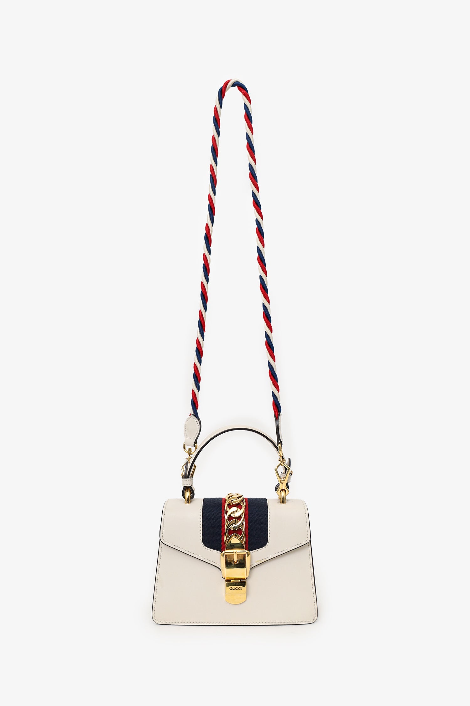 Refresh availabilityGucci White Leather Small Web Detail Sylvie Bag with Strap. Front fold-over flap with flip-lock closure. Top handle. 2 Removable crossbody straps; leather with adjustable, braided fabric with clasp closure. push-pin closure. Suede-lined interior. Single interior slip pocket. Gold-tone hardware. Tonal stitching.