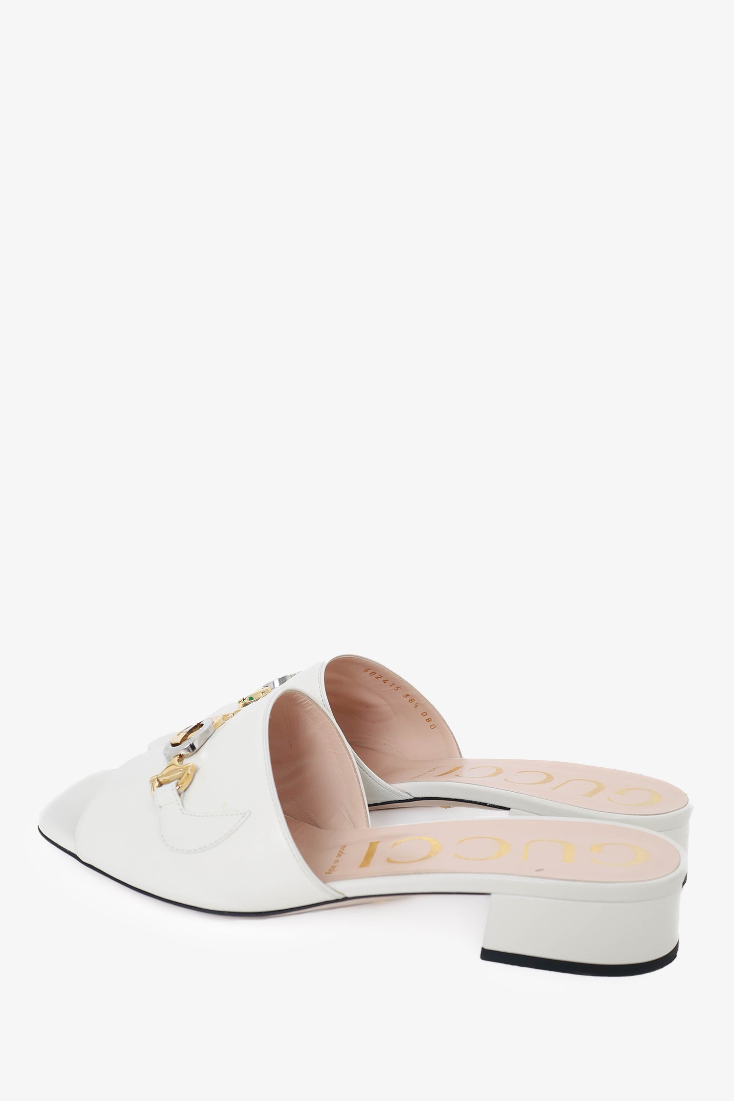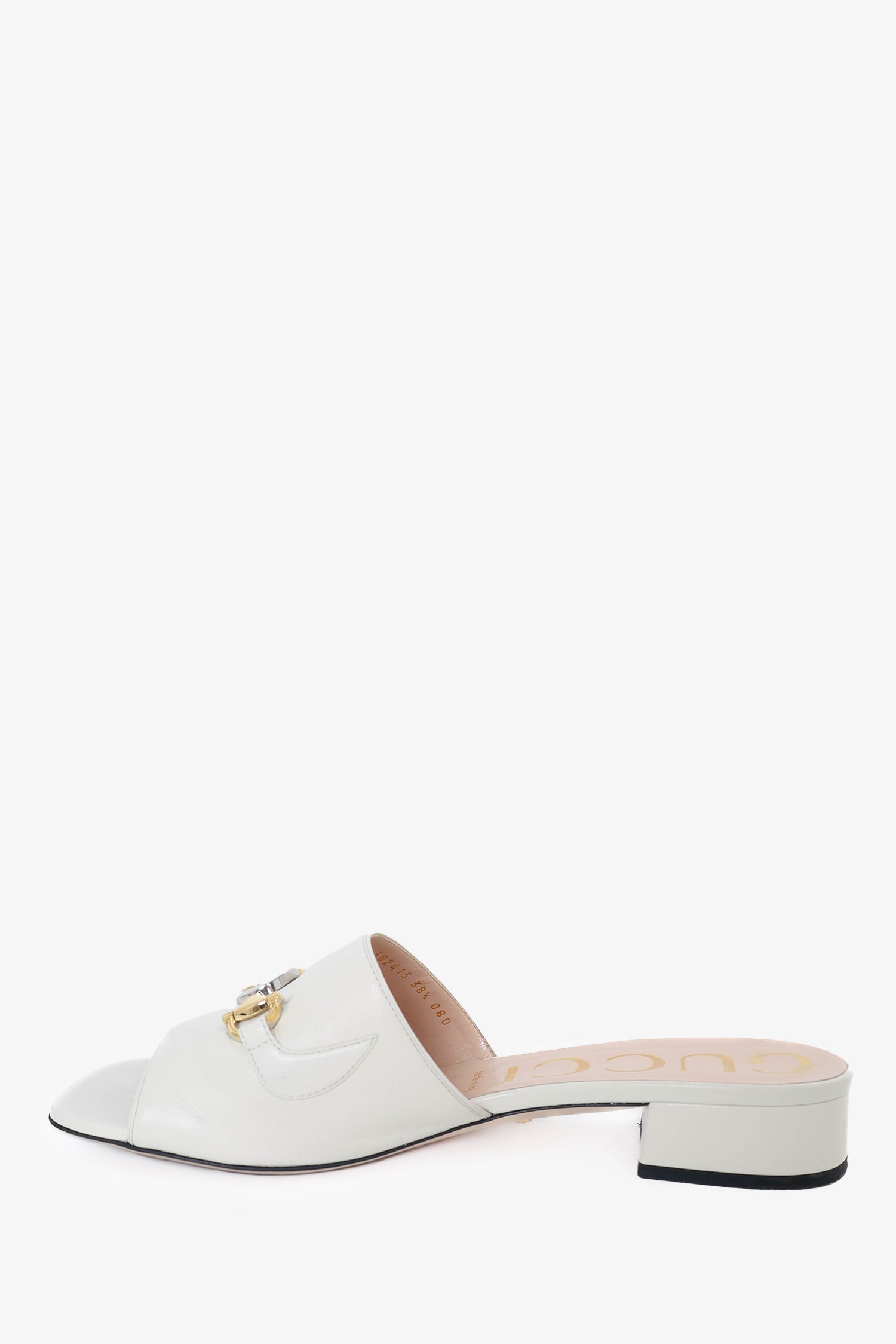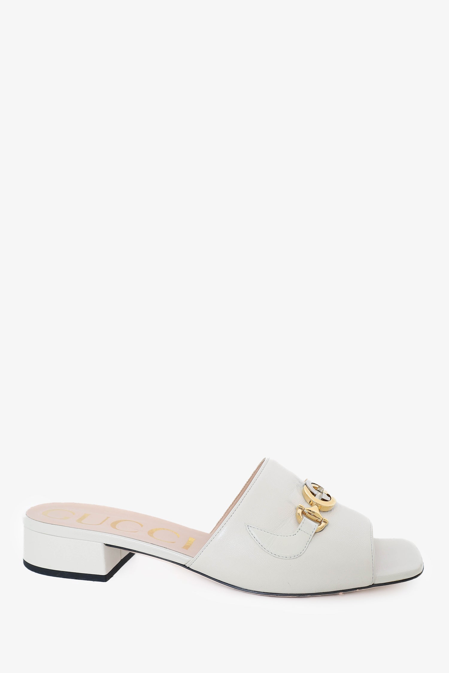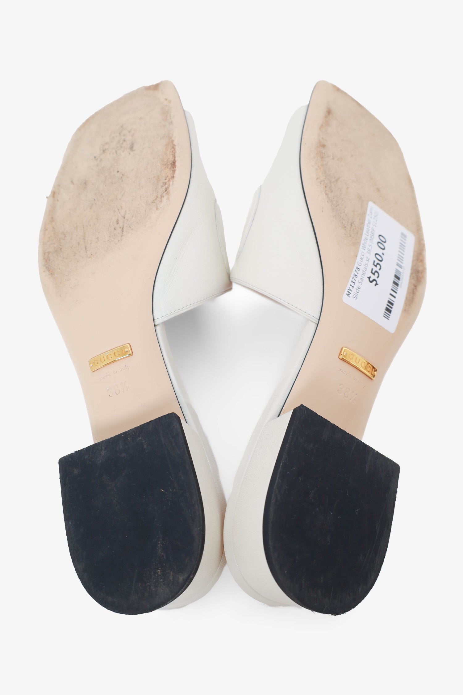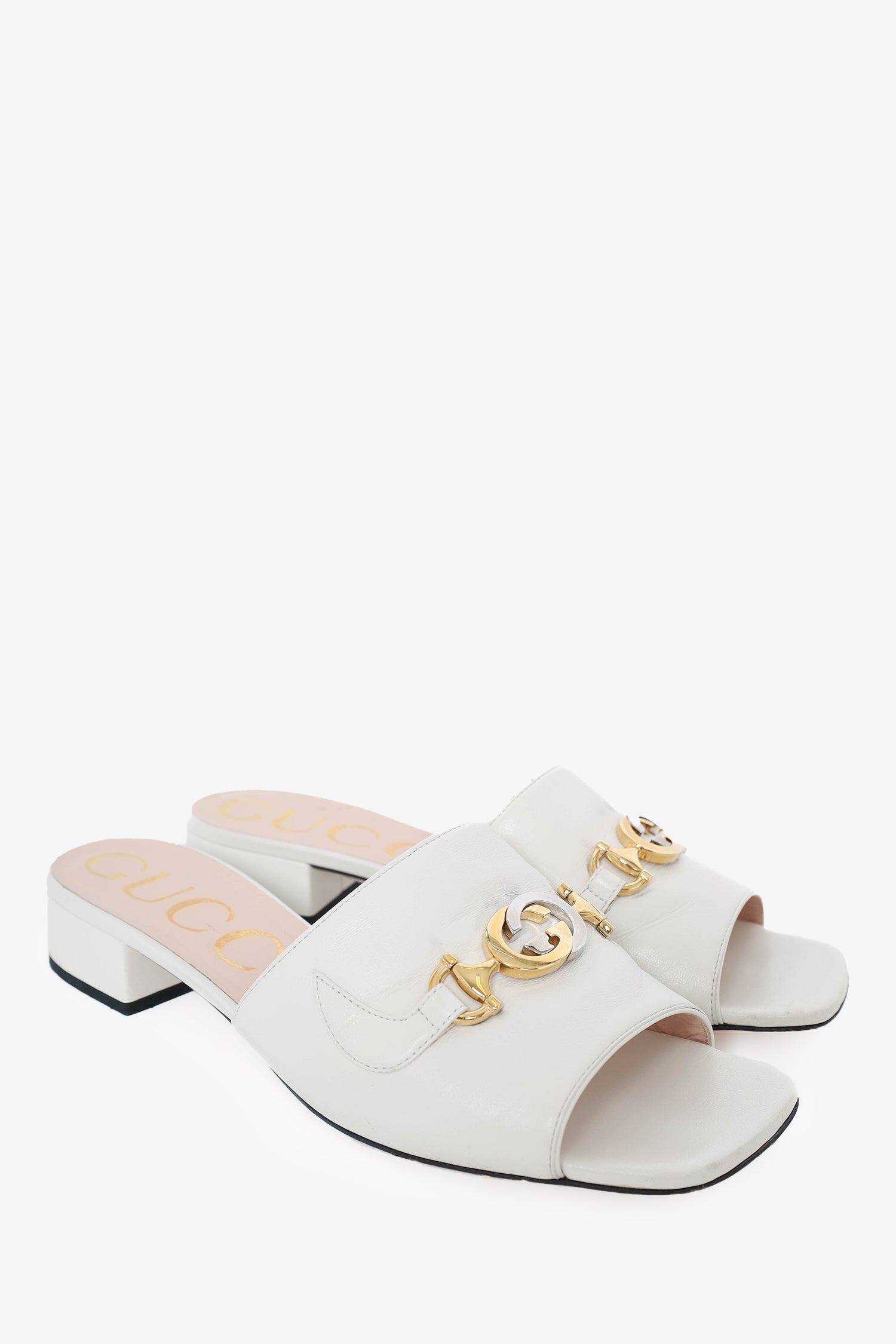 Refresh availabilityGucci White Leather Zumi Slide Sandals. Square toe. Gold and silver toned hardware. Slide on. Tonal stitching.