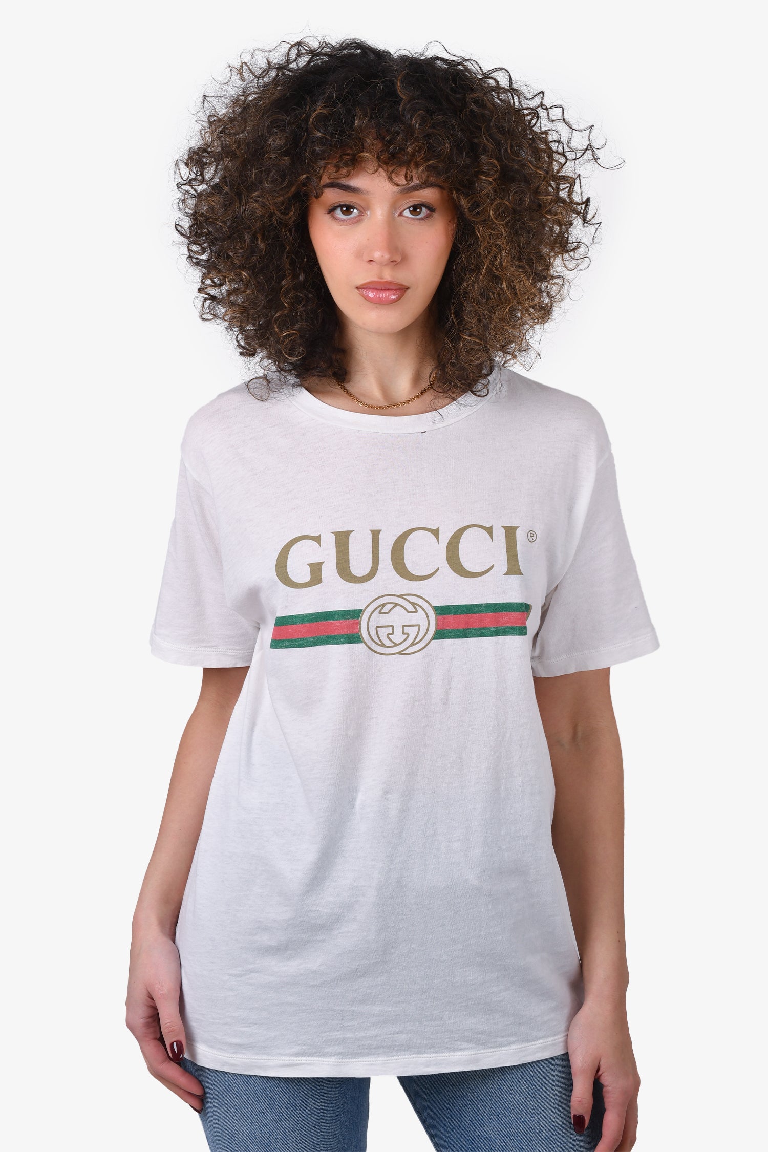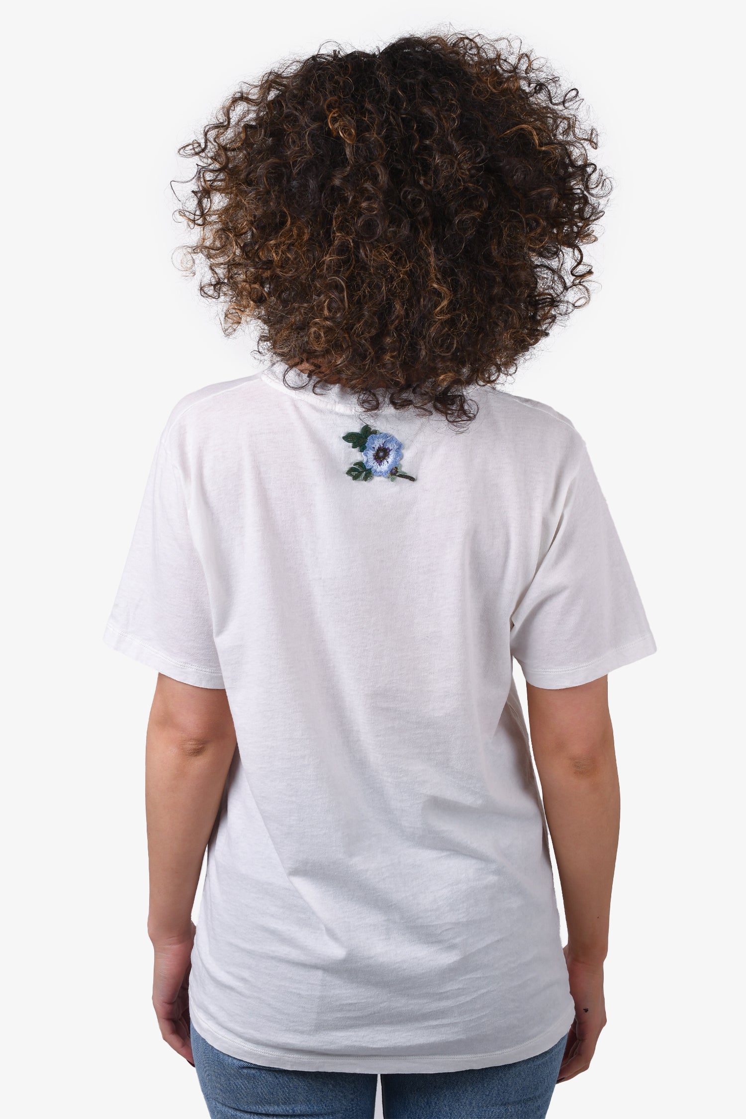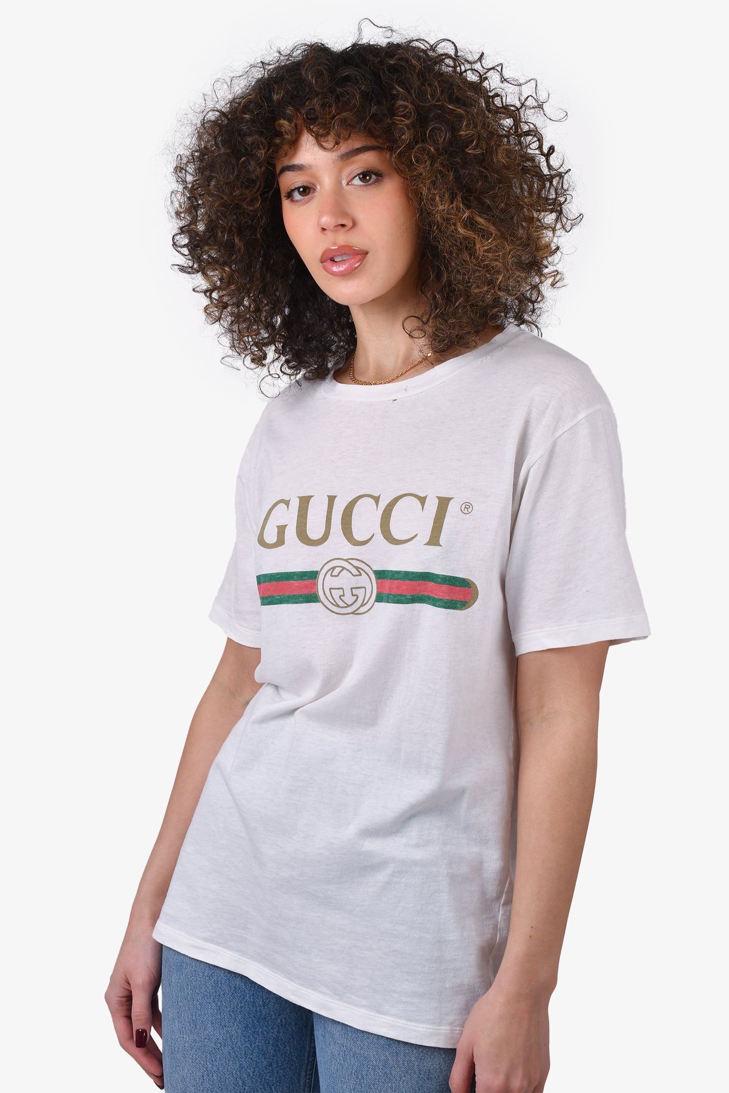 Refresh availabilityGucci White Logo T-Shirt with Embroidered Flower Patch. Intentional distressing. Tonal stitching.