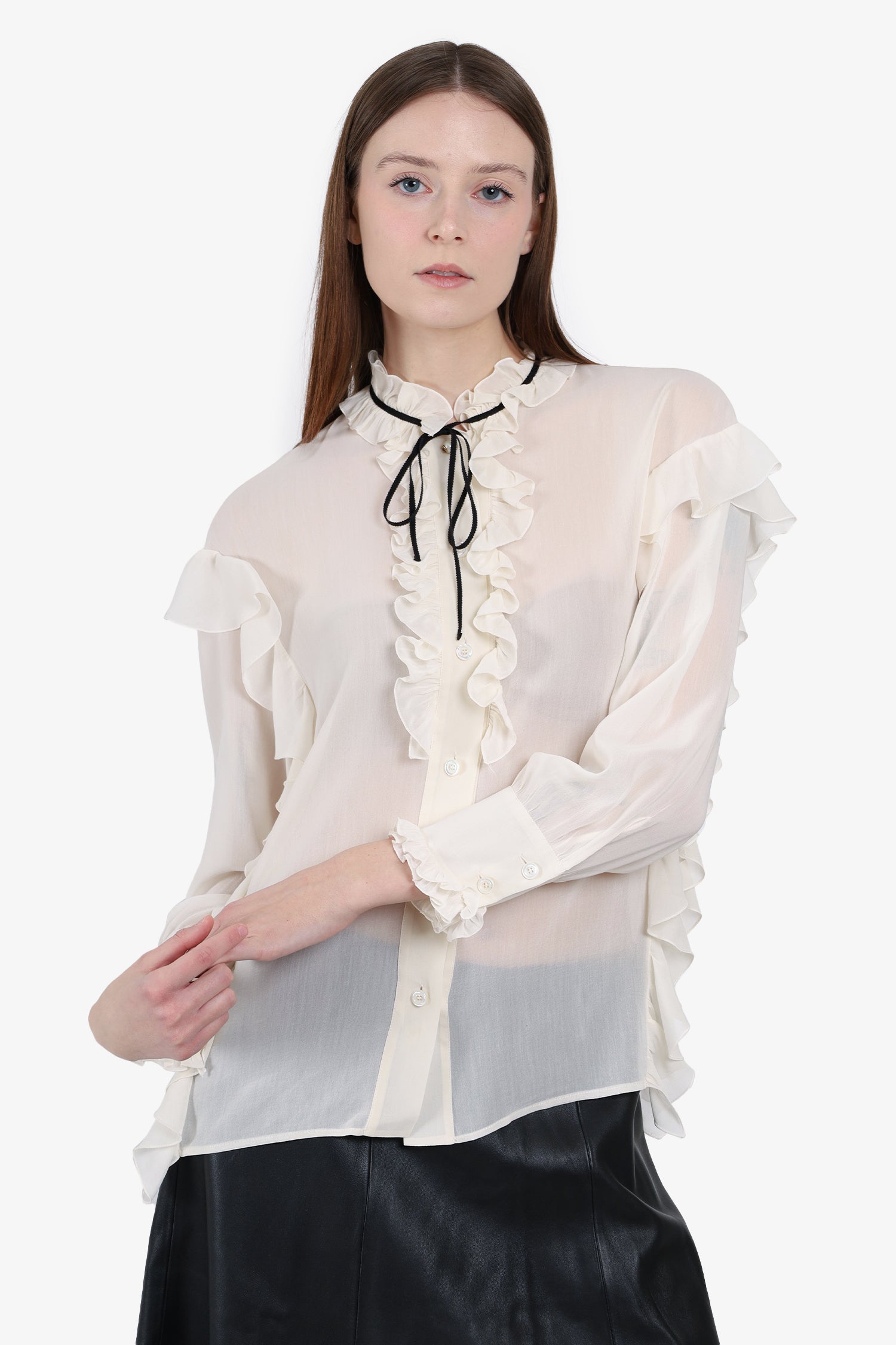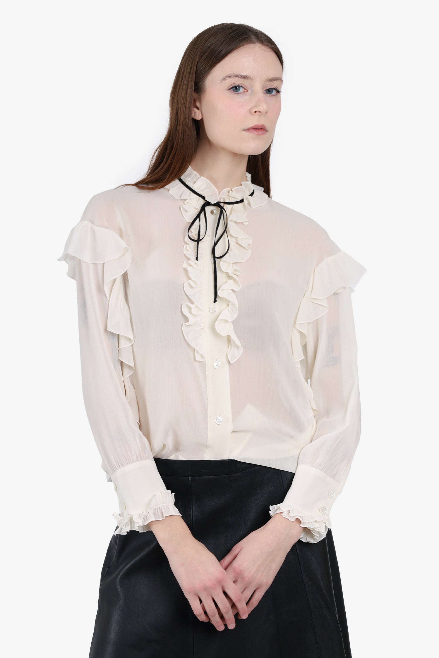 Gucci White Mock Neck Blouse. Front button-up closure. Sleeve cuff buttons. Unlined. Tonal stitching.