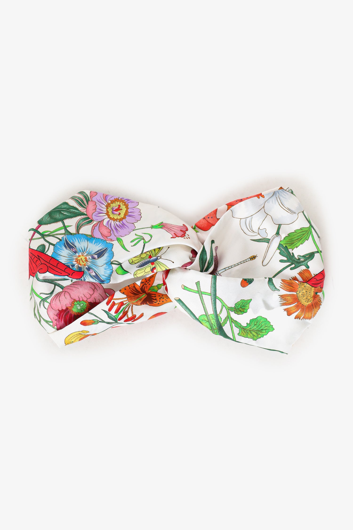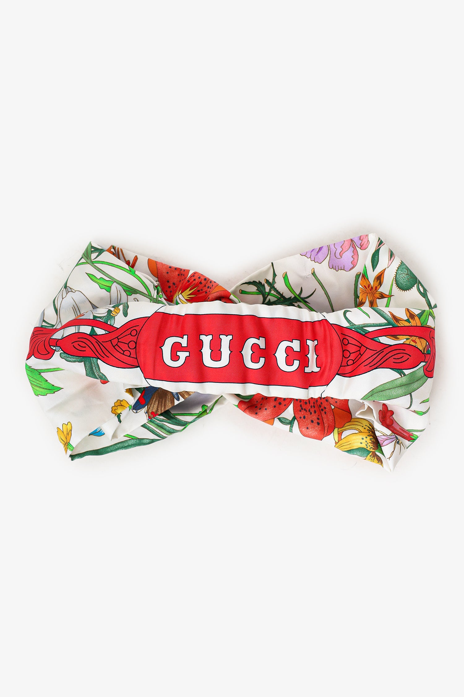 Refresh availabilityGucci White/Multicolor Silk Flora Fauna Print Red Logo Headband. Rear elasticated panel. Tonal stitching.