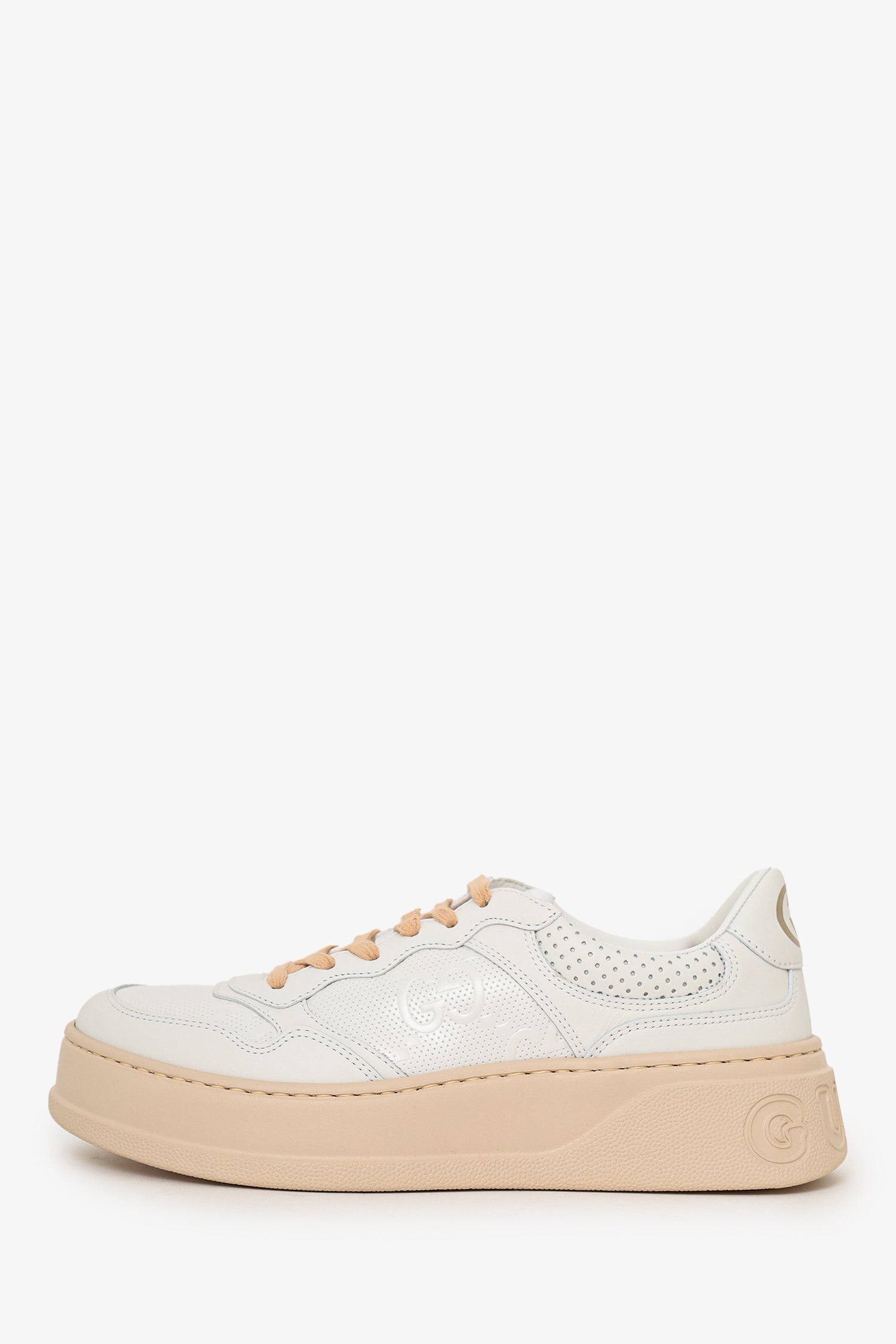 Refresh availabilityGucci White/Pink GG Embossed Leather Sneakers. Slip-on. Round toe. Front lace-up closure. Tonal stitching.