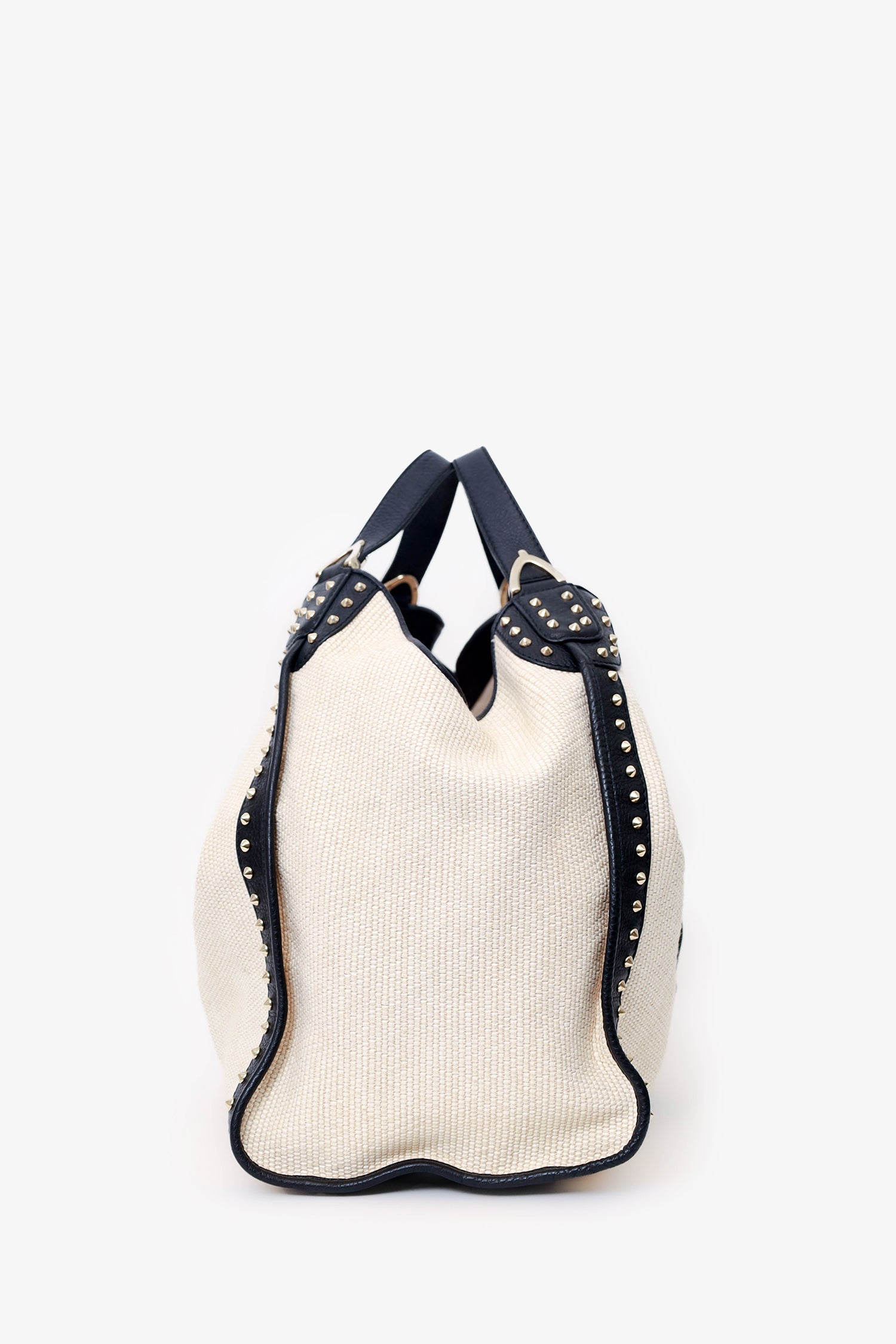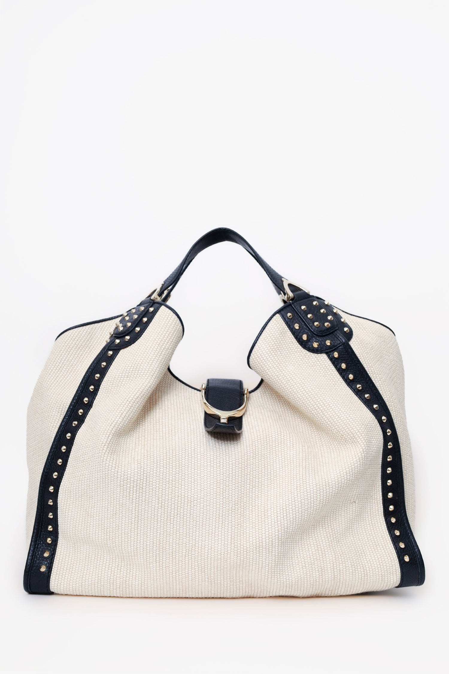 Refresh availabilityGucci White Raffia Studded Large Stirrup Hobo. Top open with fold-over-flap. Twin top handles. Lined interior with 3 pockets; 2 slip, and 1 zip. Gold-tone hardware. Tonal stitching.