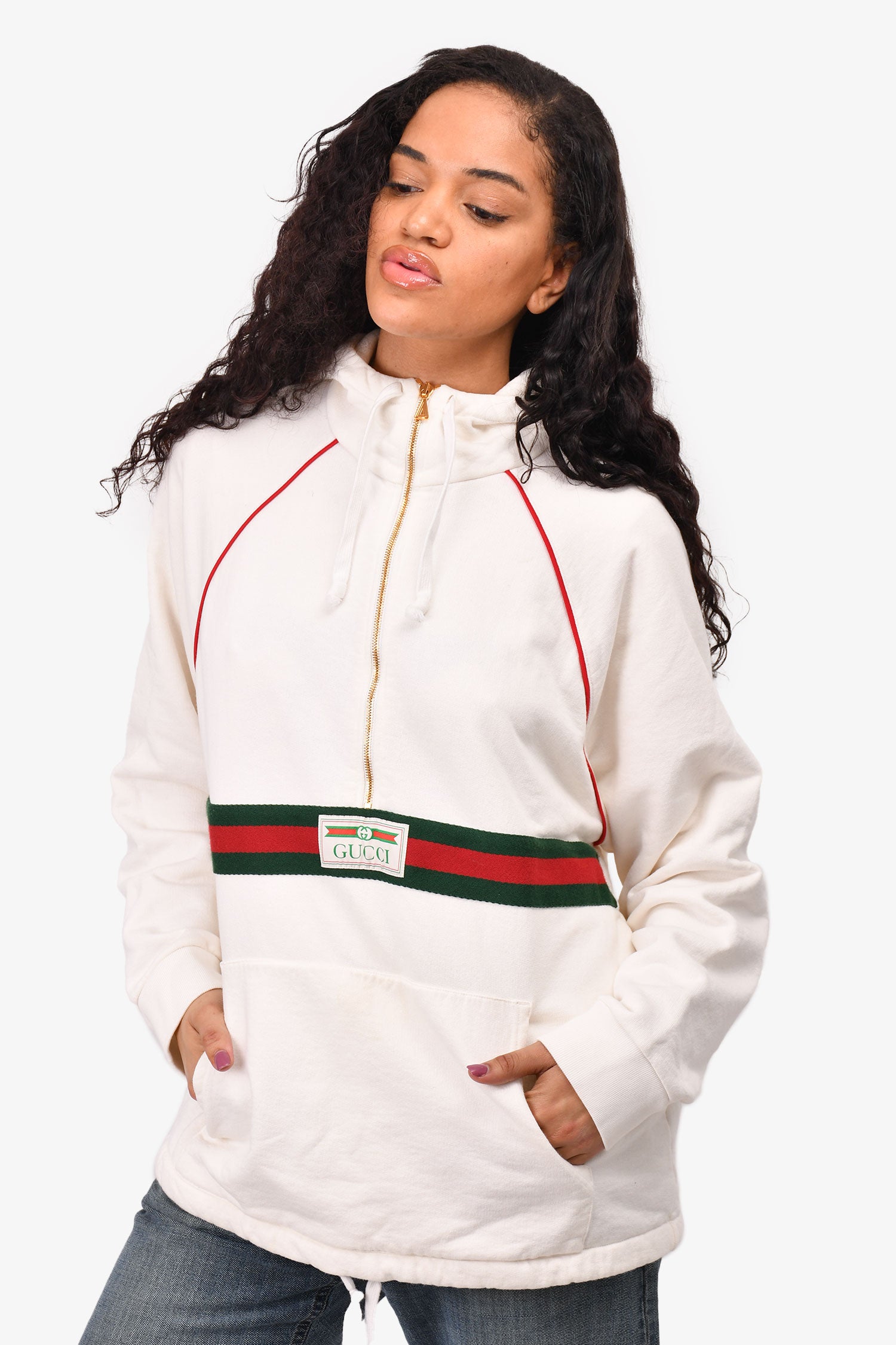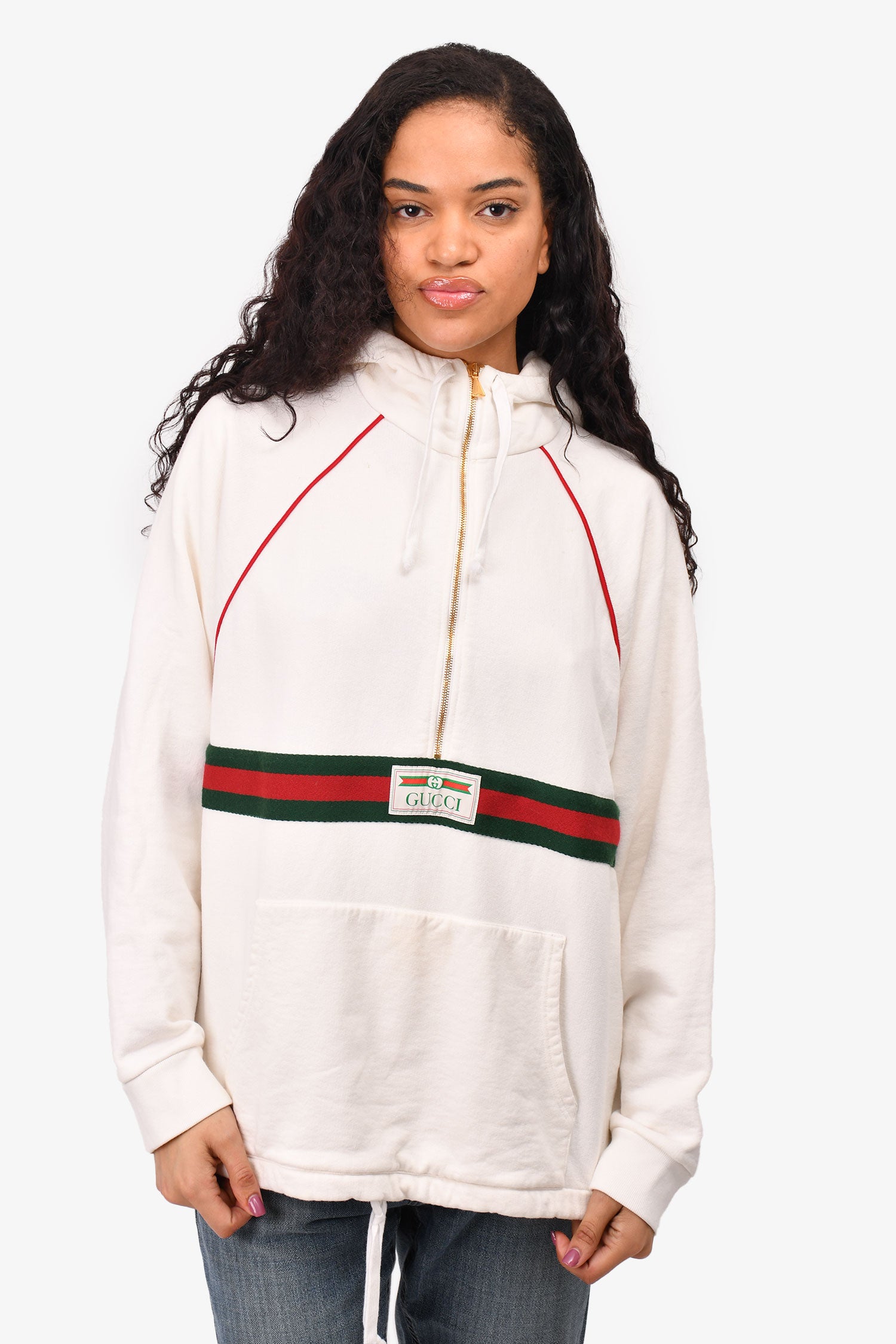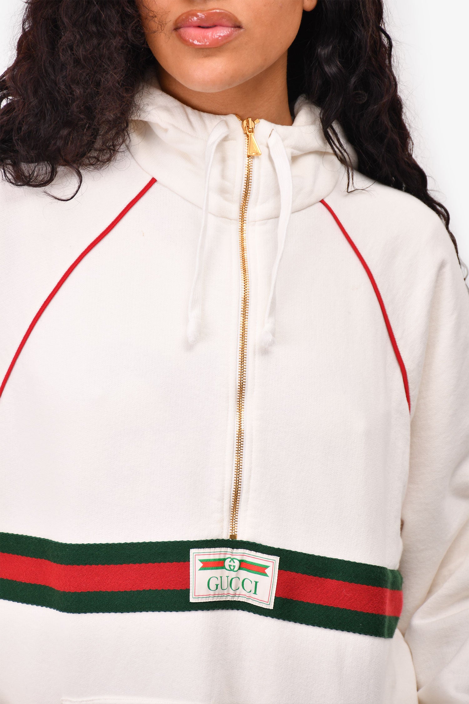 Refresh availabilityGucci White Web Half-Zip Sweatshirt. Gold-tone half zipper. Ribbed cuffs. Front pocket. Attached hoodie with adjustable pull tabs. Tonal stitching.
