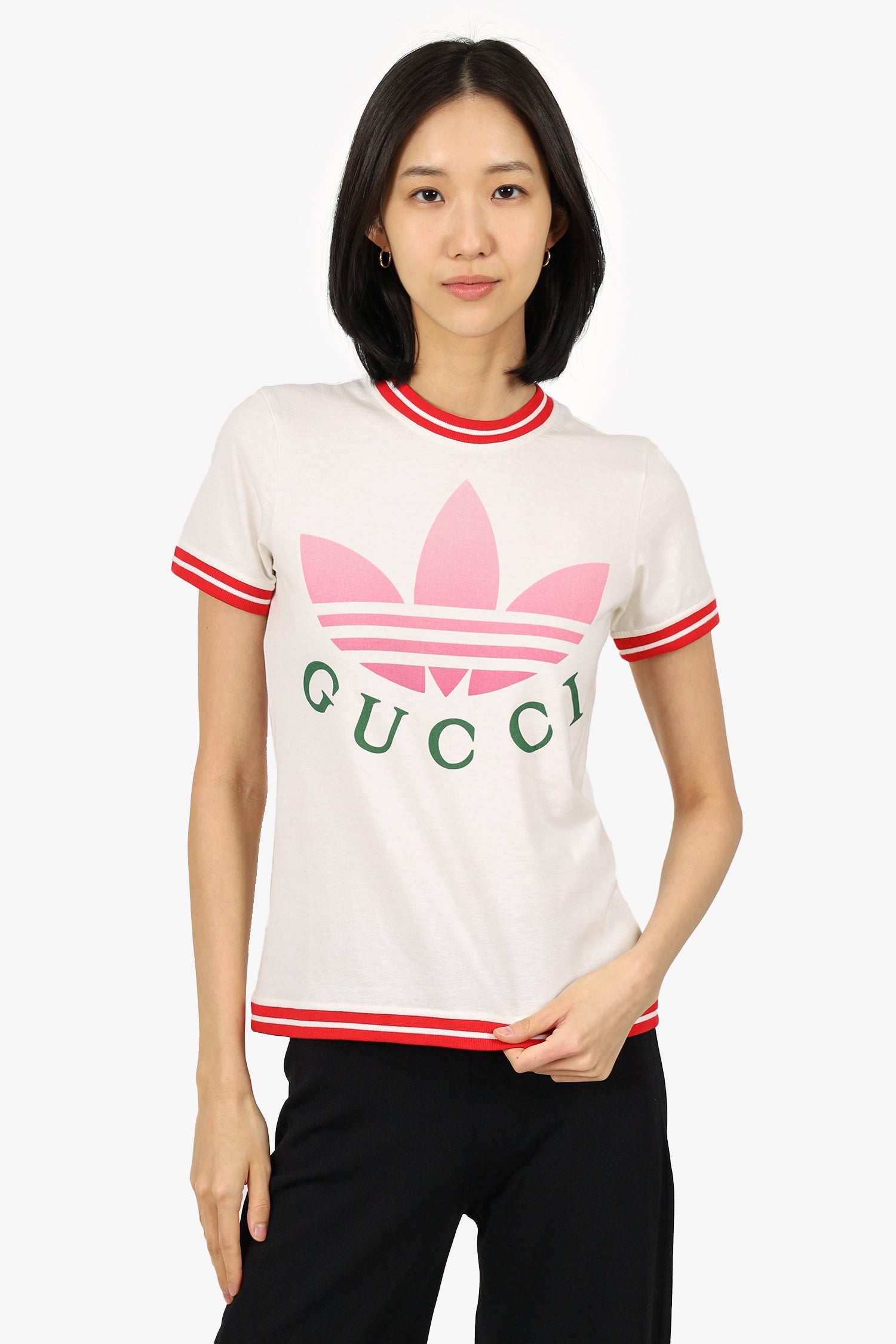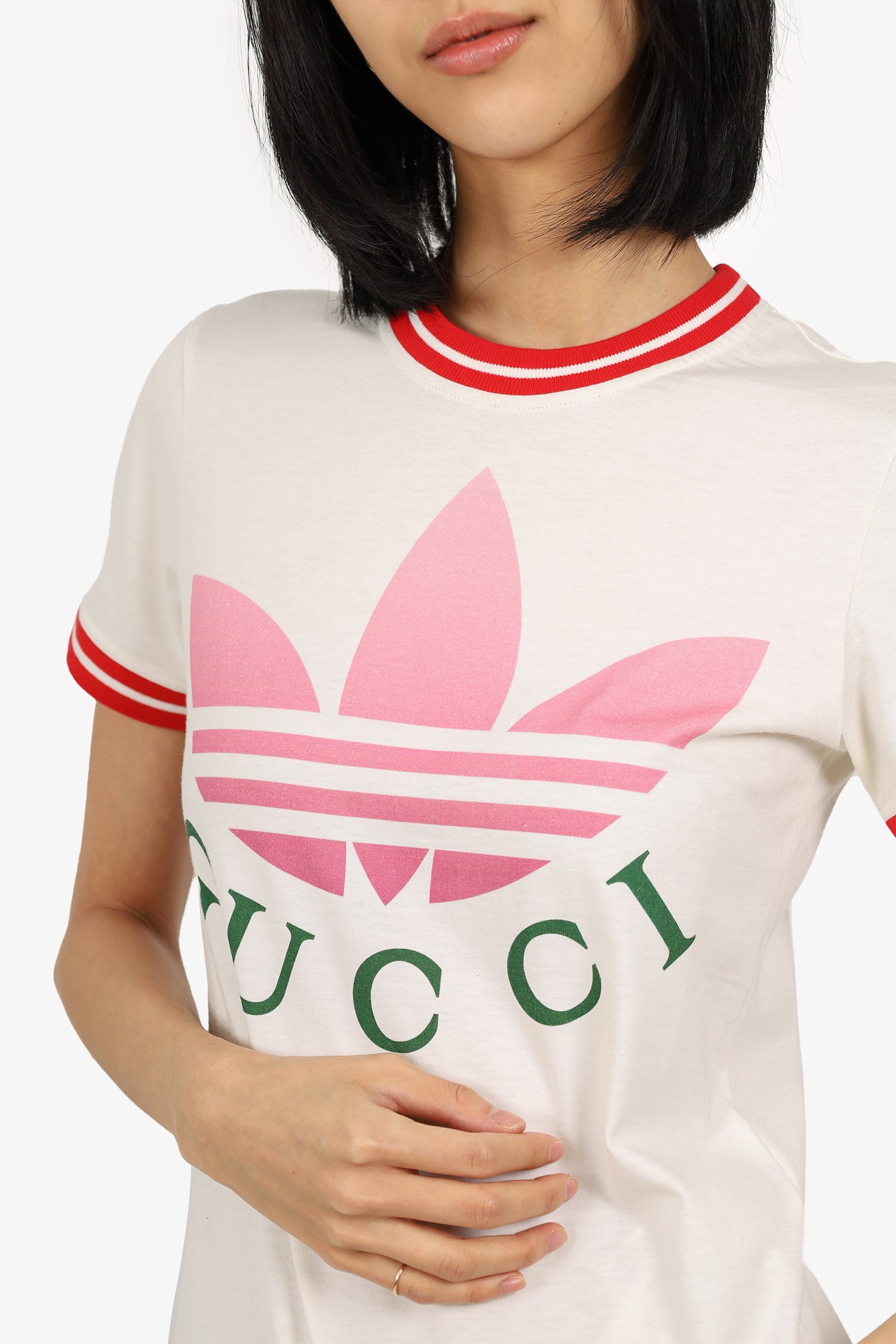 Refresh availabilityGucci x Adidas 2022 White/Red Logo Print T-Shirt. Pull-on. Round-neckline. Ribbed neckline waistband and sleeve cuffs. Centre graphic. Tonal stitching.