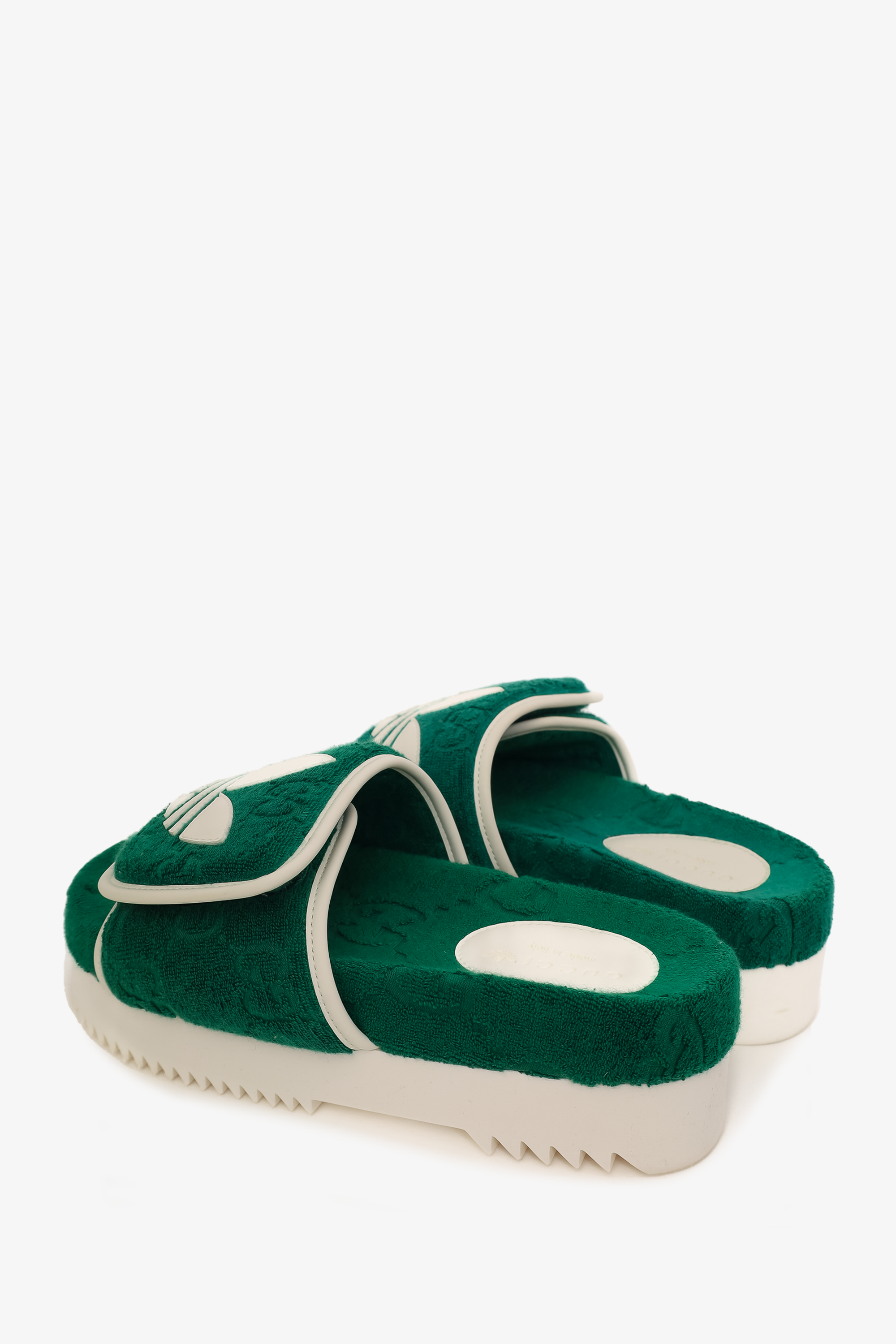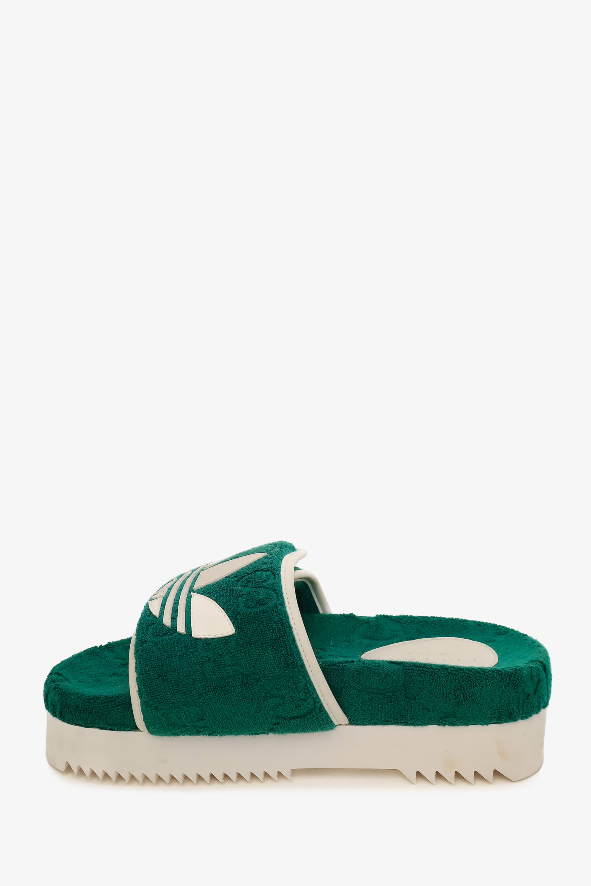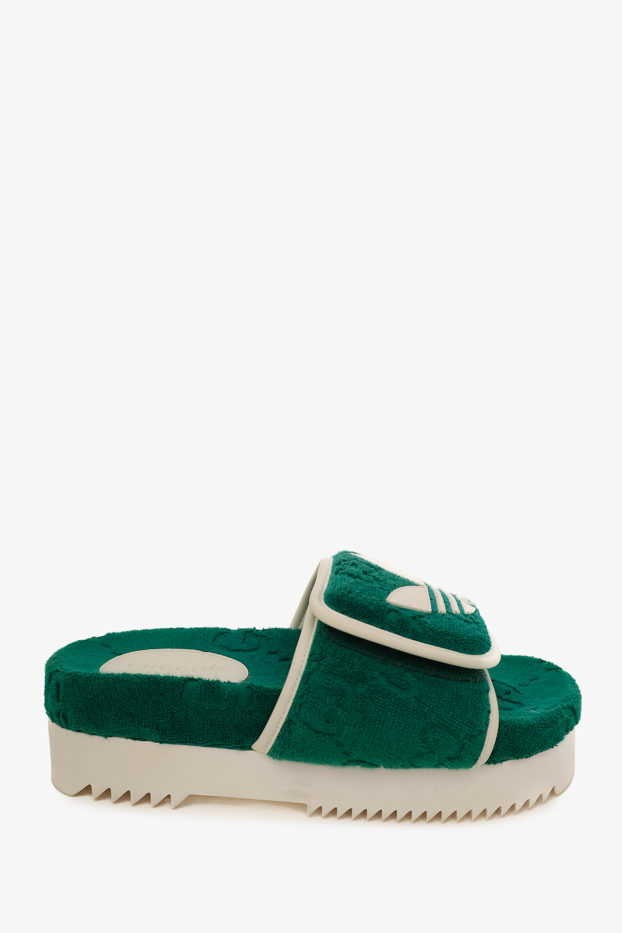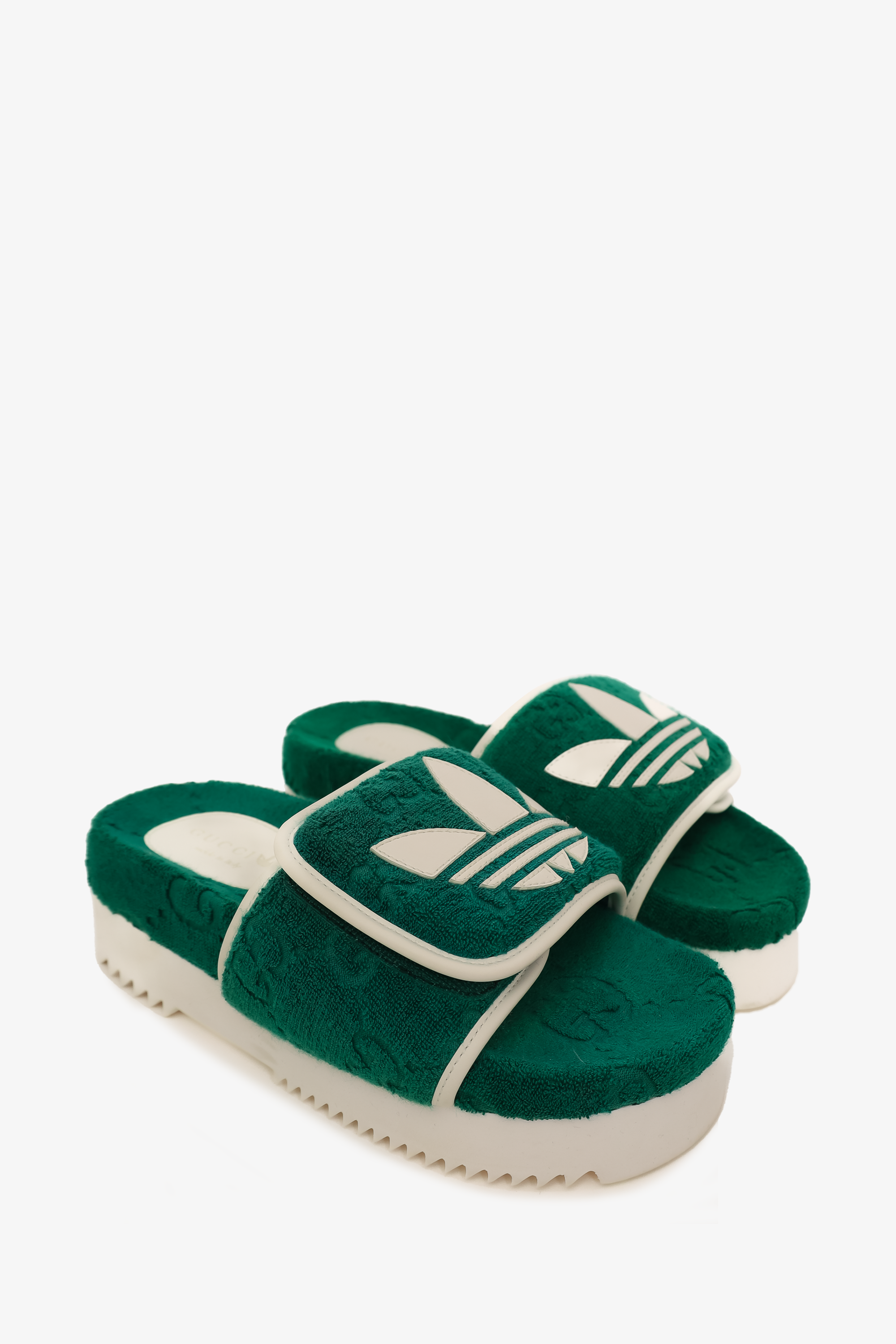 Refresh availabilityGucci x Adidas Green/White GG Platform Sandals. Open round toe. Velcro adjustable top strap. Rubber platform sole. Tonal stitching.