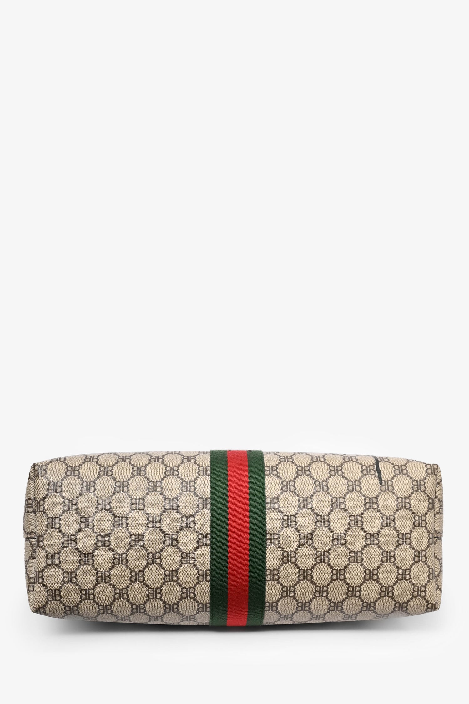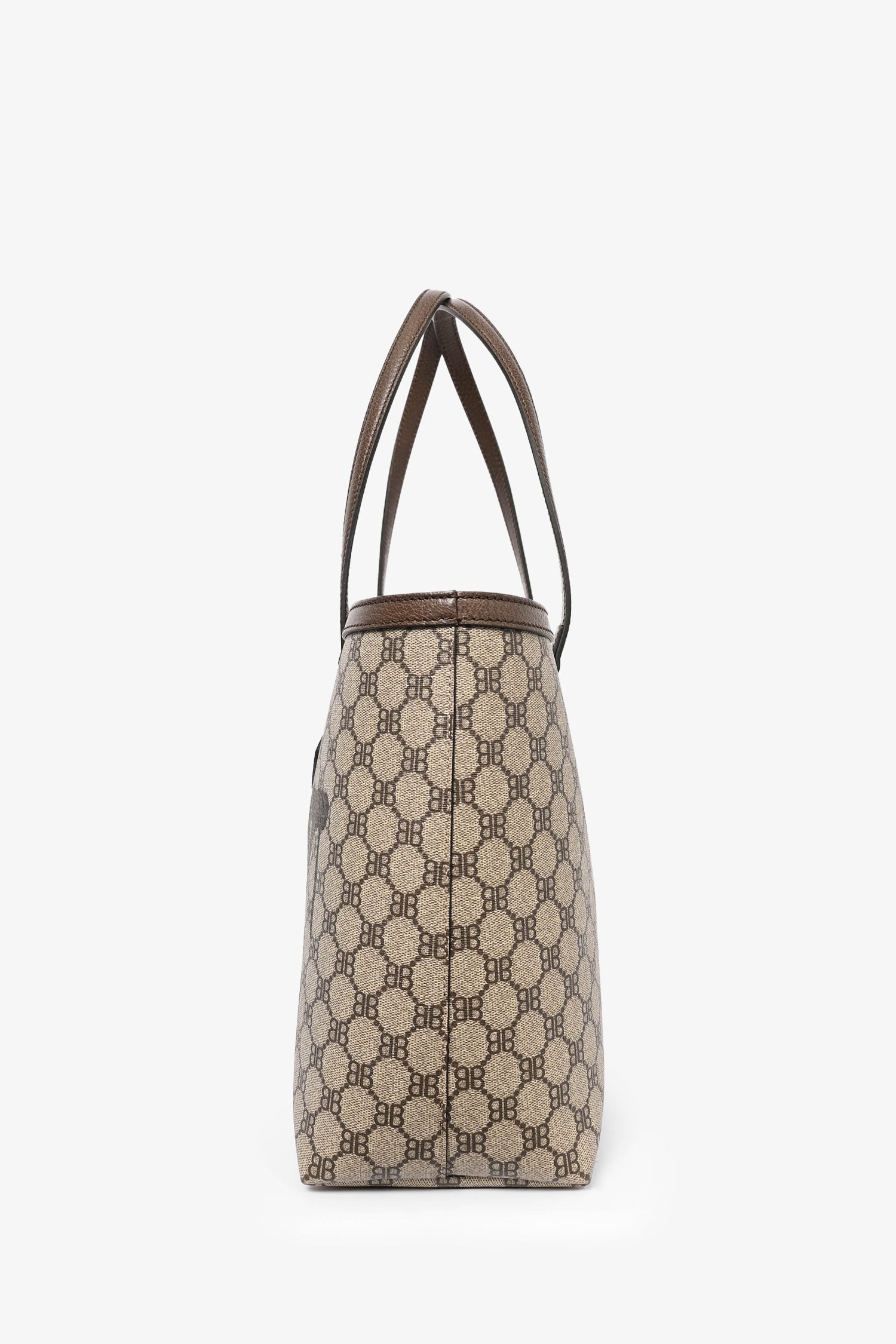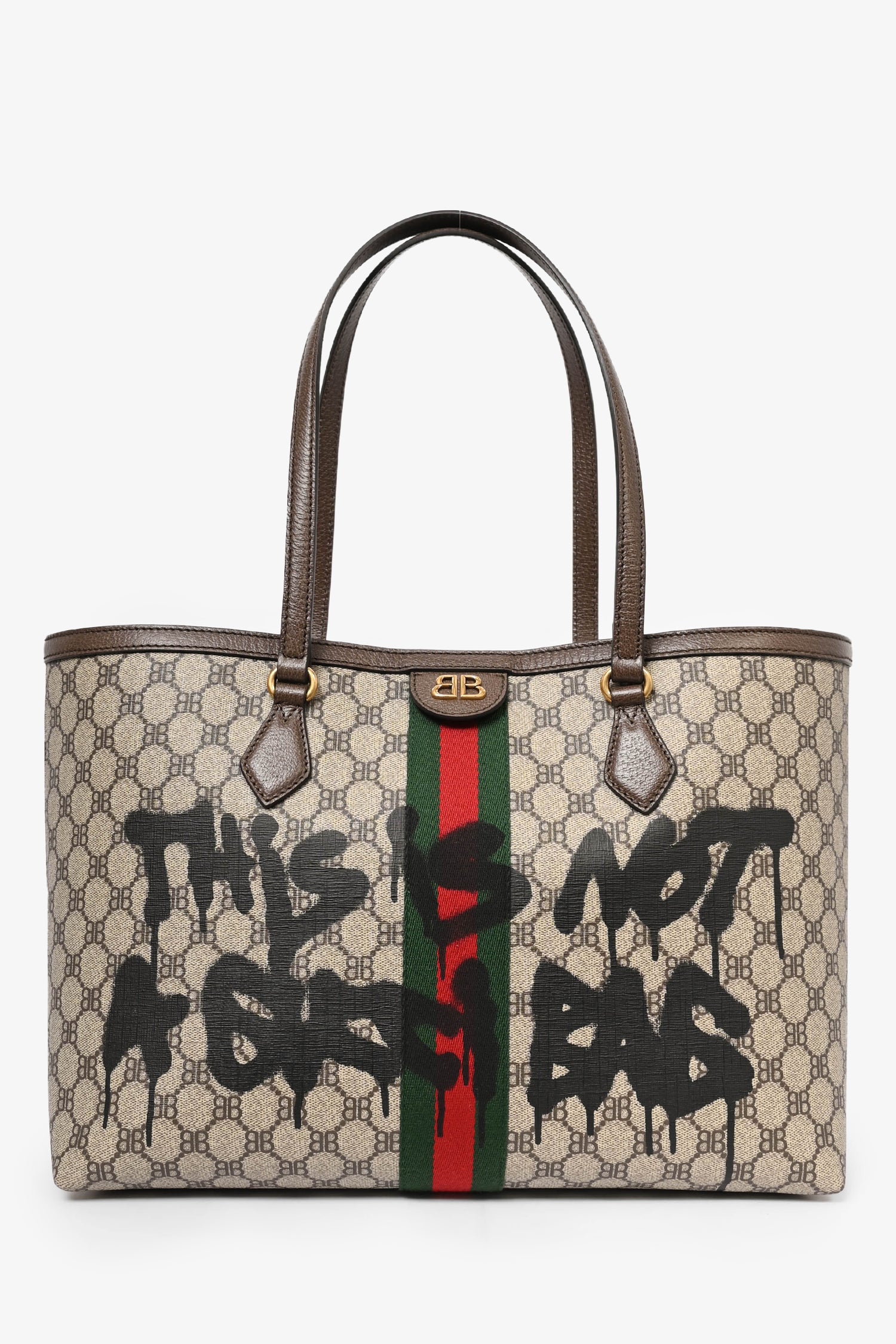 Refresh availabilityGucci X Balenciaga Brown BB Supreme Ophidia 'This is Not a Gucci Bag' Printed Shopping Tote. 2 flat handles. Tonal stitching. Leather trimming. Antiqued gold-tone hardware.
