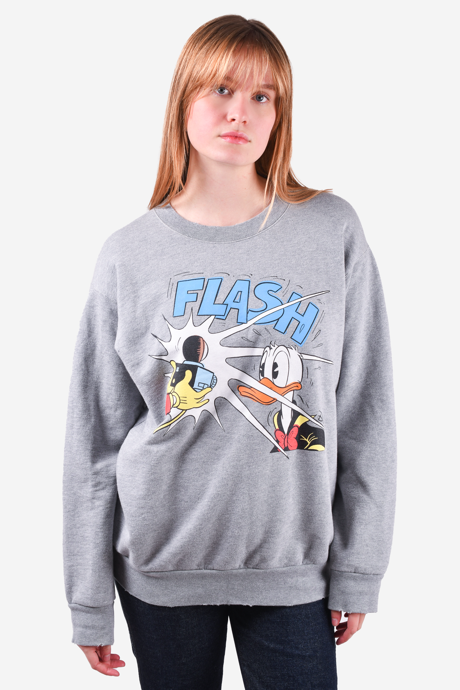 Refresh availabilityGucci x Disney Grey Donald Duck 'Flash' Distressed Crewneck Sweatshirt. Round neck. Pull-on. Ribbed neck, cuffs and hem. Tonal stitching.