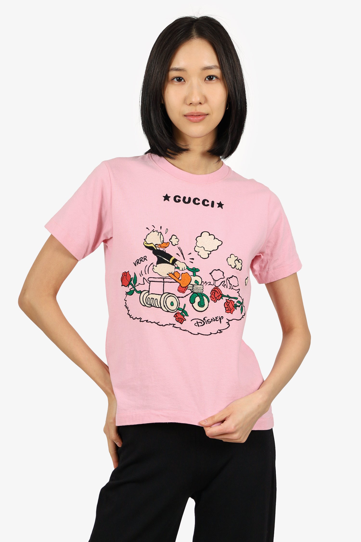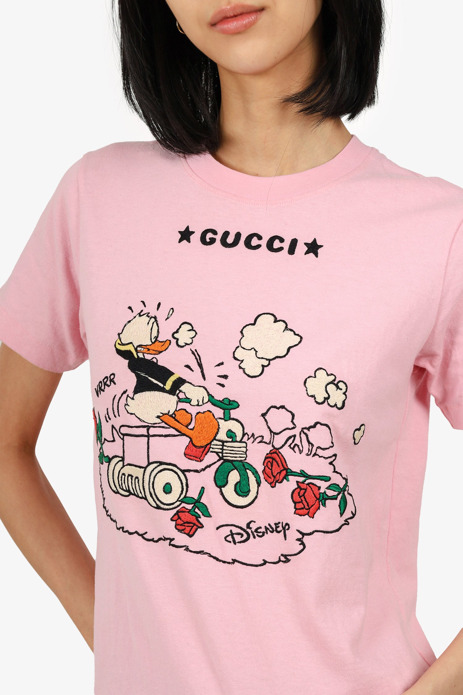 Refresh availabilityGucci X Disney Pink Cotton 'Donald' T-Shirt. Pull-on. Round-neckline. Front embroidered graphic. Tonal stitching.