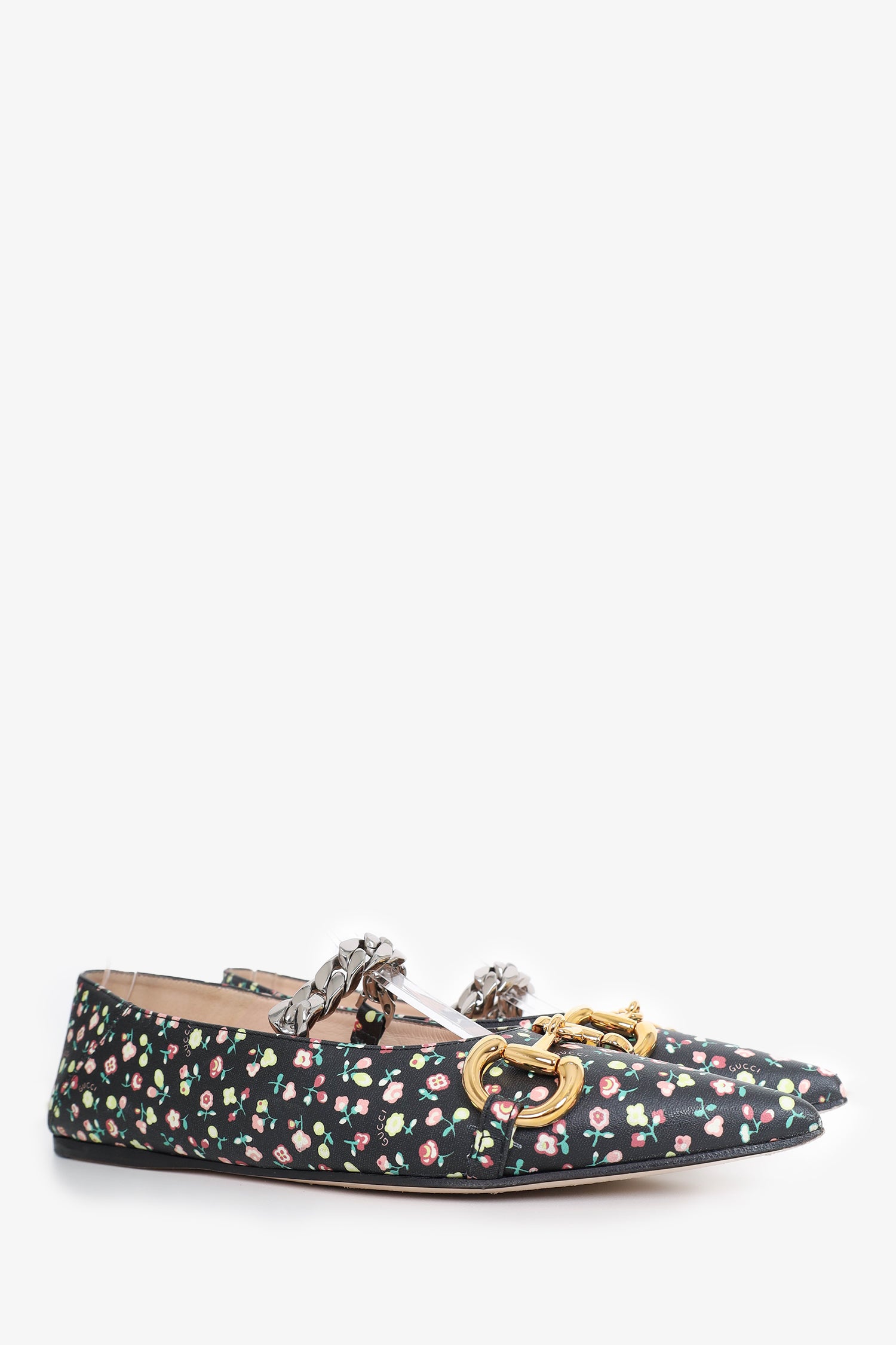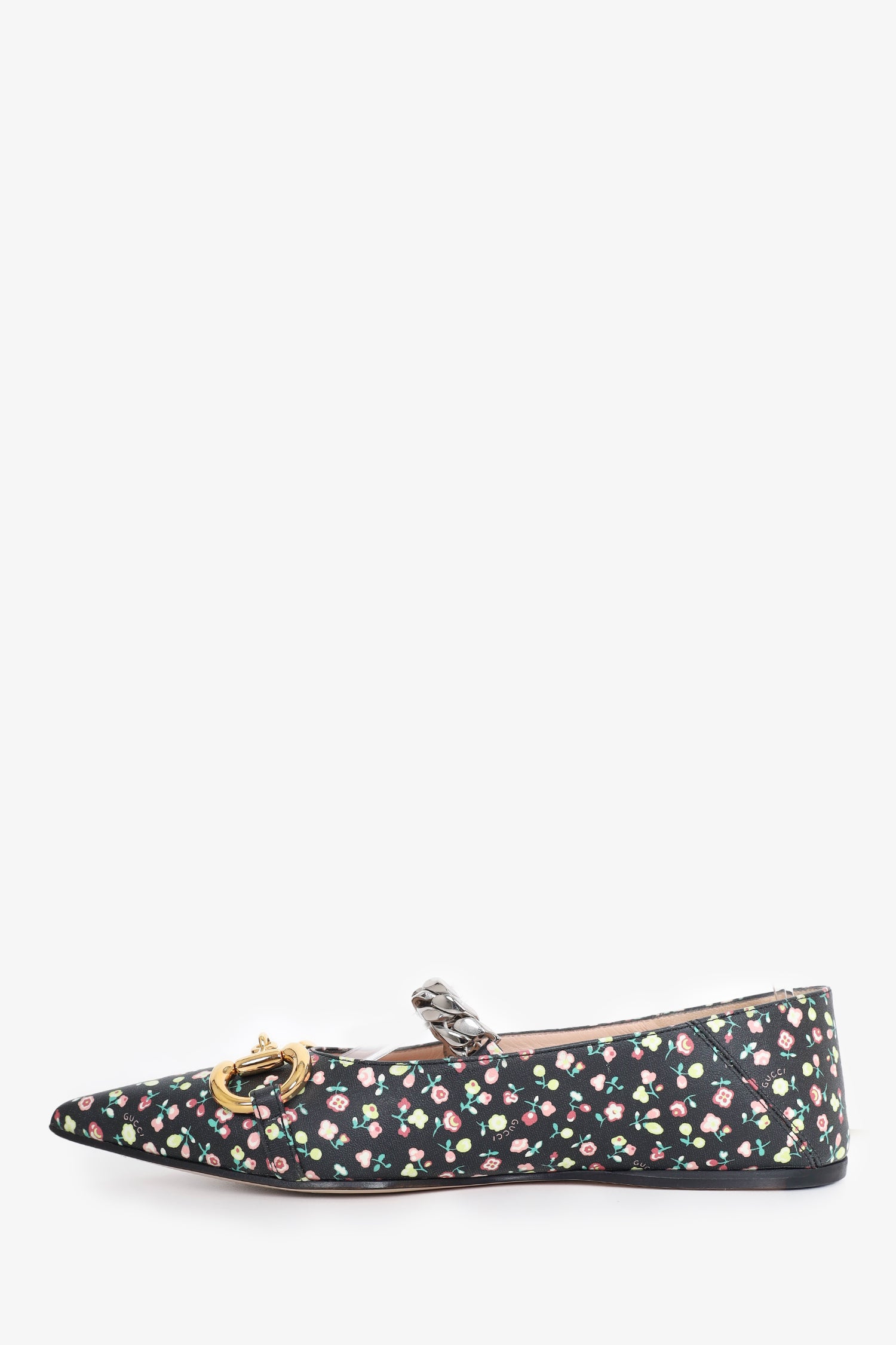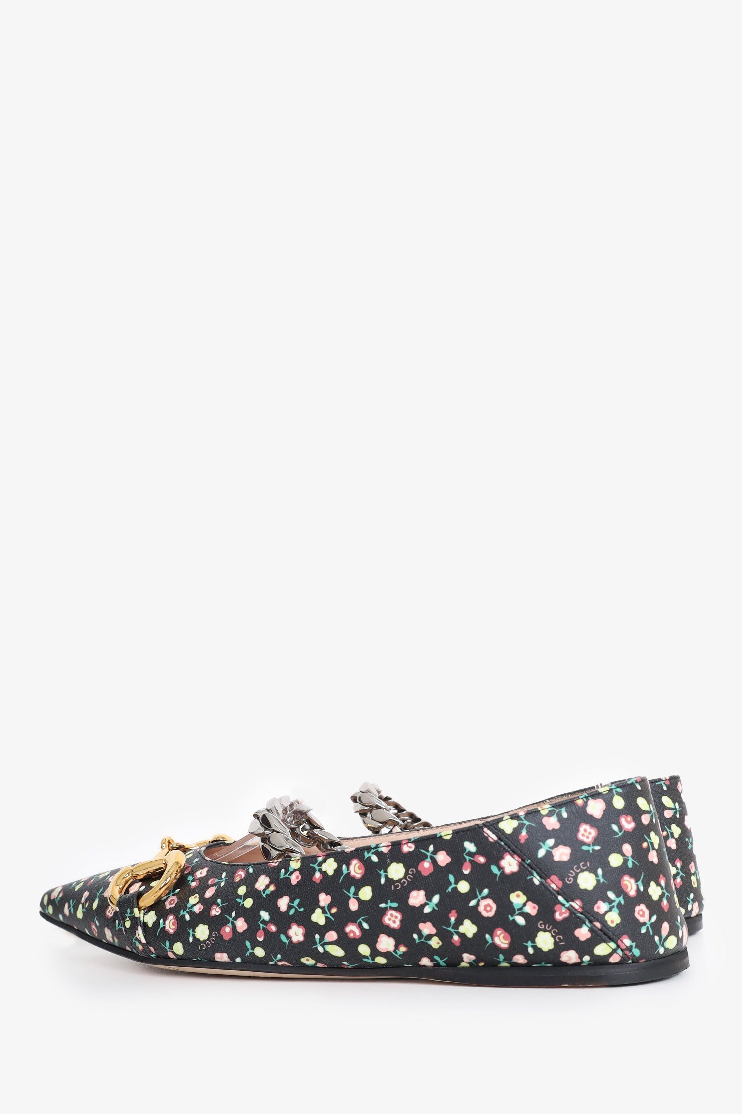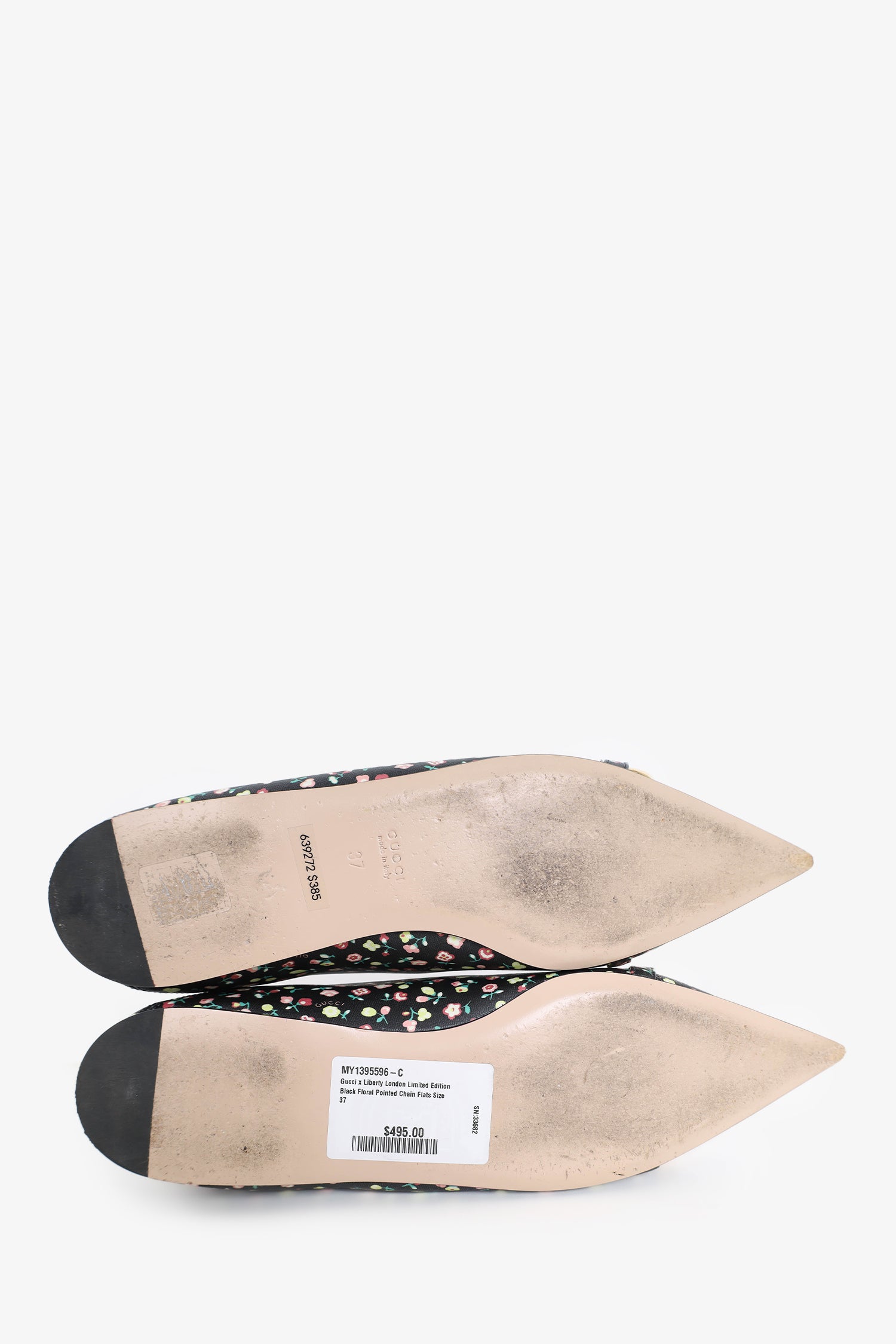 Refresh availabilityGucci x Liberty London Limited Edition Black Floral Pointed Chain Flats. Slip-on. Pointed-toe. Silver/Gold-tone hardware. Tonal stitching.
