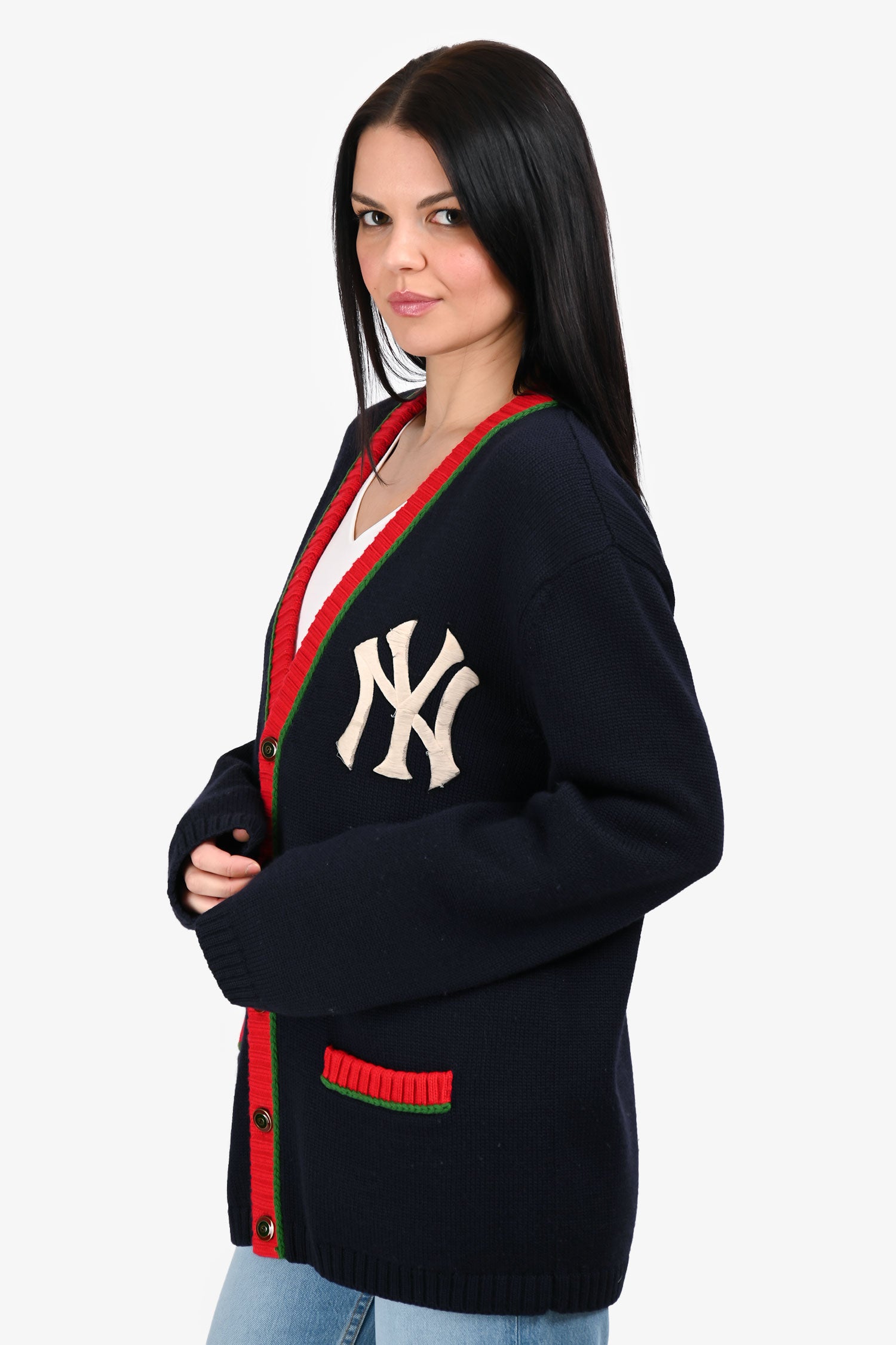 Refresh availabilityGucci x New York Yankees Navy Wool ‘NY Yankees’ Cardigan. V-neckline. Front button-up closure. 2 exterior slip pockets. Unlined interior. Gold-tone hardware. Tonal stitching.