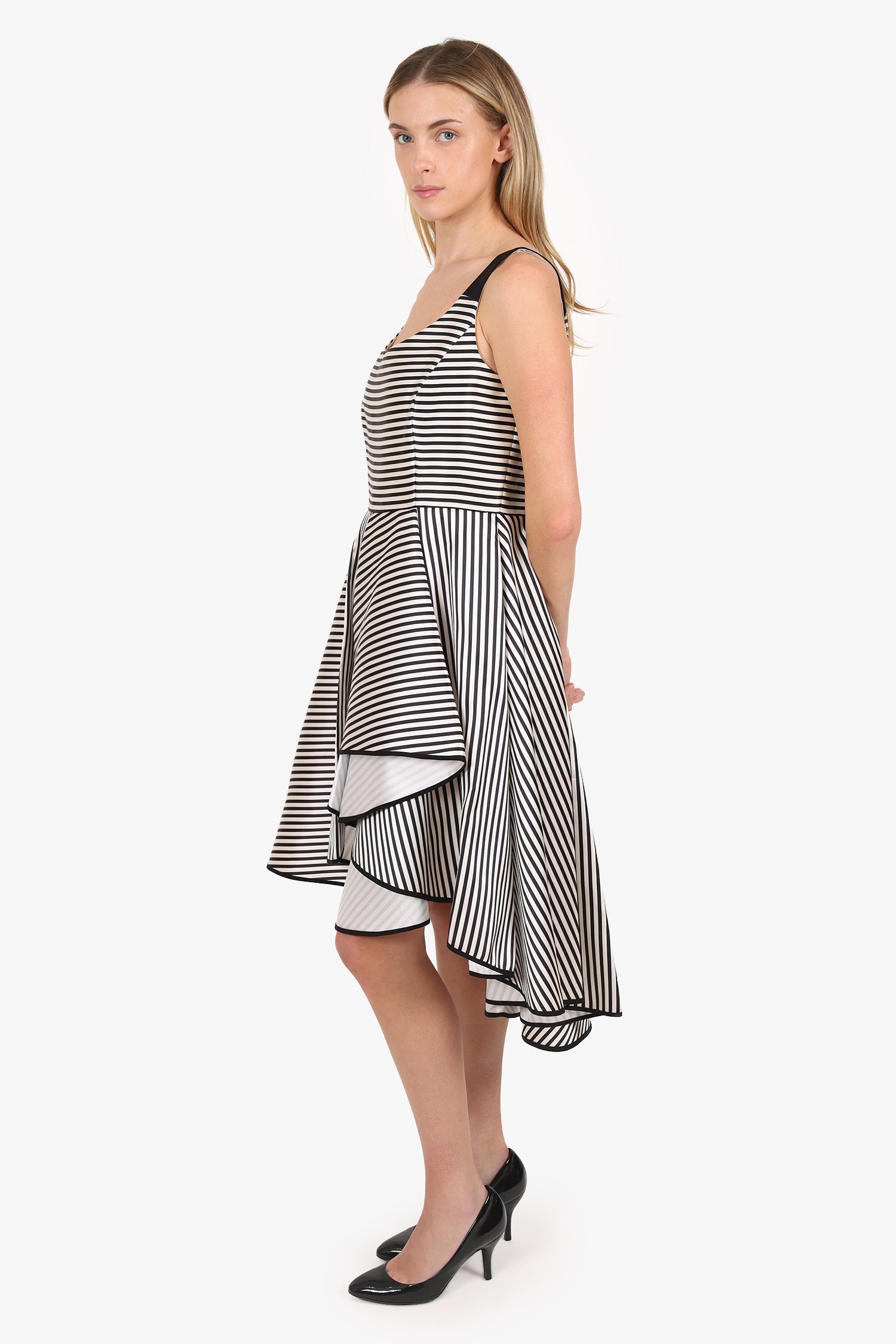 Refresh availabilityHalston Black/White Stripe Asymmetric Ruffle Hem Dress. Pull-on. Round neckline. Rear zip and hook closure. Lined interior. Tonal stitching.
