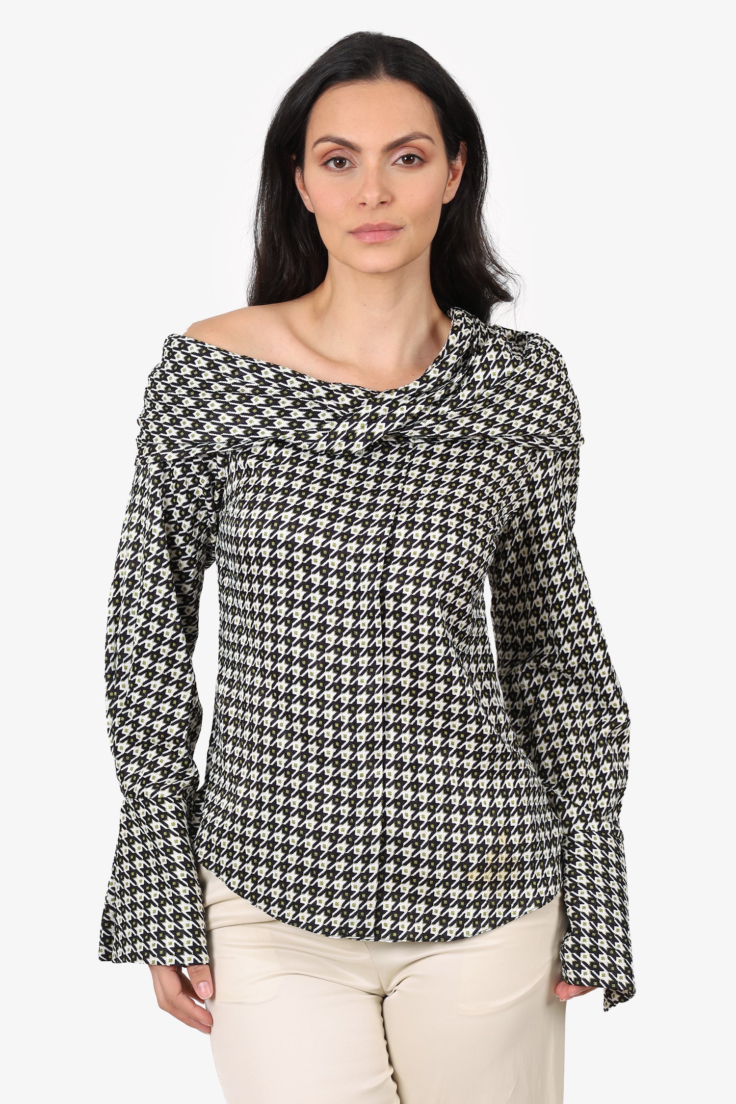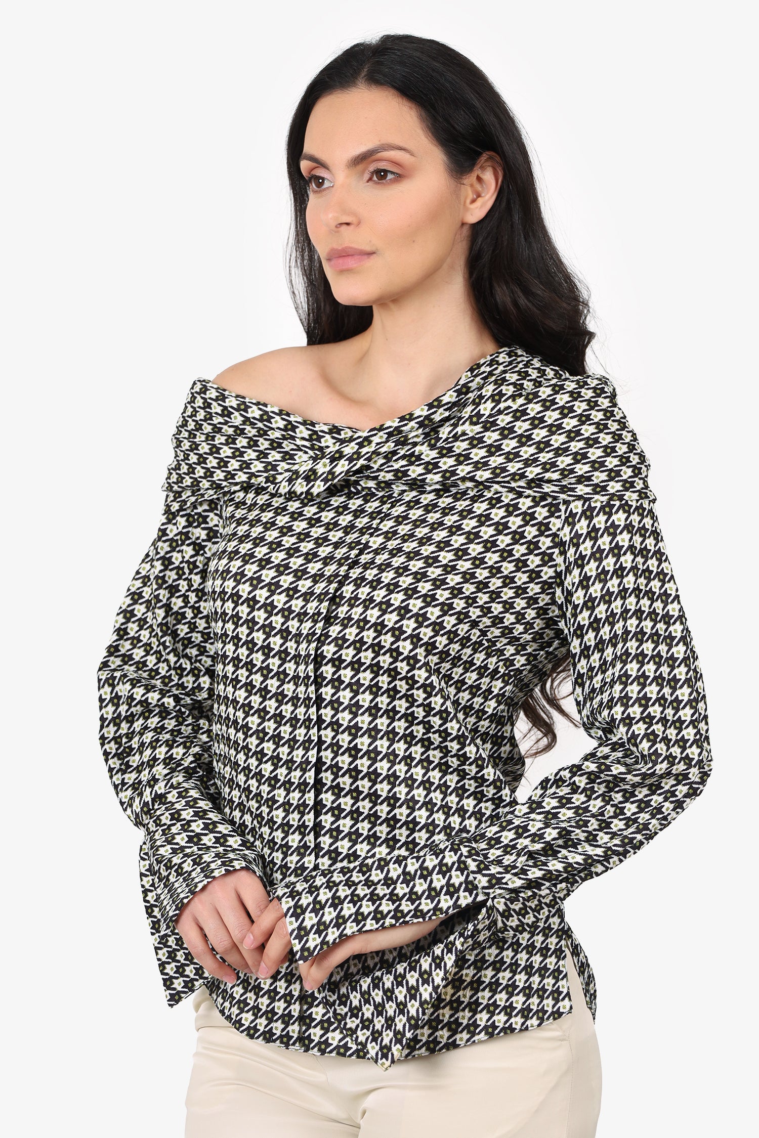 Hellessy Cream/Black Long Sleeve Off Shoulder Button Up Top Size 4