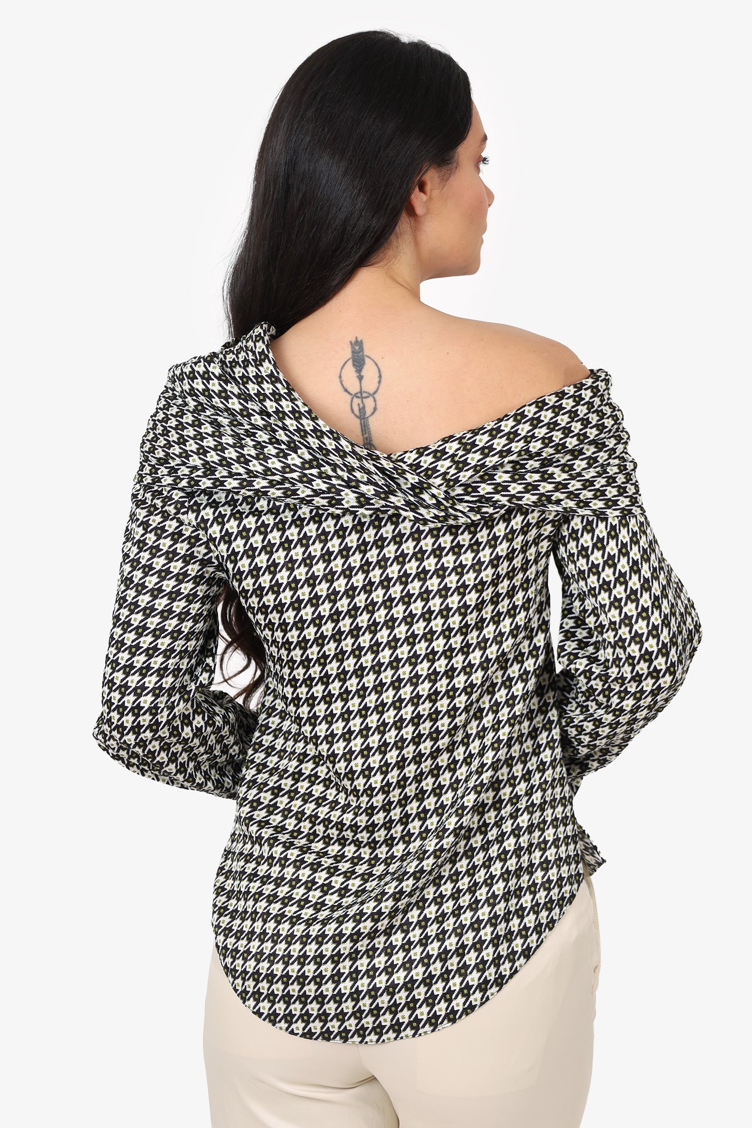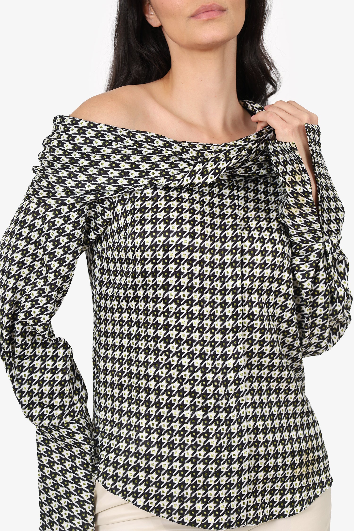 Refresh availabilityHellessy Cream/Black Long Sleeve Off Shoulder Button Up Top. Pull-on. Off-the-shoulder. Tonal stitching.