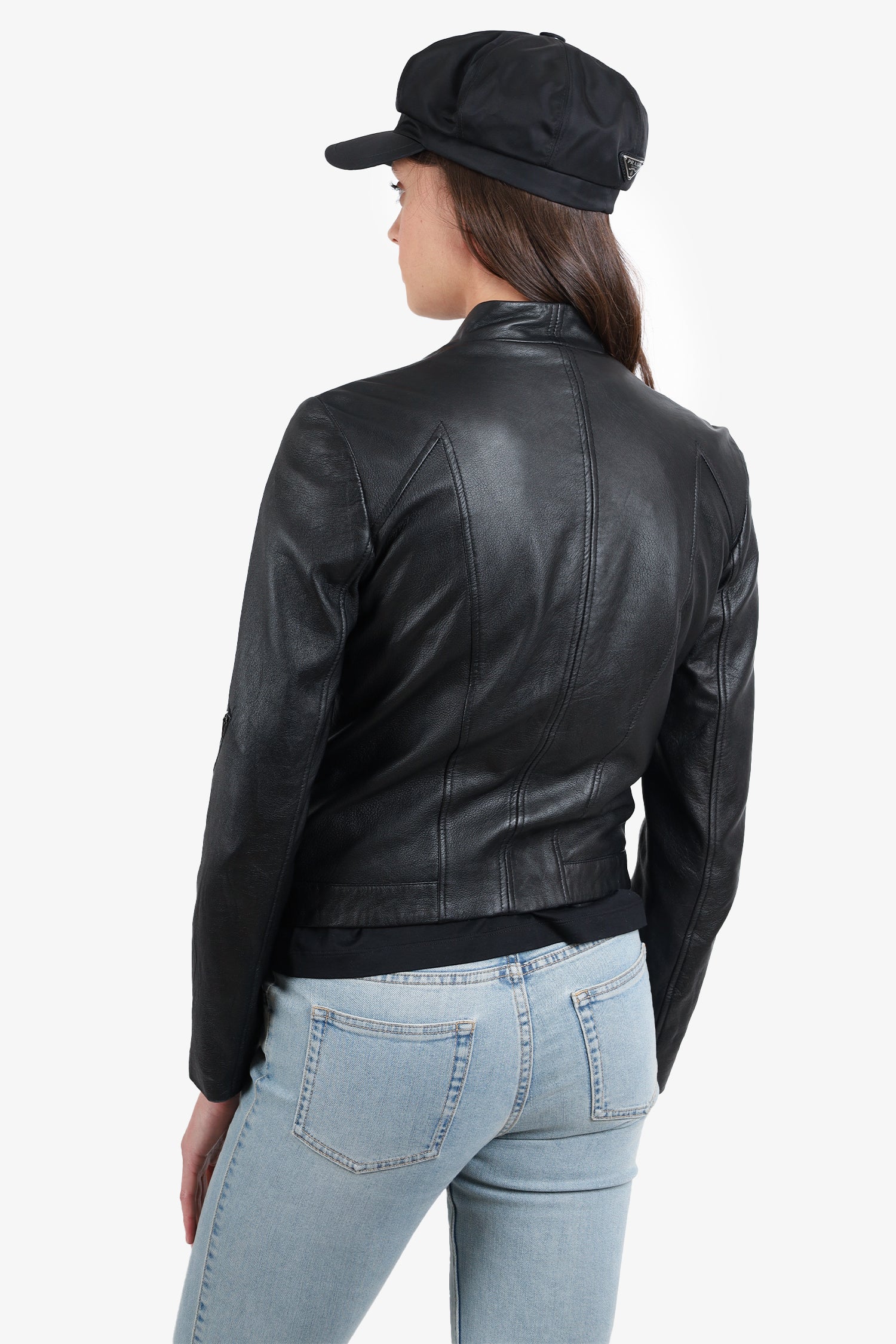 Refresh availabilityHelmut Lang Black Lamb Leather Jacket. Waterfall lapel. Front zip closure. Two front slip pockets one zip pocket on left sleeve. Lined. Tonal stitching.