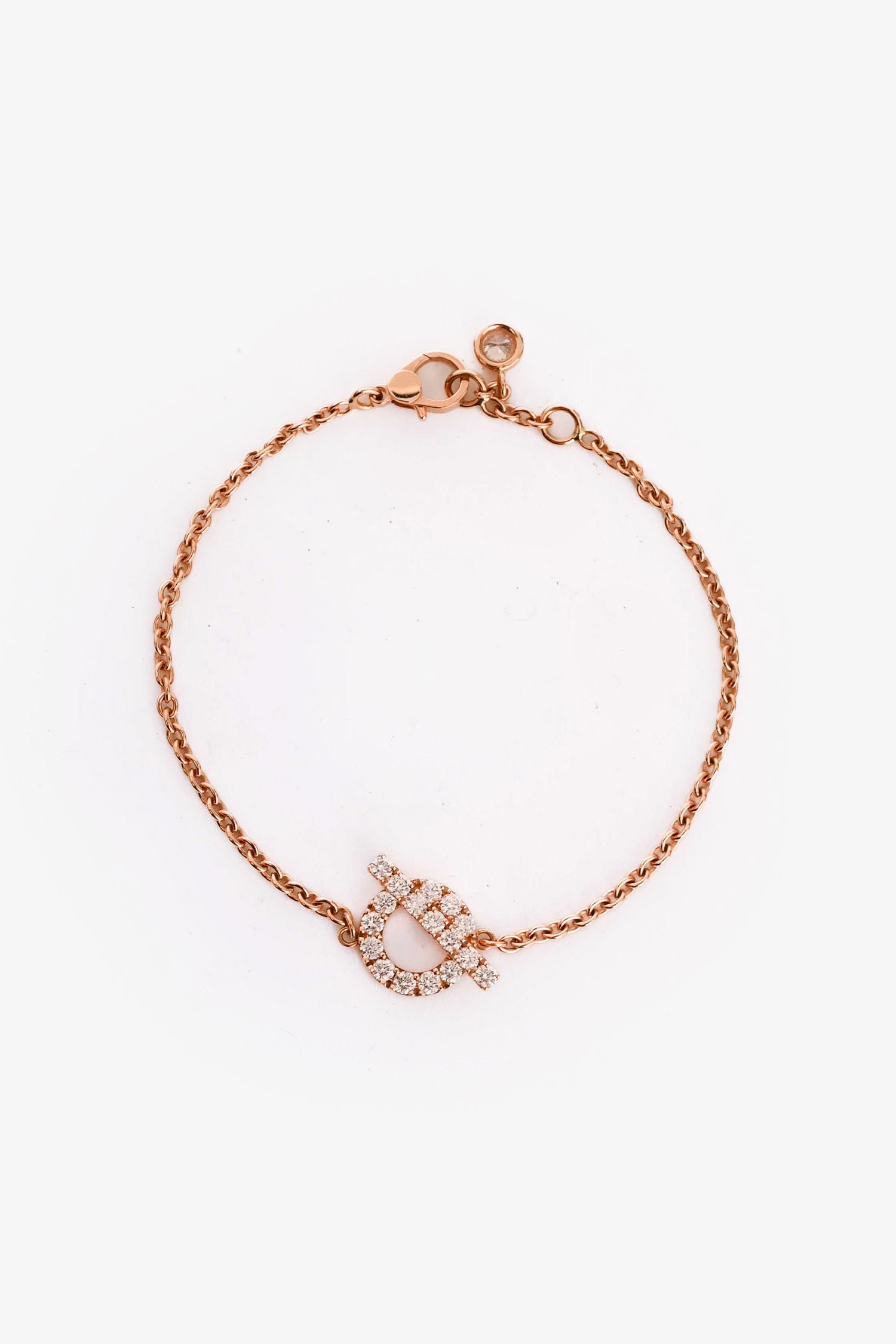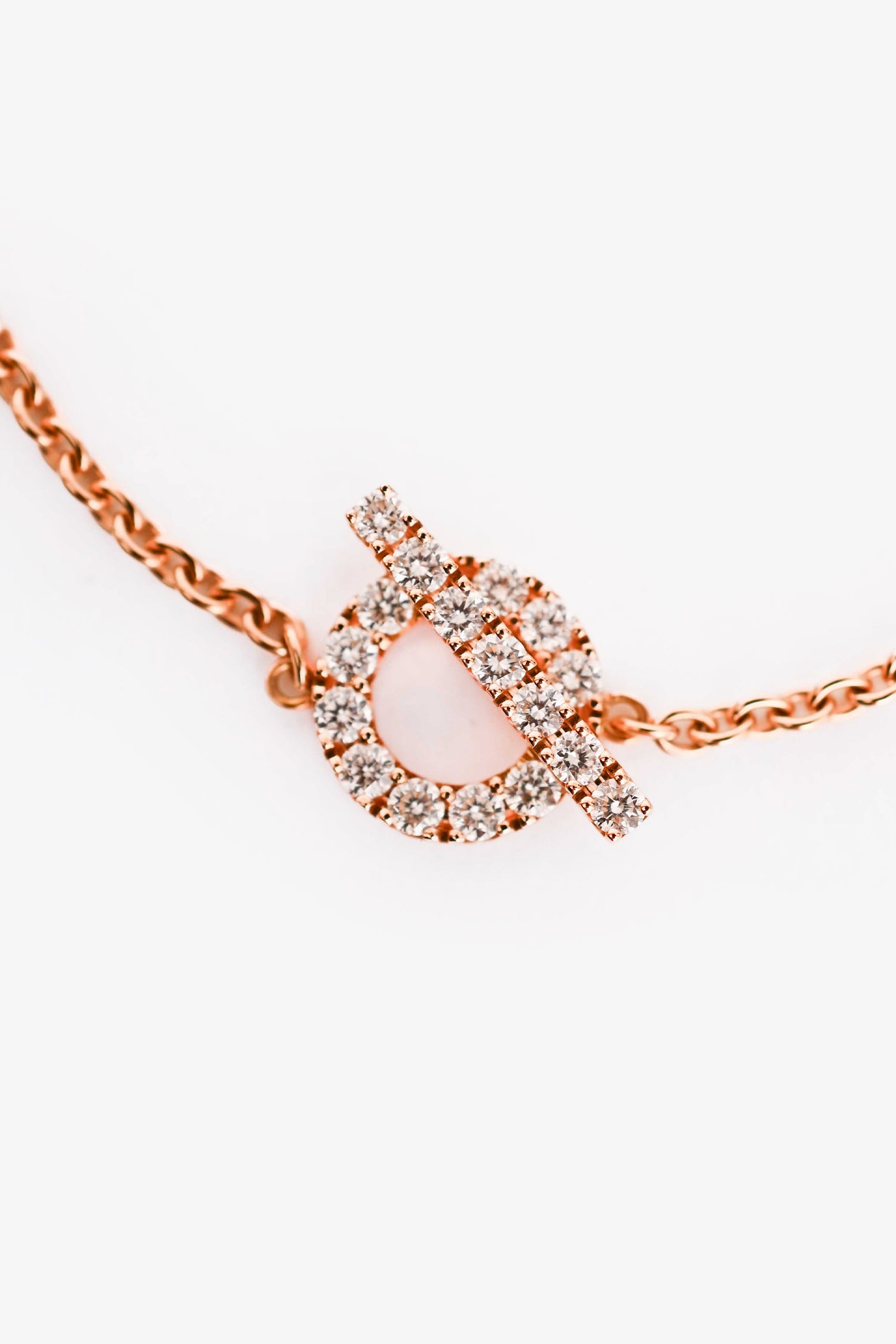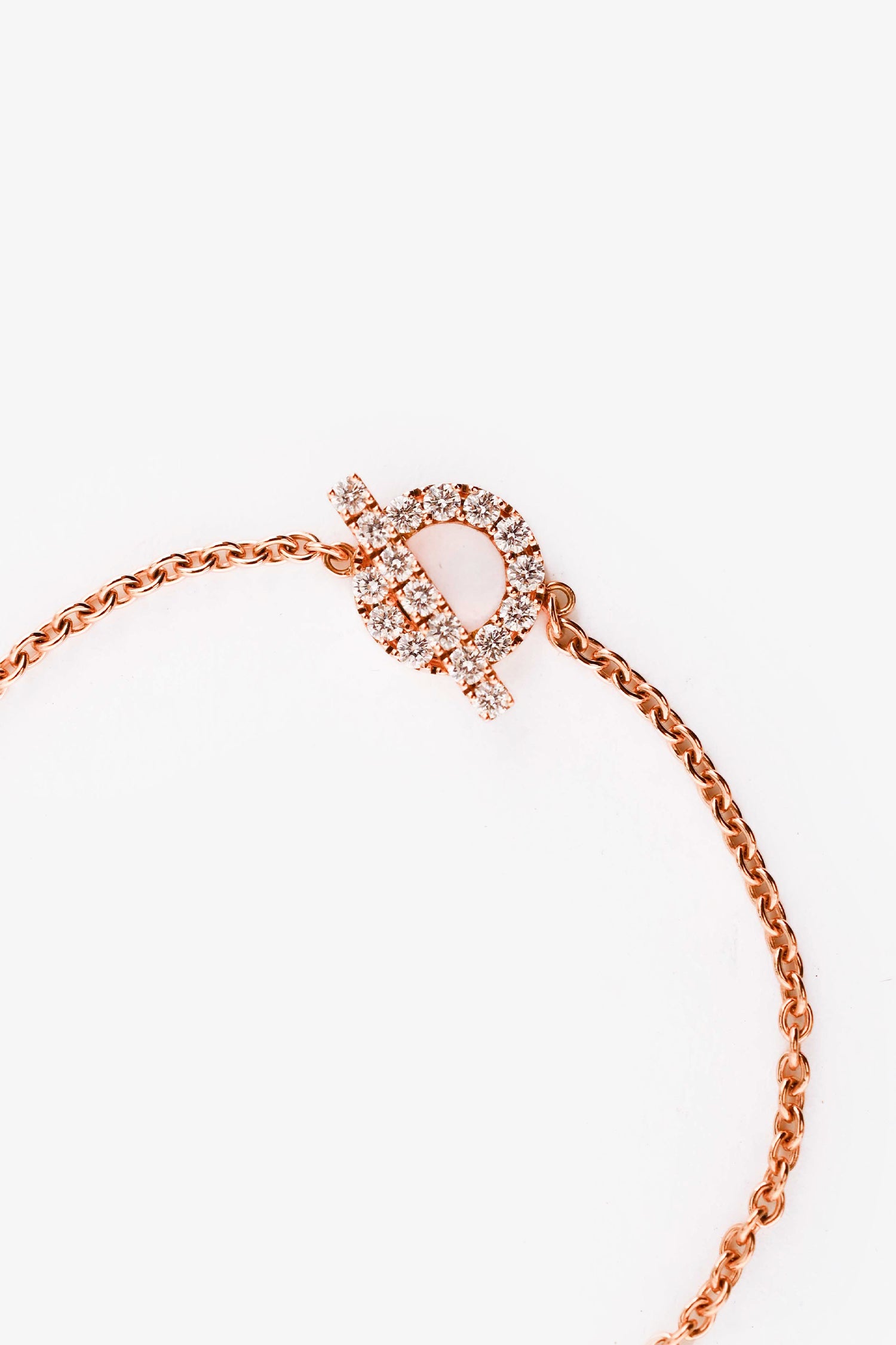 Refresh availabilityHermès 18K Rose Gold Diamond Set Finesse Bracelet. 18 round, brilliant cut diamonds. Diamond encrusted open circle with a bar. Rose gold hardware. Lobster clasp closure.