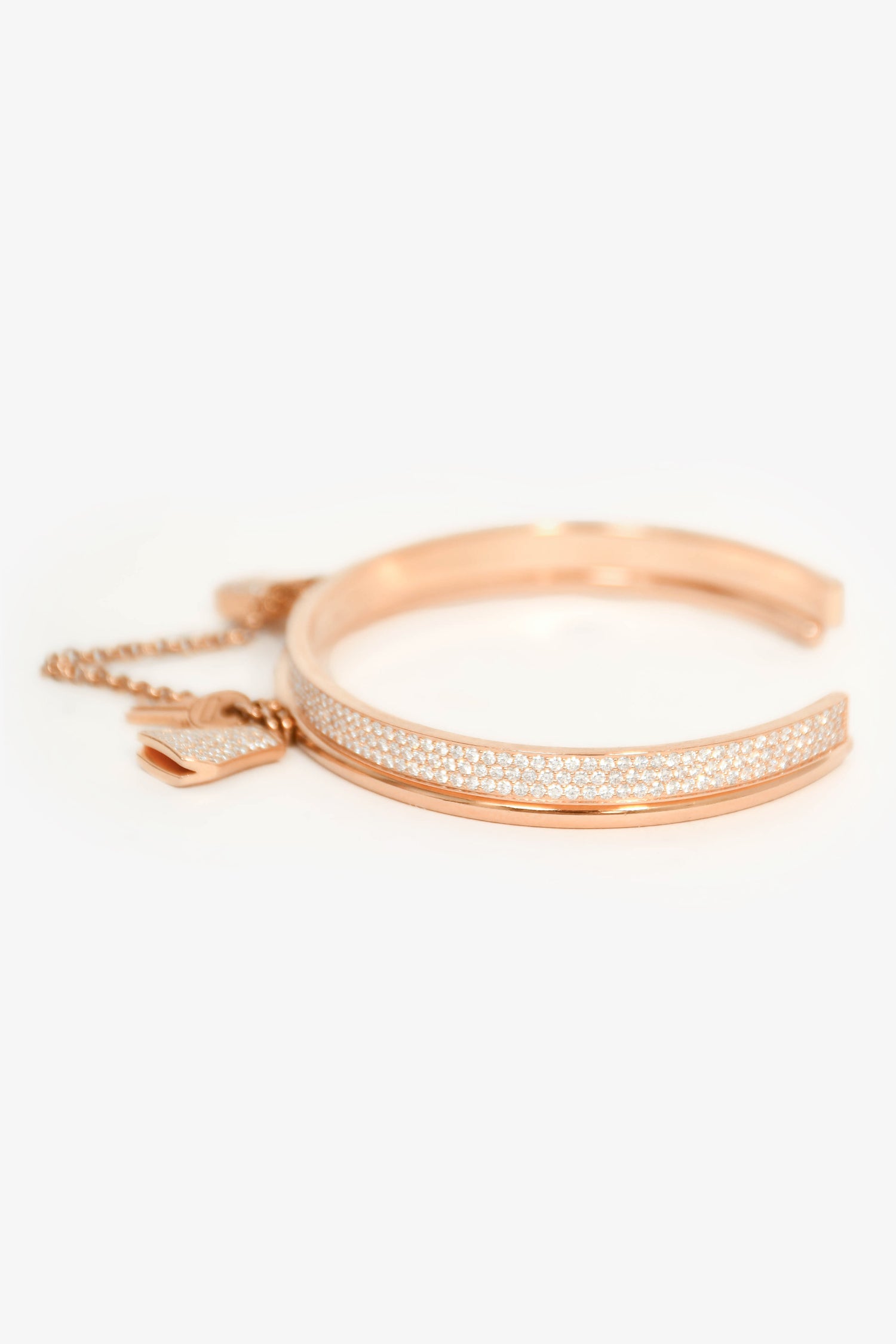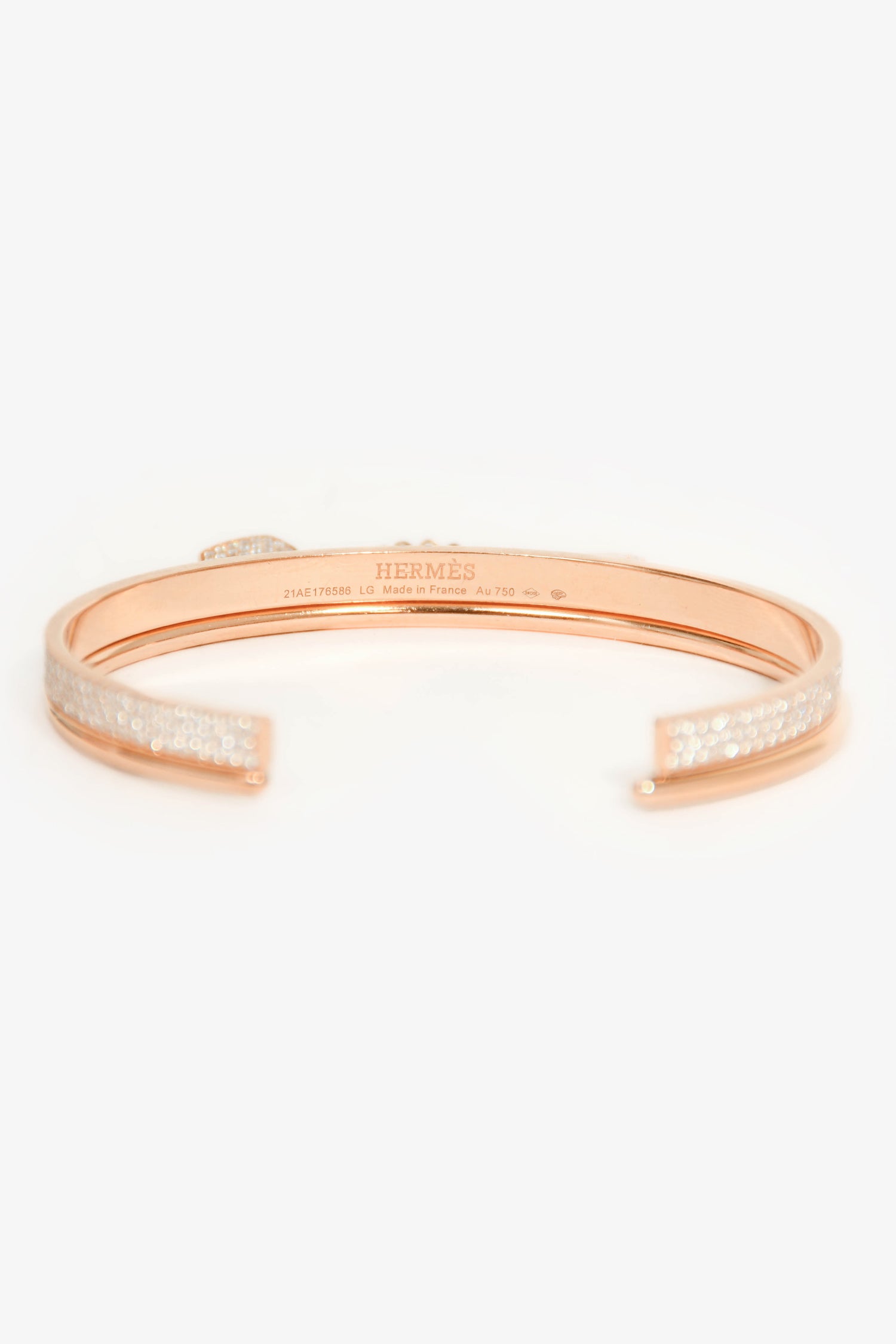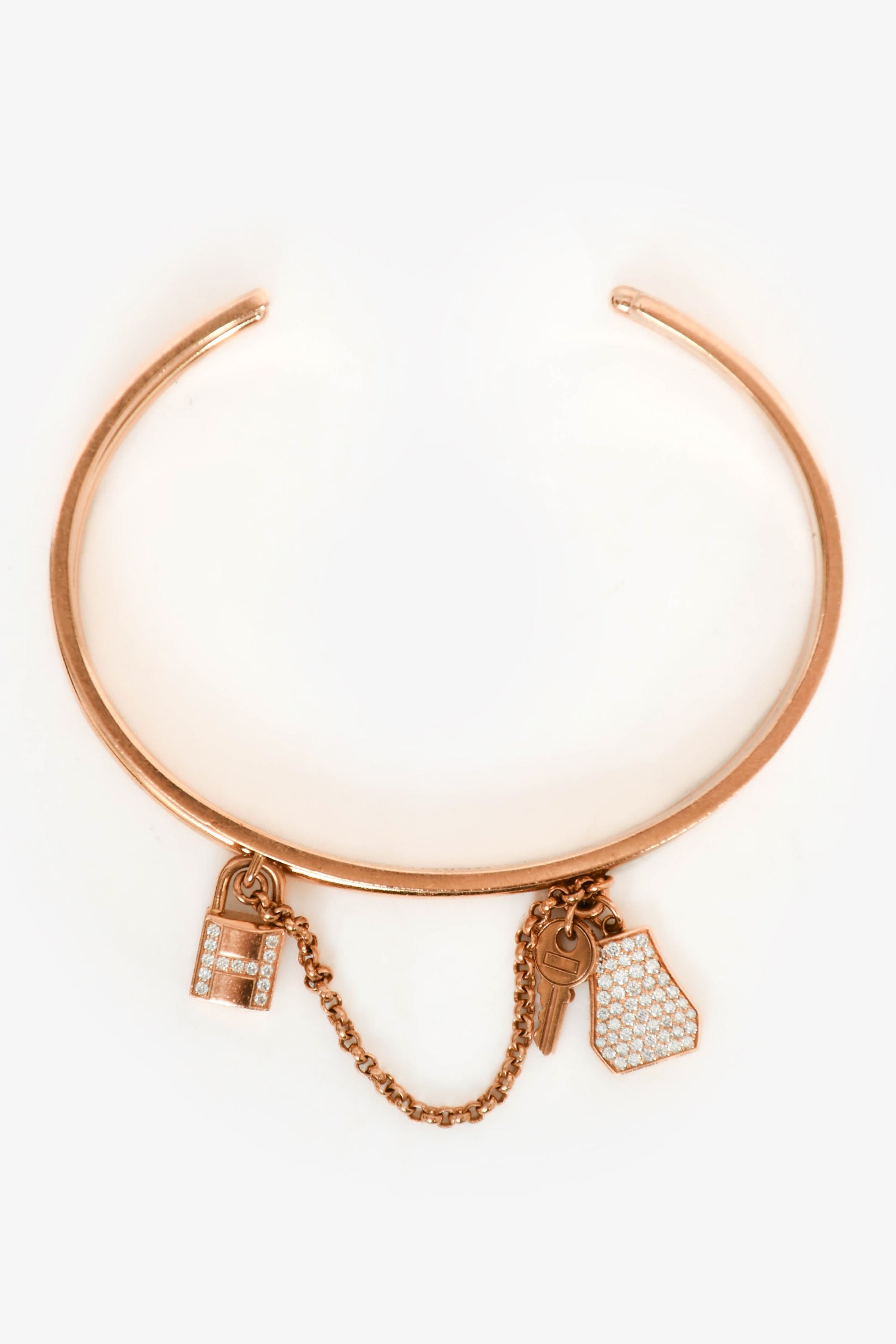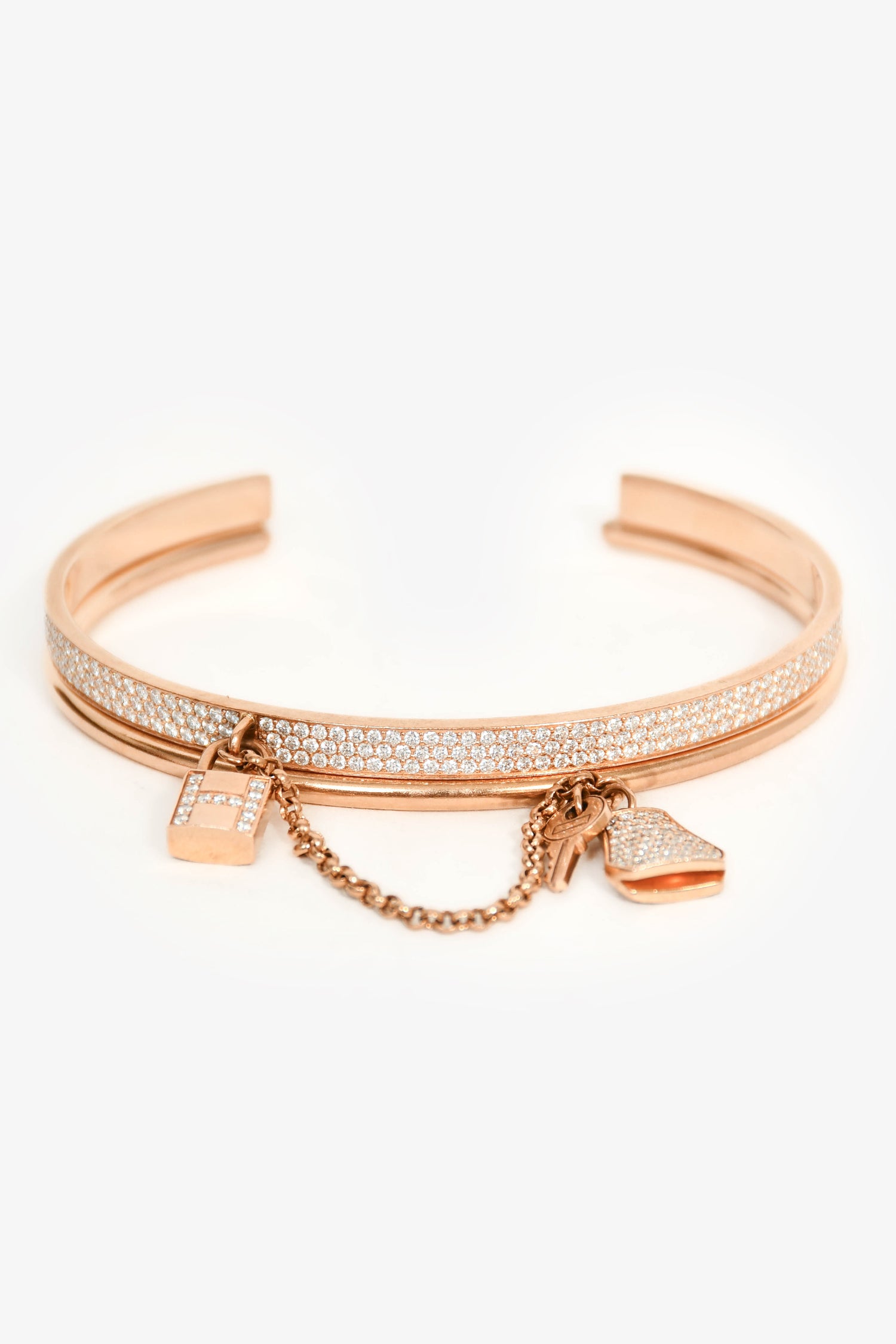 Refresh availabilityHermès 18K Rose Gold Diamonds Kelly Cadenas Double Bracelet Small Model. 18K Rose gold cuff. Attached chain-link. Encrusted diamonds on band. 3 charms: Purse, clochette, and key.